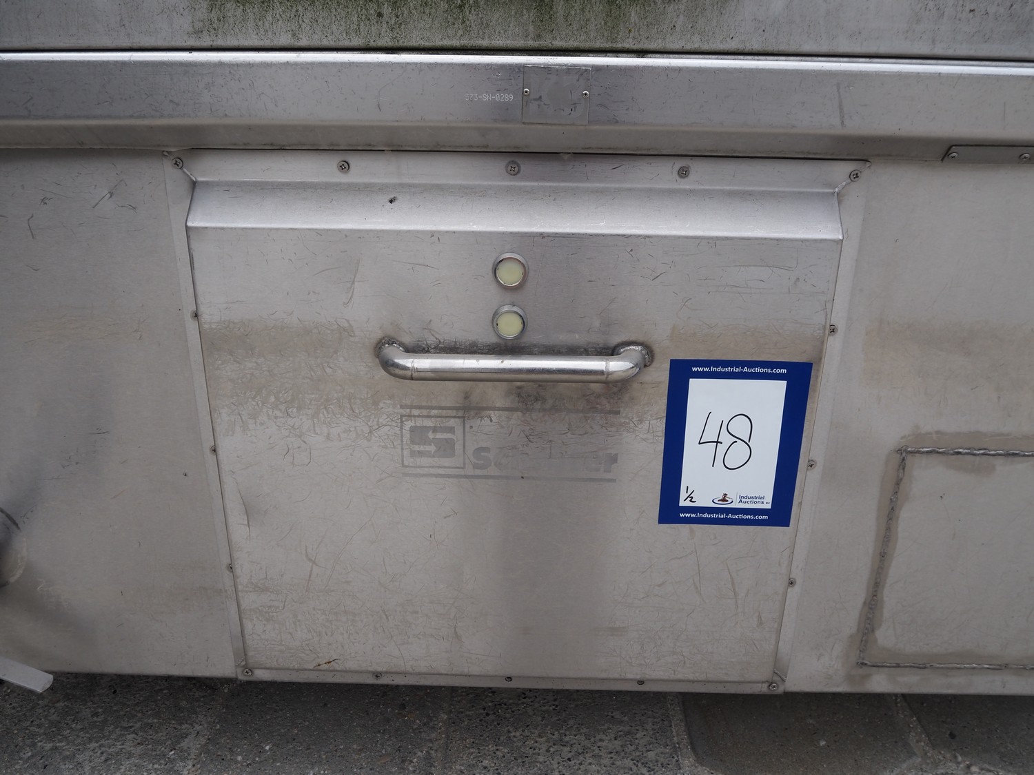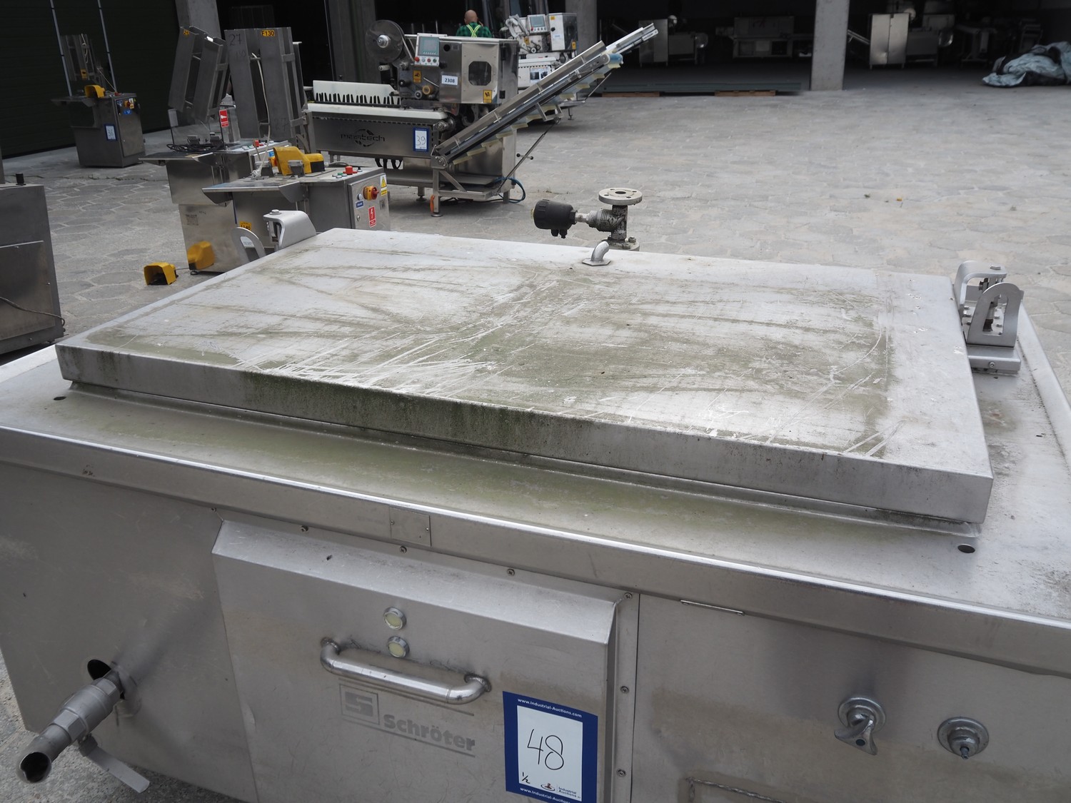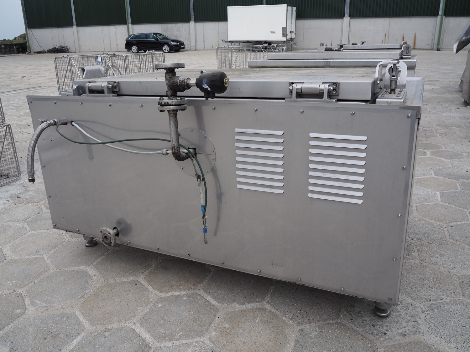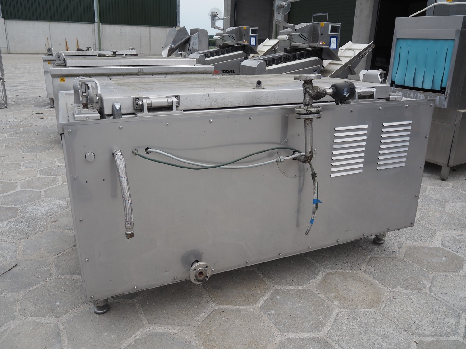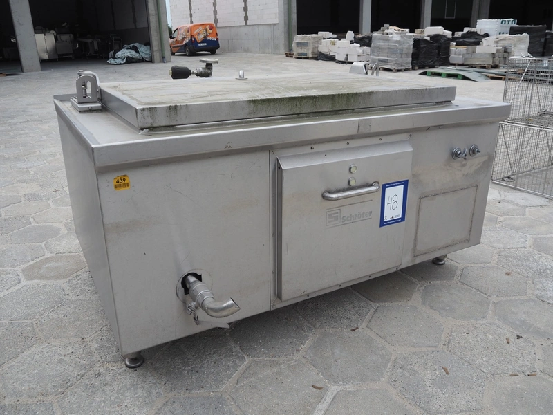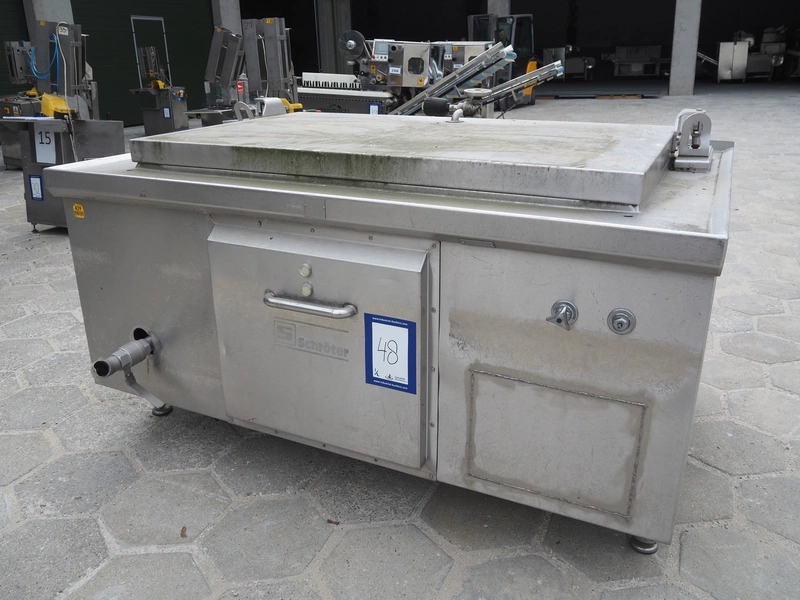 Schröter cooking vessel, inside dimensions: 1490 mm x 900 mm x 550 mm, total dimensions: 1900 mm x 1600 mm x 1120 mm. Including baskets, dimensions basket: (2x) 1340 mm x 690 mm x 520 mm.