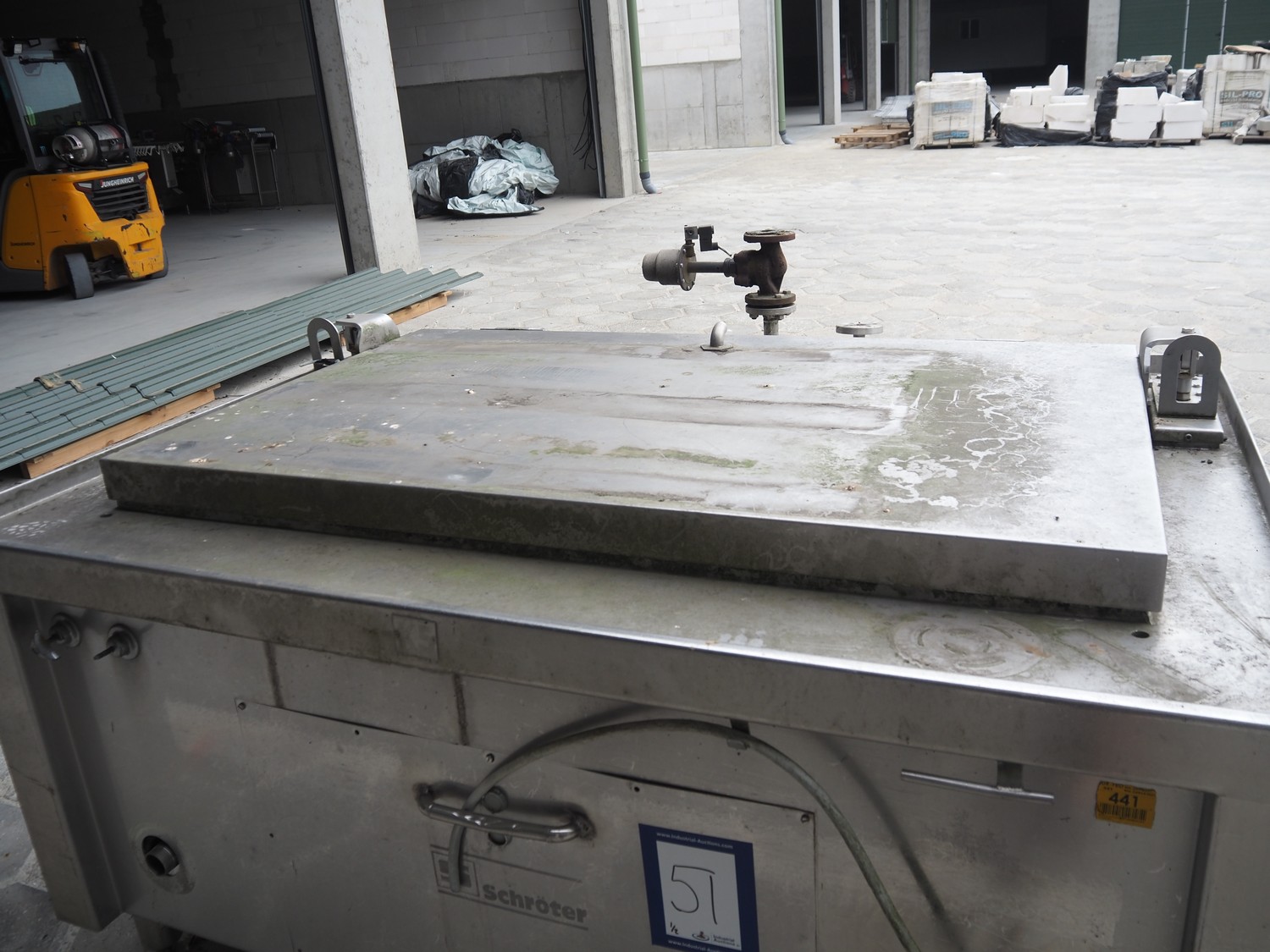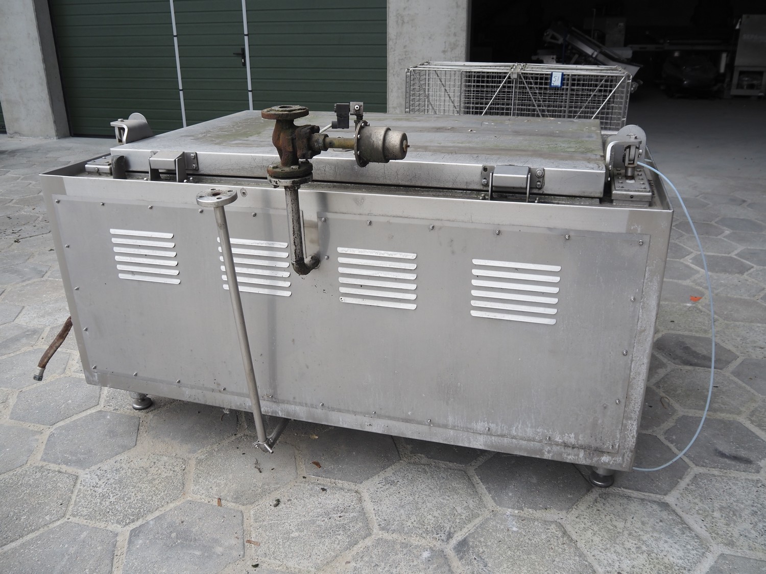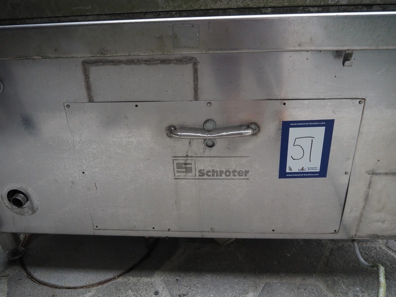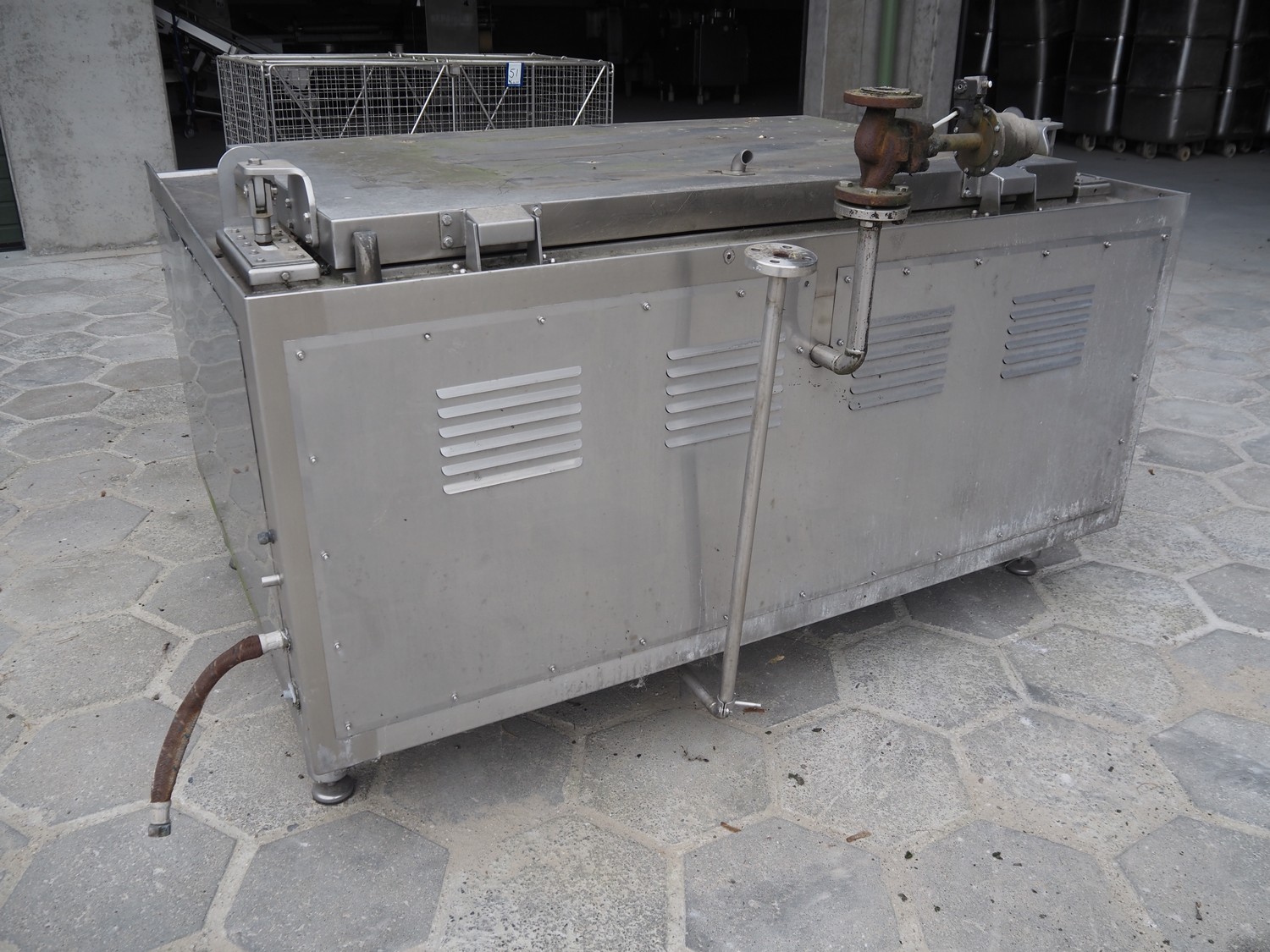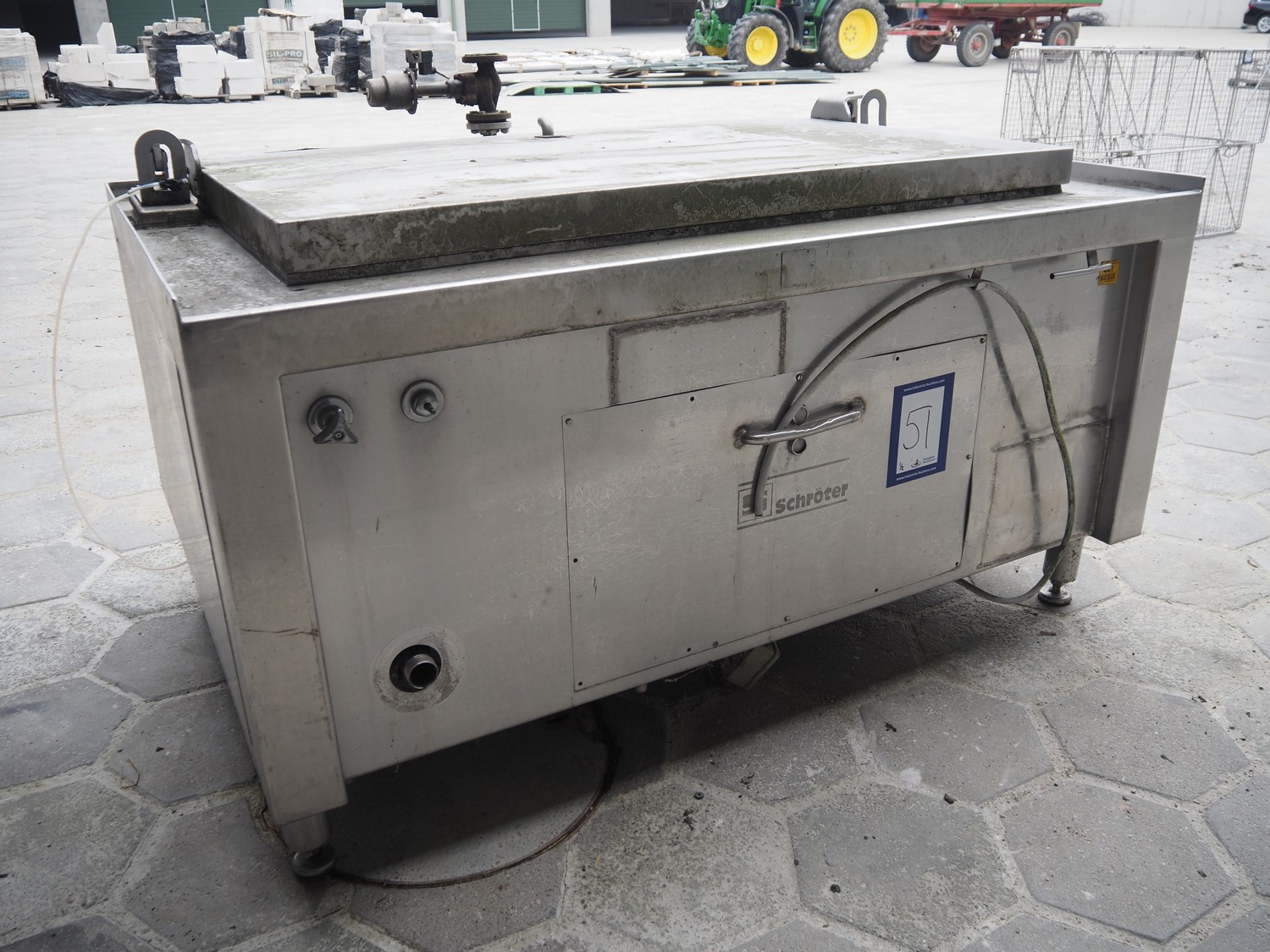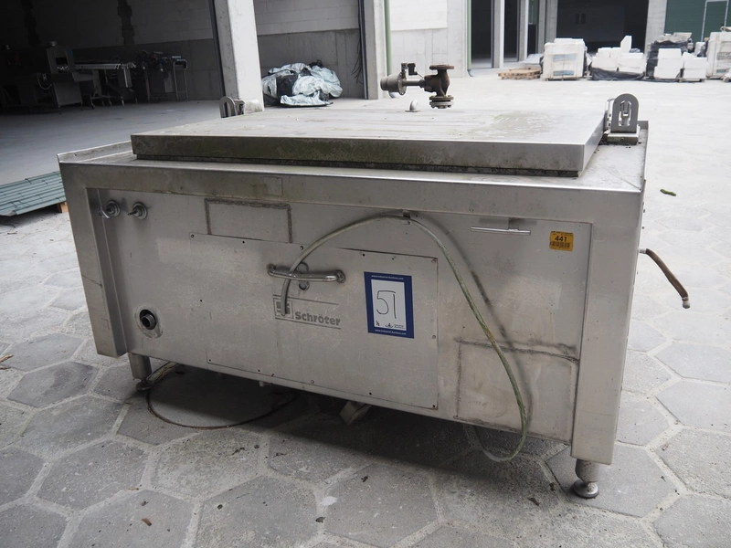 Schröter cooking vessel, inside dimensions: 1490 mm x 900 mm x 550 mm, total dimensions: 1850 mm x 1430 mm x 1210 mm. With 2 s/s baskets.