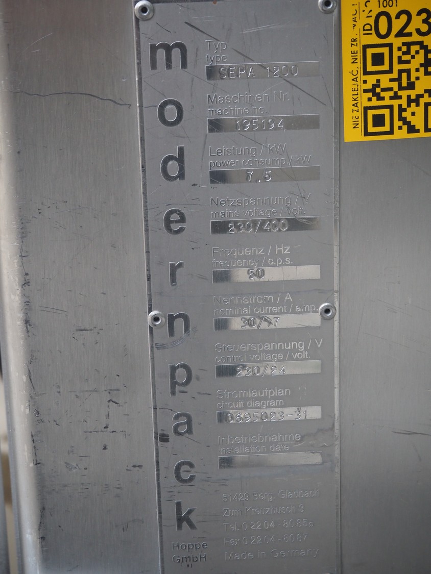 Sepamatic separator with infeed hopper, type: SEPA 1200, serial number: 195194, 230/400 V, 50 Hz, 30/17 A, 7,5 kW, diameter drum: Ø 295 mm, perforations: 5 mm, total dimensions: 1450 mm x 1160 mm x 2050 mm.