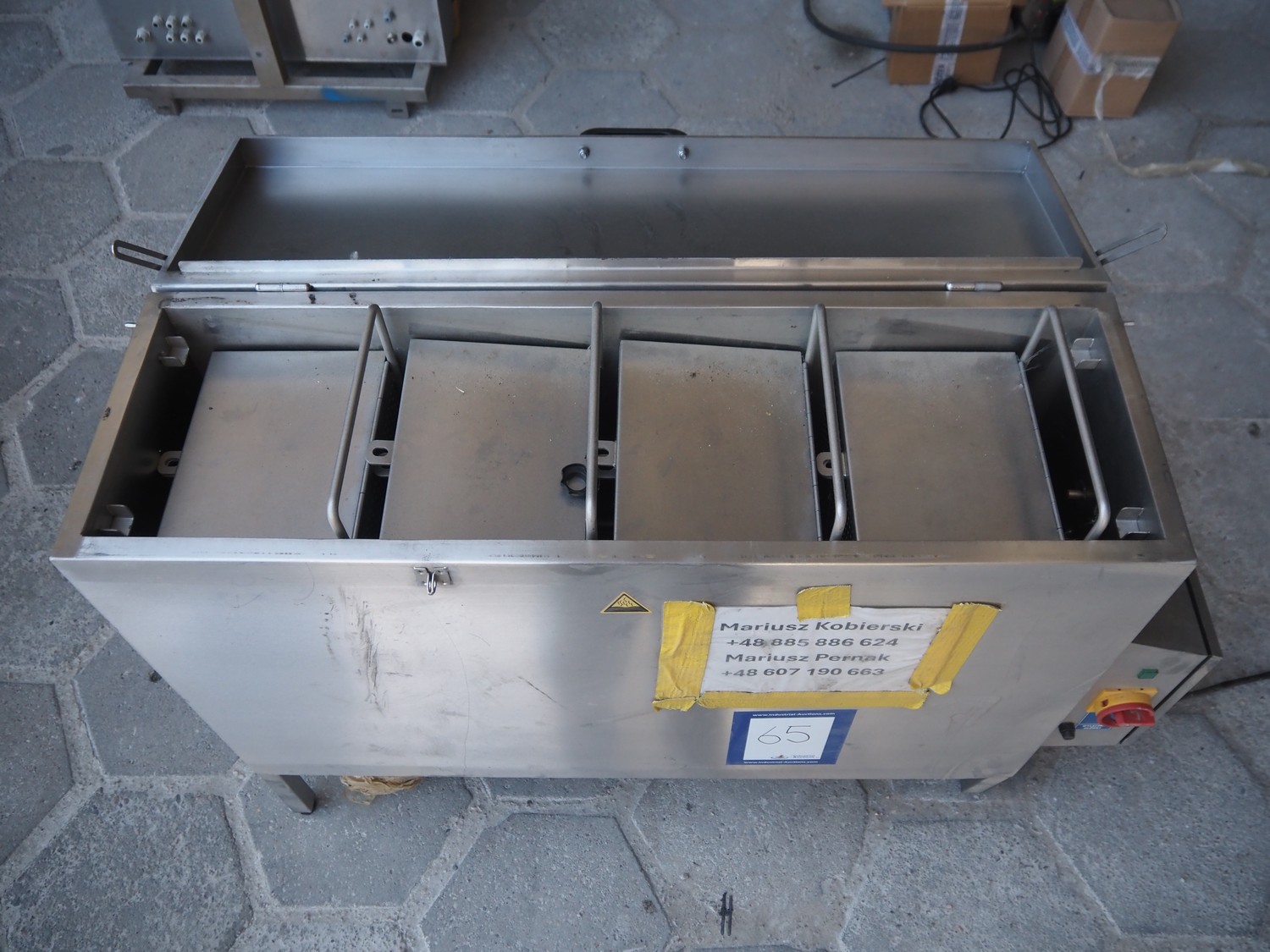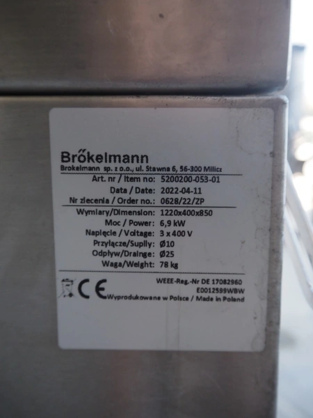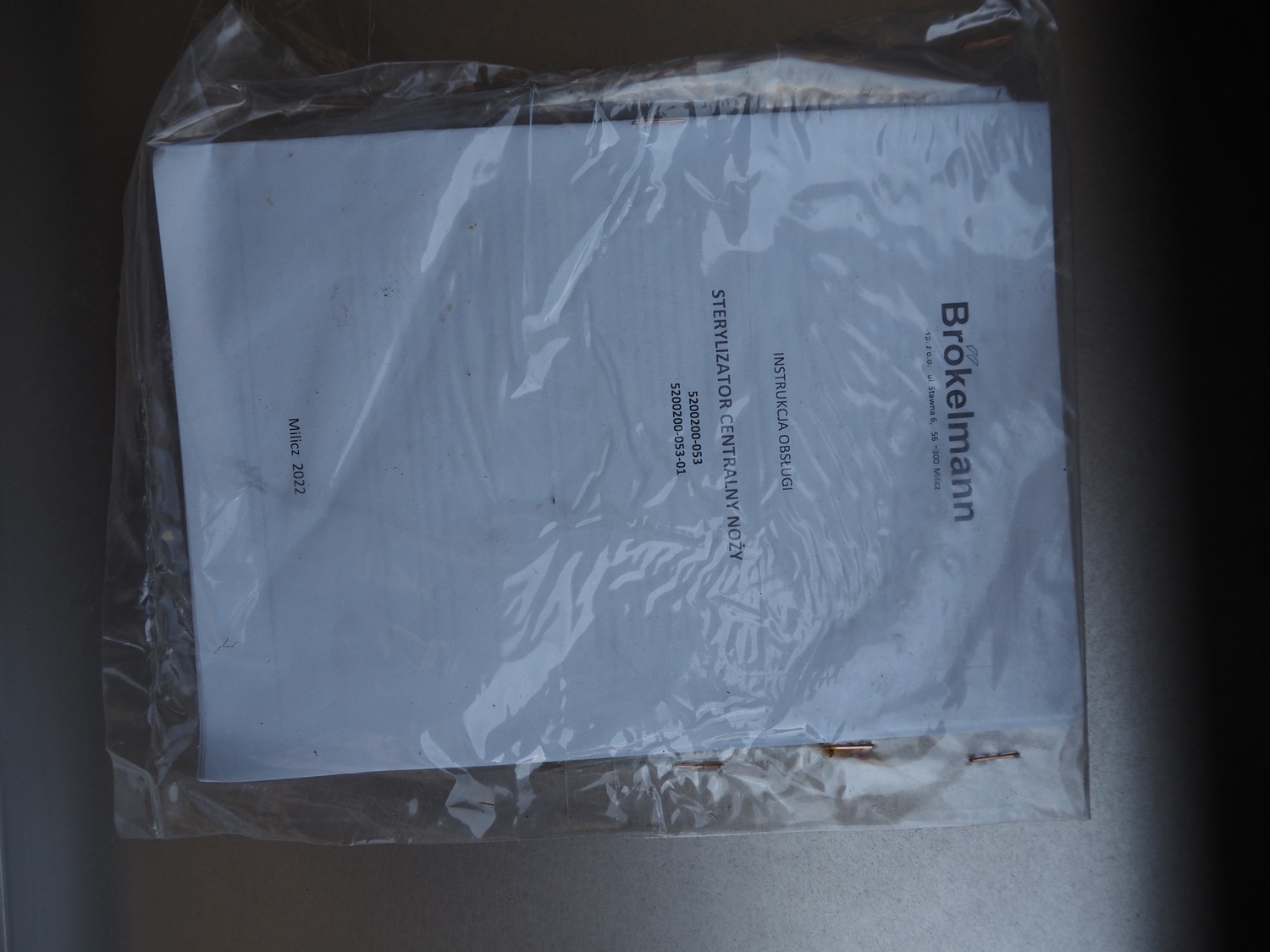 Brökelmann sterilizer, serial number: 5200200-053-01, 3x400 V, 6,9 kW, weight: 78 kg, basket dimensions: (4x) 265 mm x 190 mm x 350 mm, total dimensions: 1220 mm x 400 mm x 850 mm.