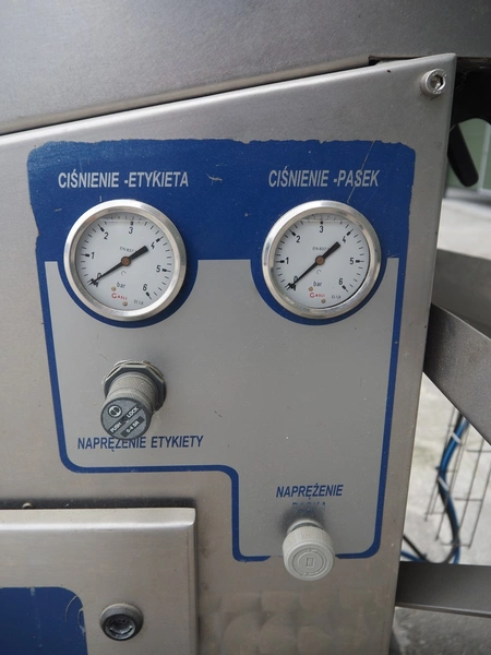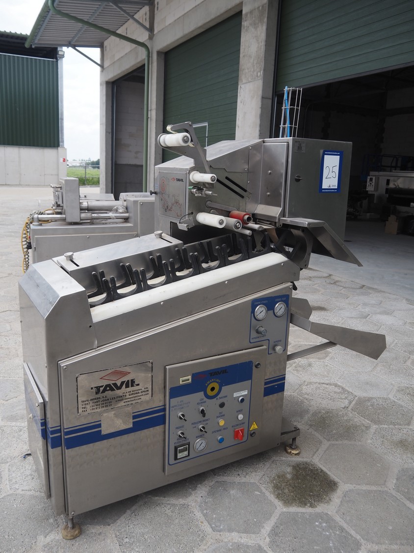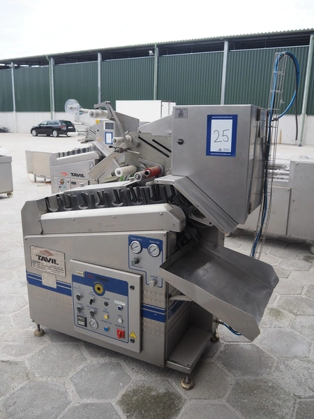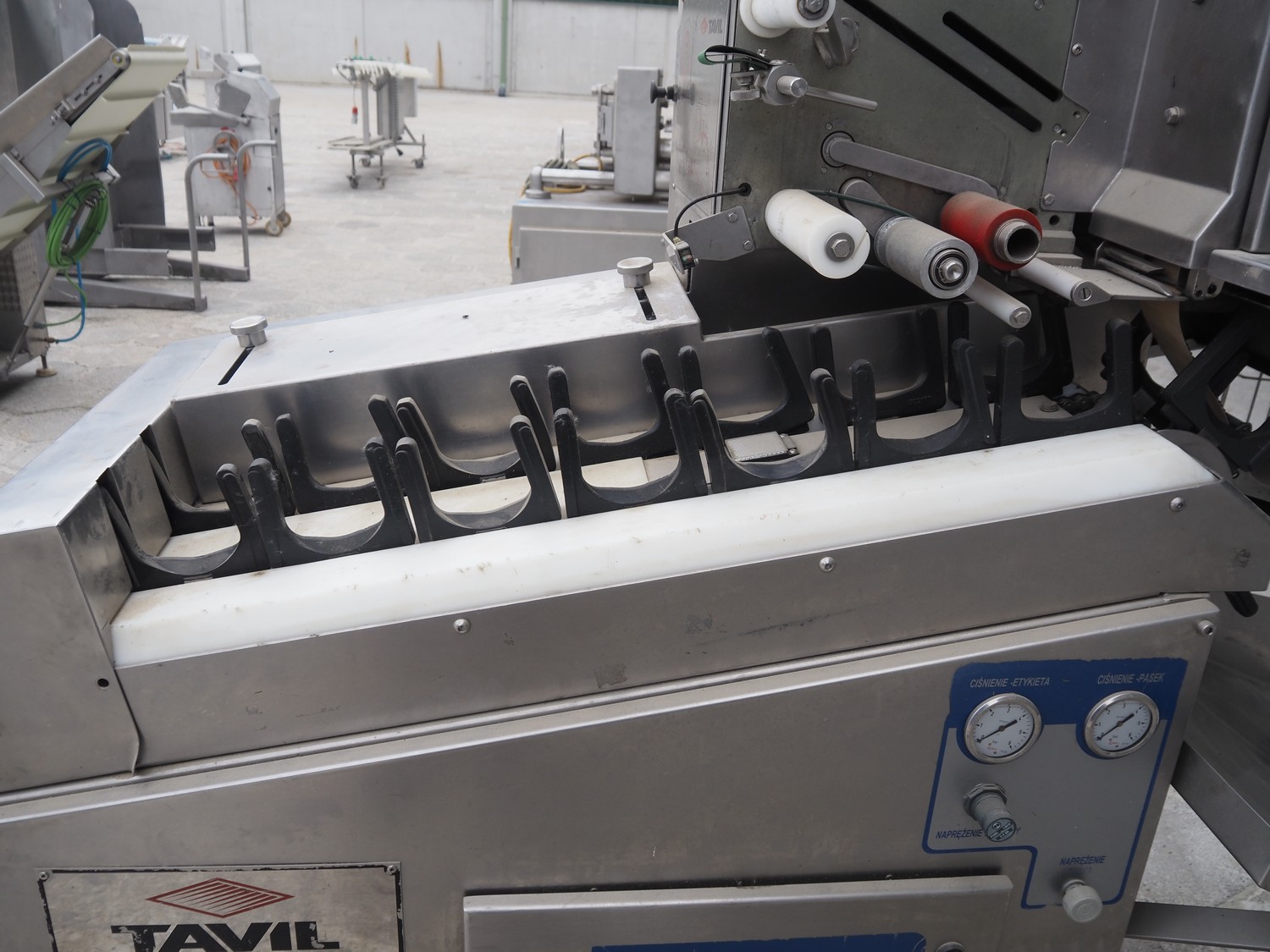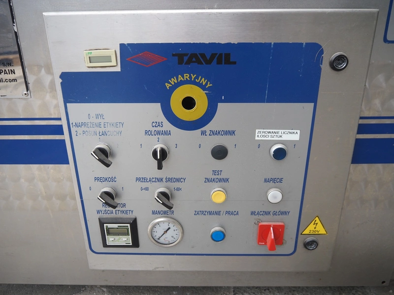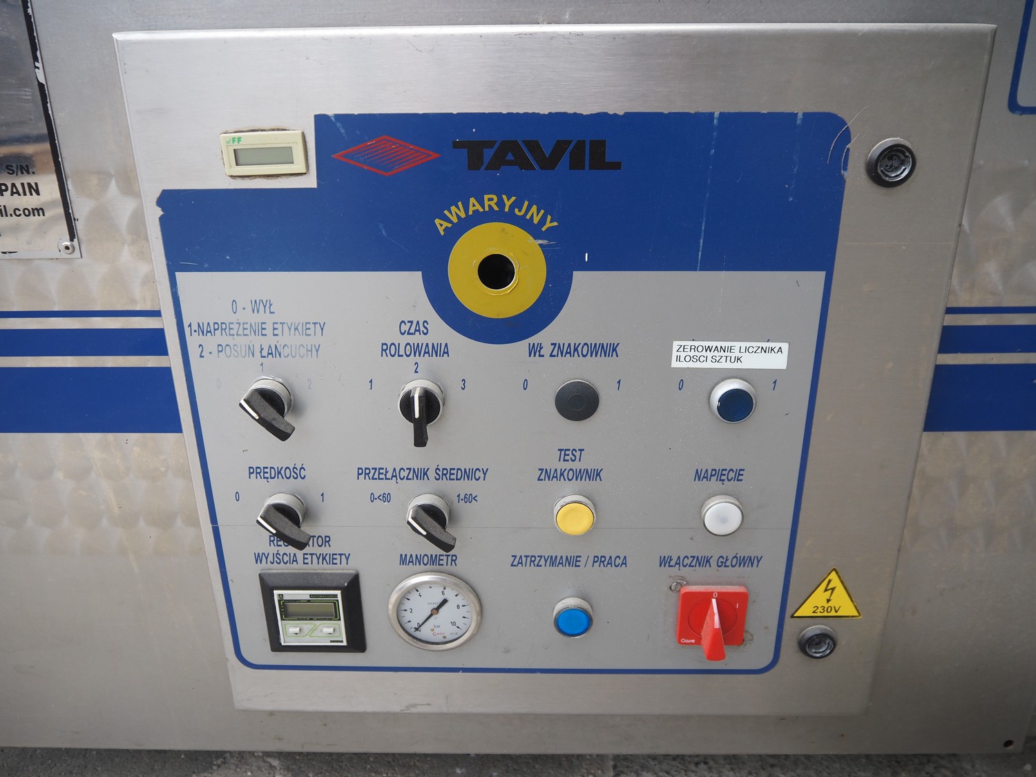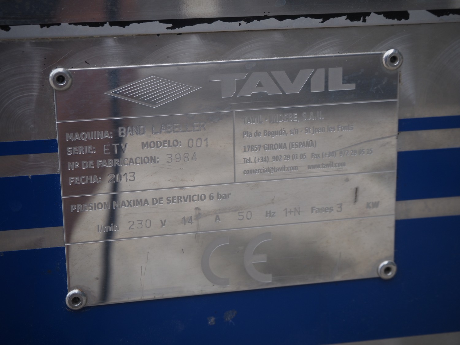 Tavil labelling machine, type: ETV, serial number: 3984, year of construction: 2013, 230 V, 1 Ph, 50 Hz, 14 A, 3 kW, dimensions: 1650 mm x 800 mm x 1880 mm.