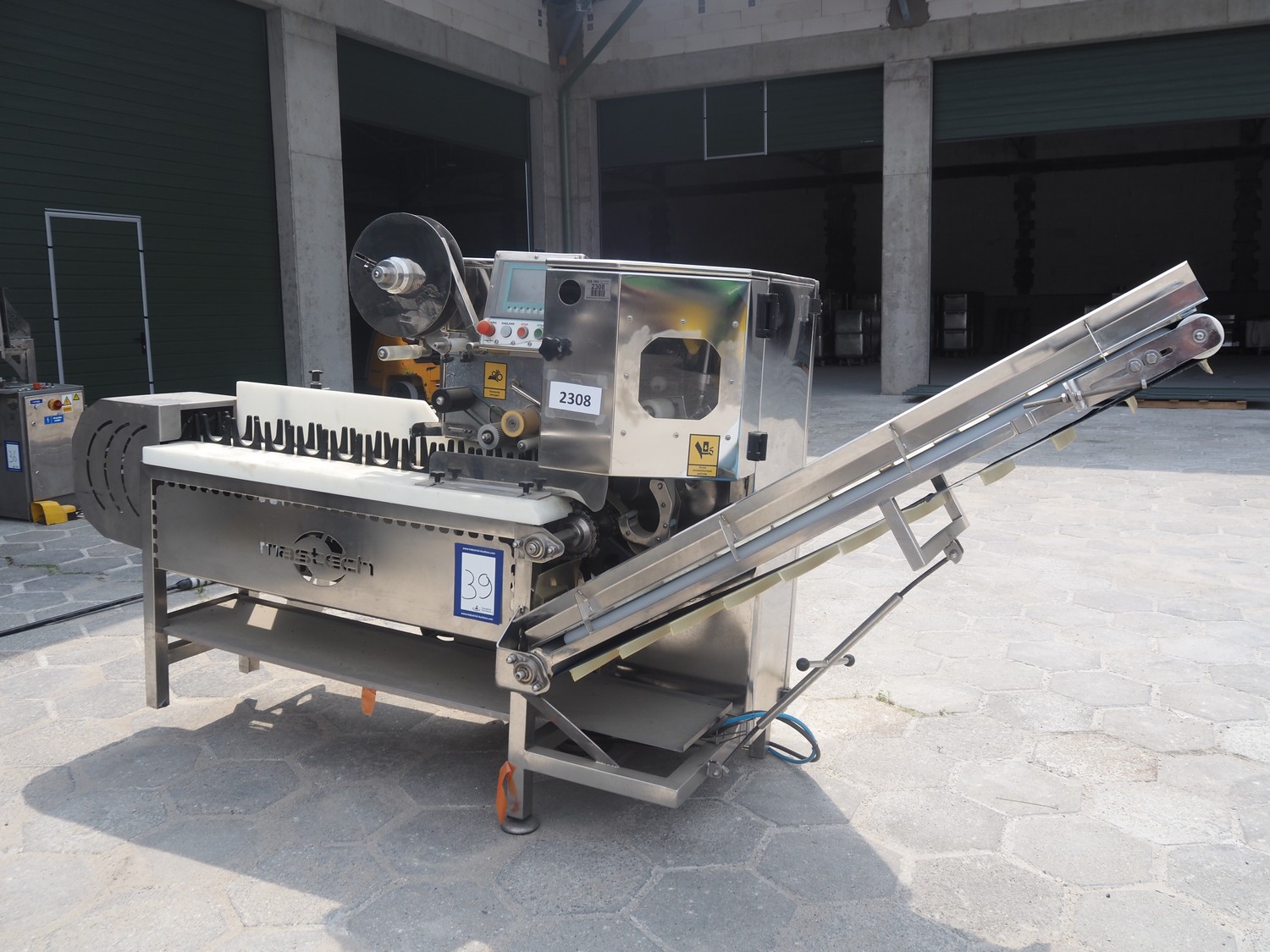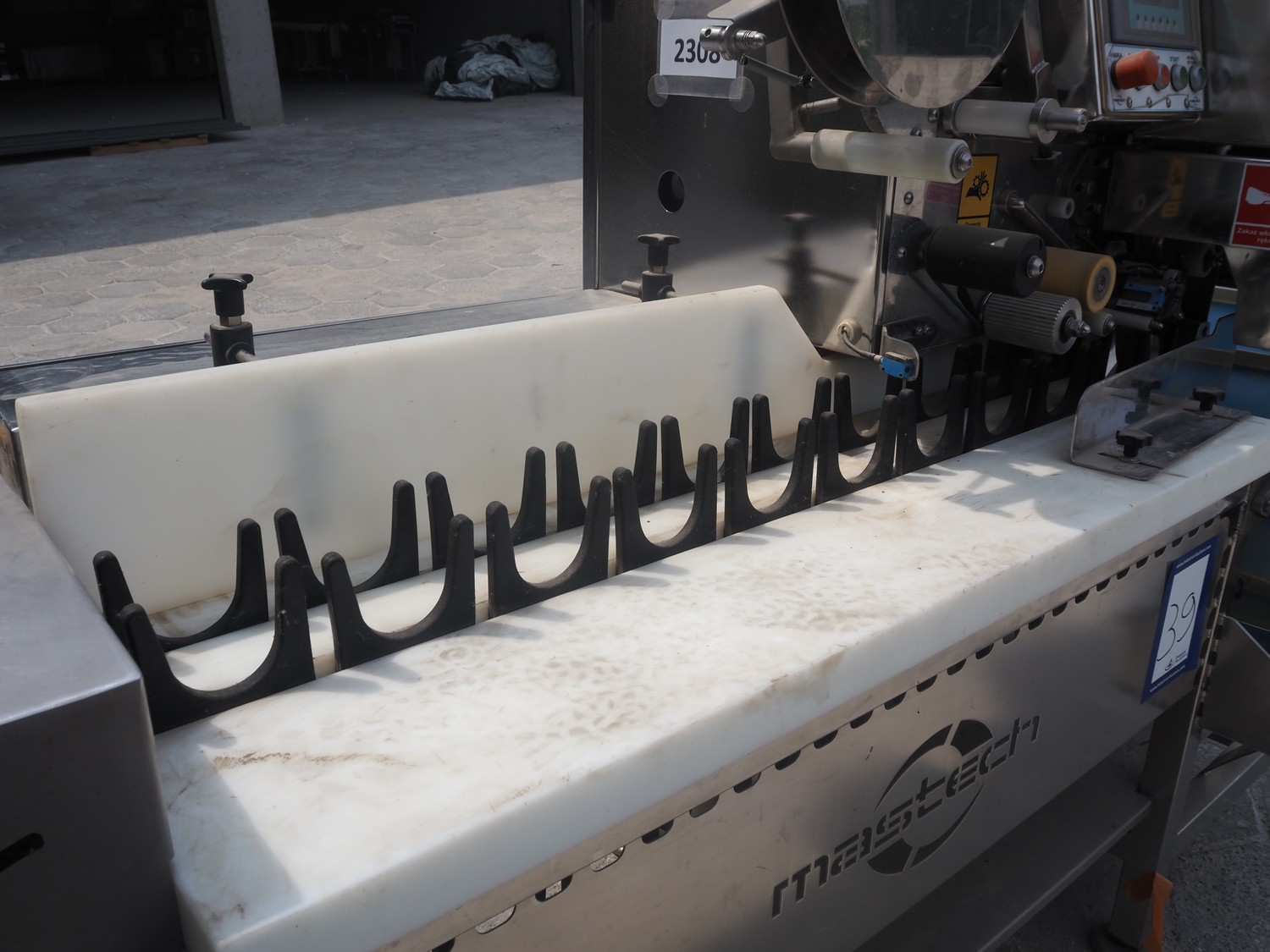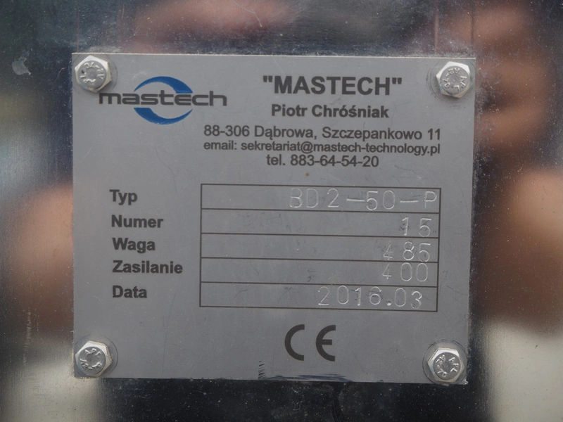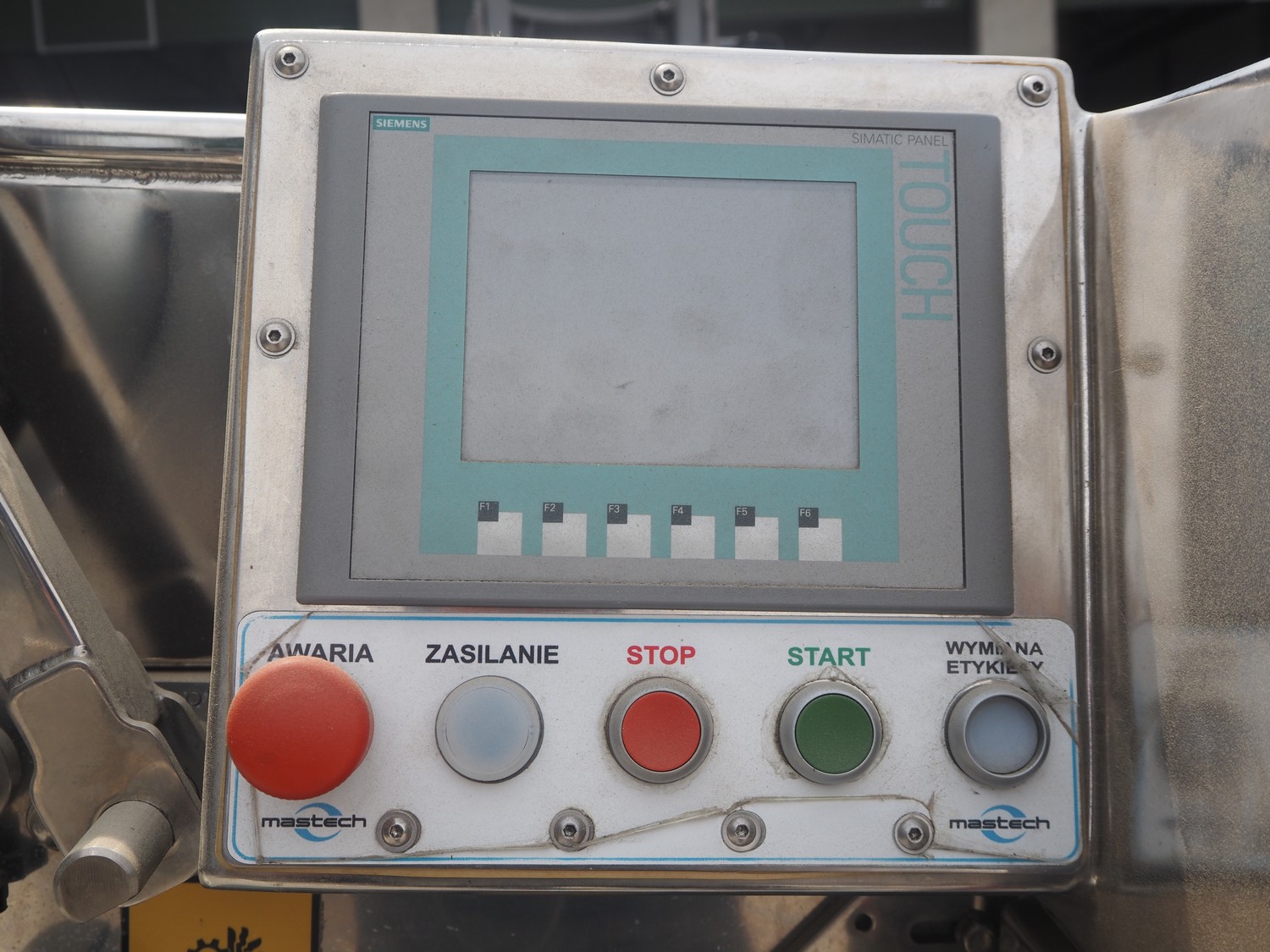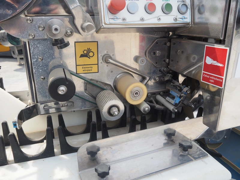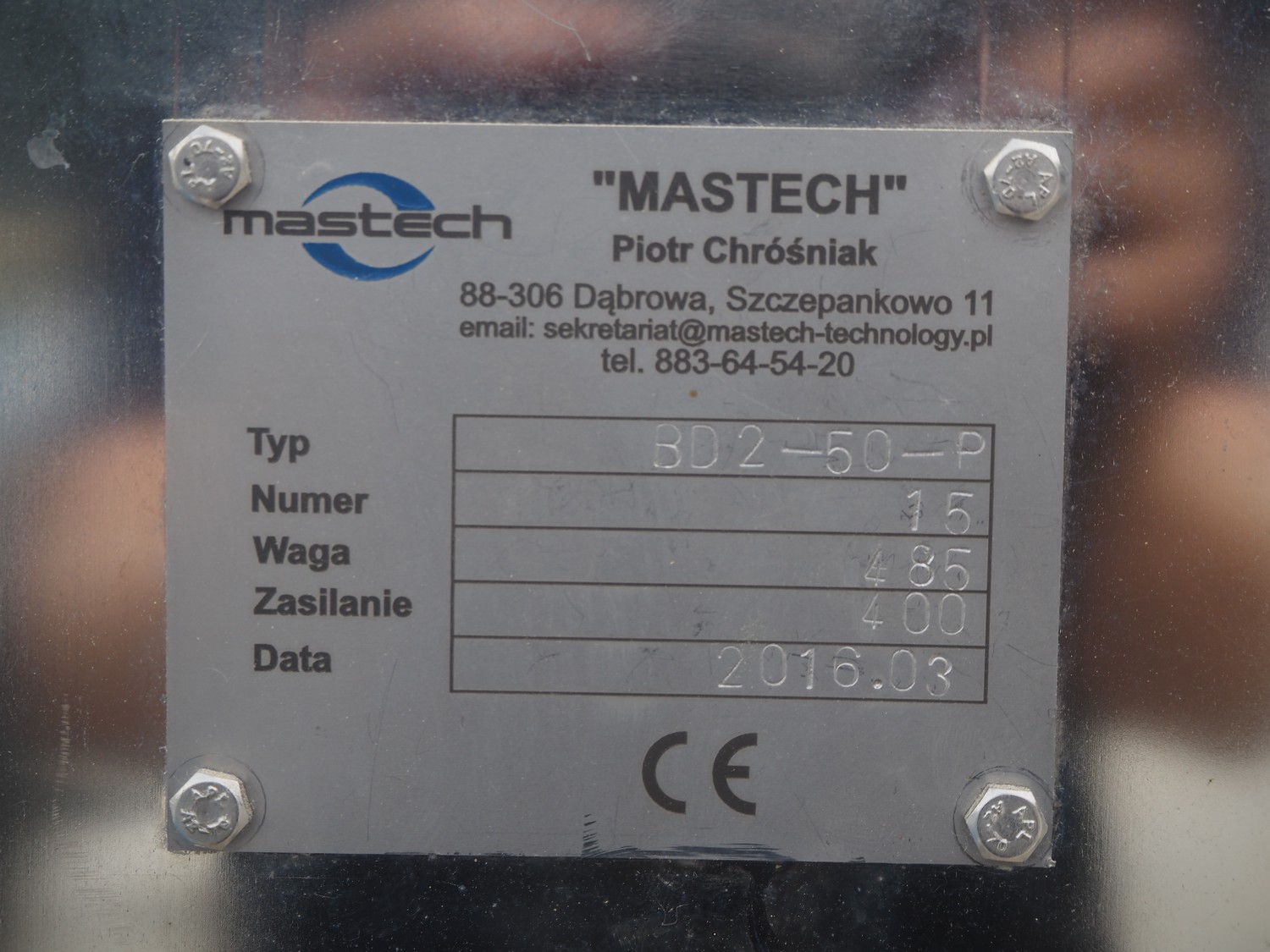 Mastech labelling machine, type: BD2-50-P, serial number: 15, year of construction: 03/2016, 400 V, weight: 485 kg, plastic belt with dividers, belt width: 490 mm, divider height: 25 mm, distance between dividers: 140 mm, total dimensions: 3200 mm x 1000 mm x 1600 mm.