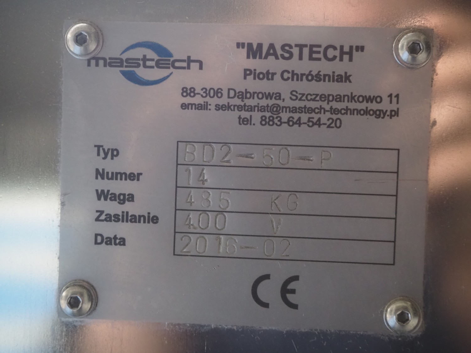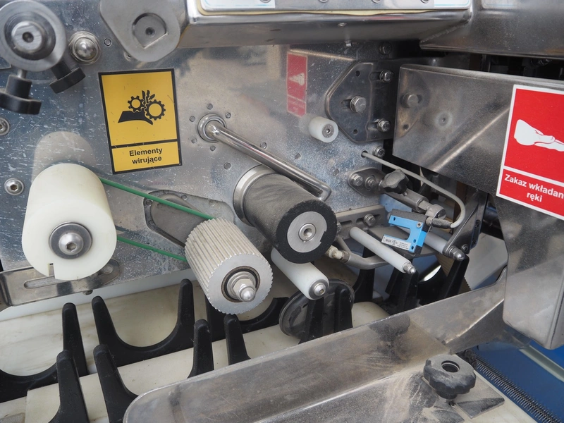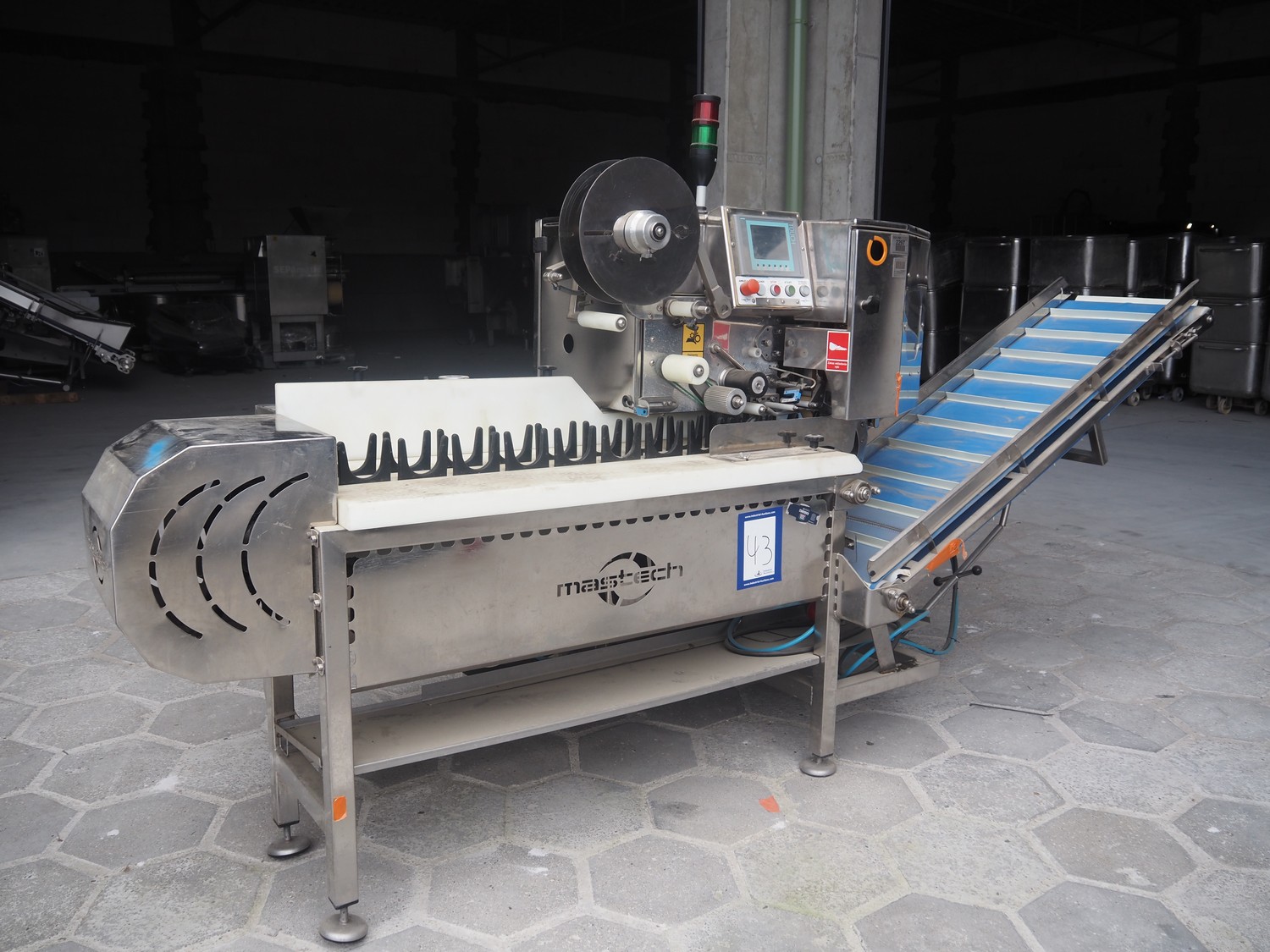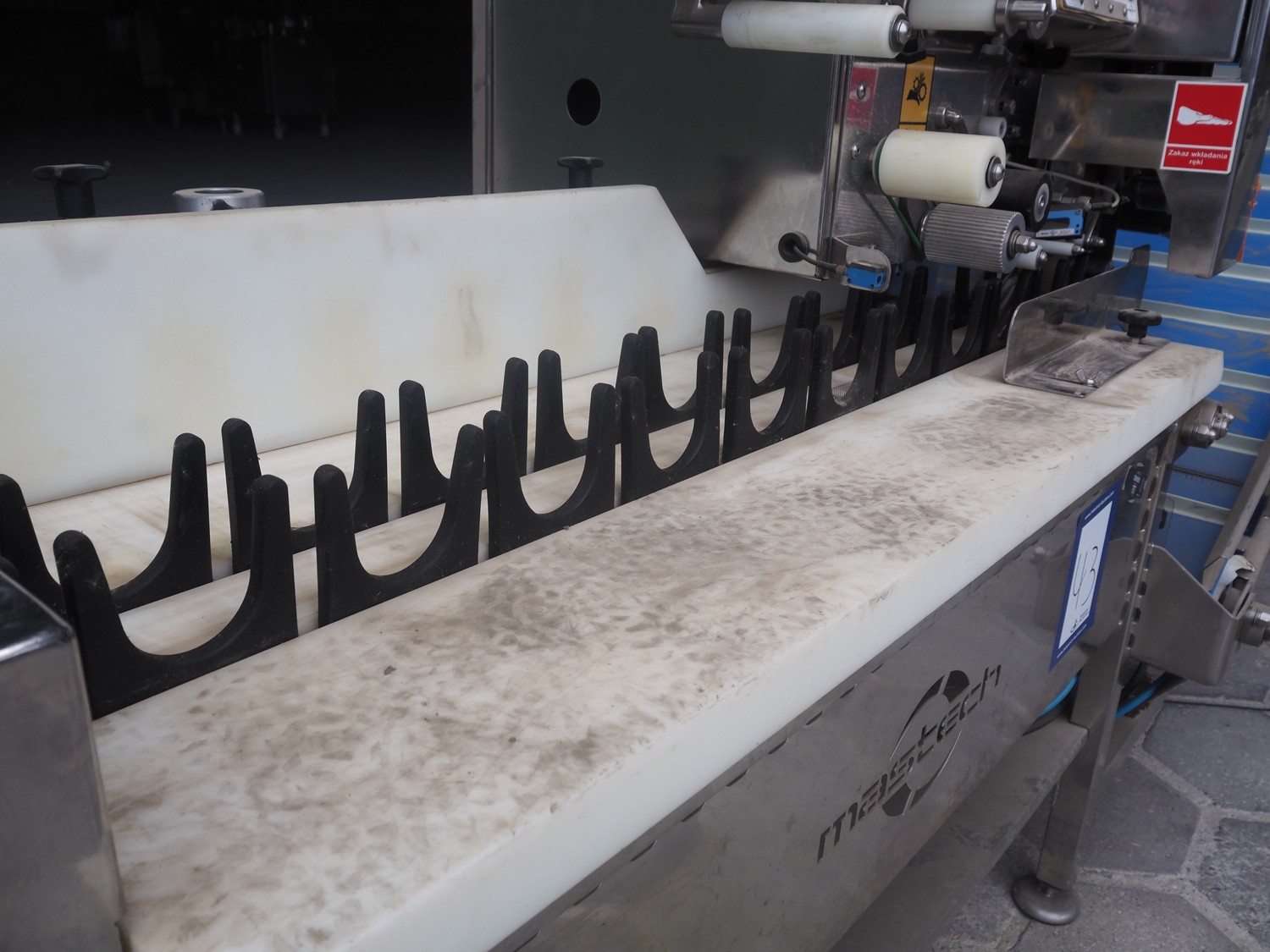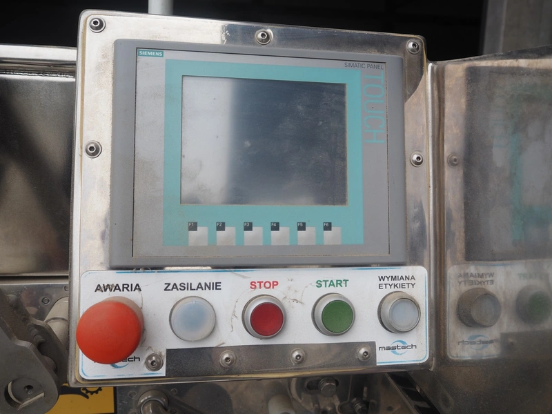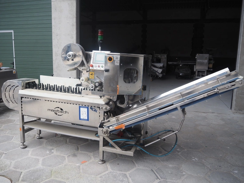 Mastech labelling machine, type: BD2-50-P, serial number: 14, year of construction: 02/2016, 400 V, weight: 485 kg, plastic belt with dividers, belt width: 490 mm, divider height: 30 mm, distance between dividers: 140 mm, total dimensions: 3400 mm x 1000 mm x 1850 mm.