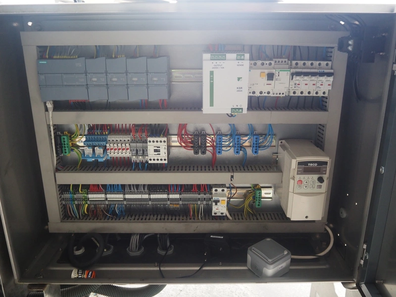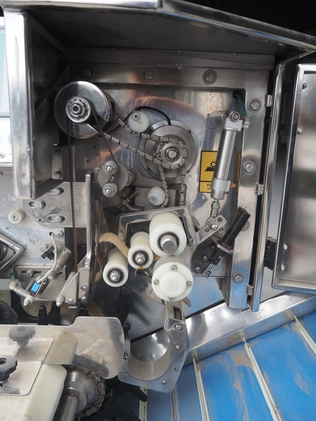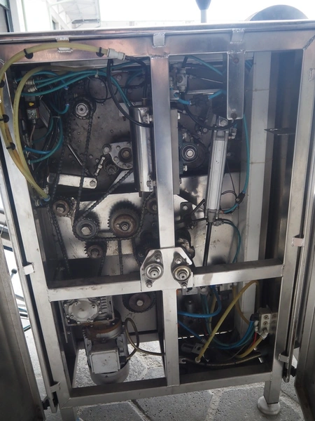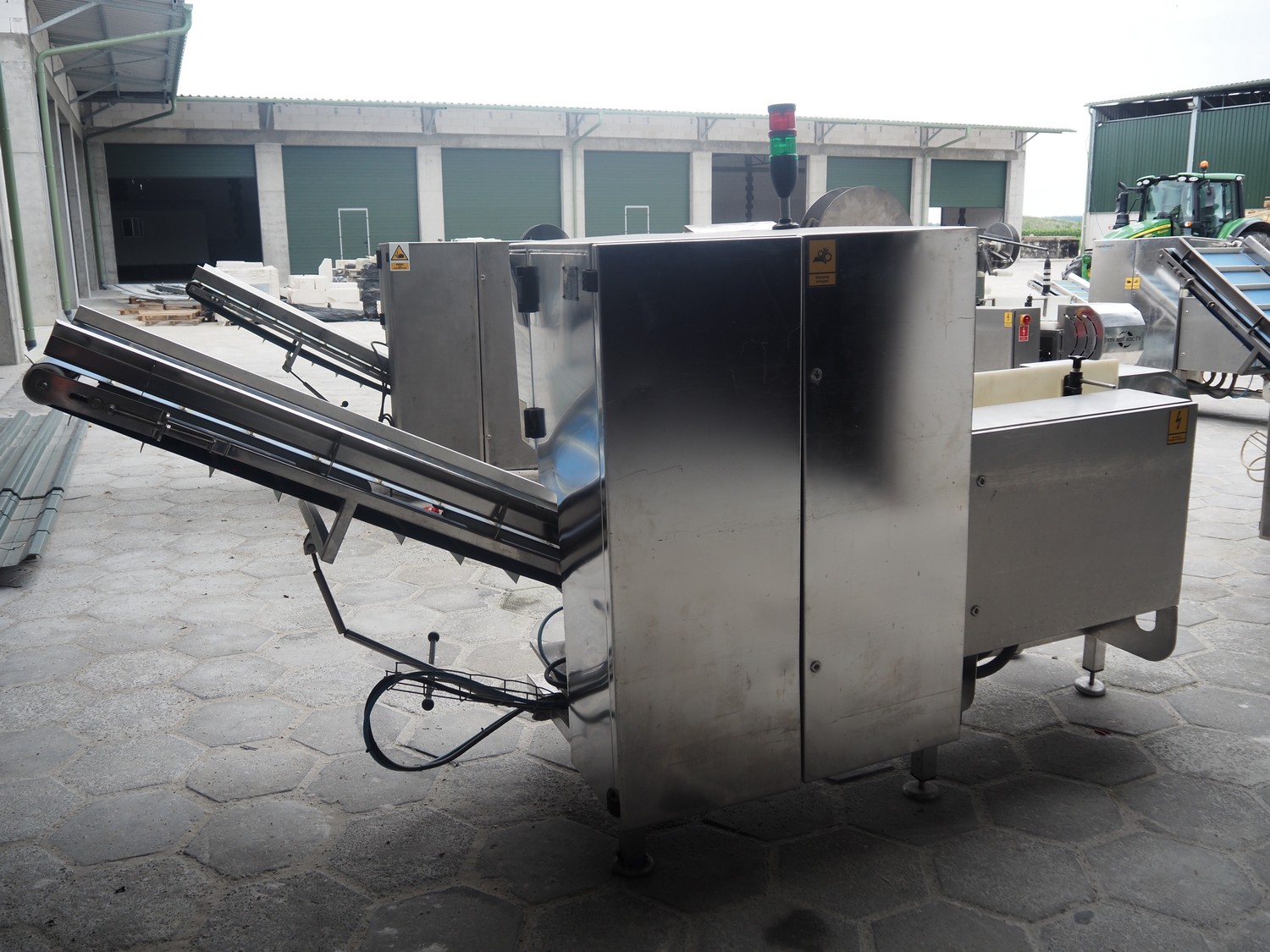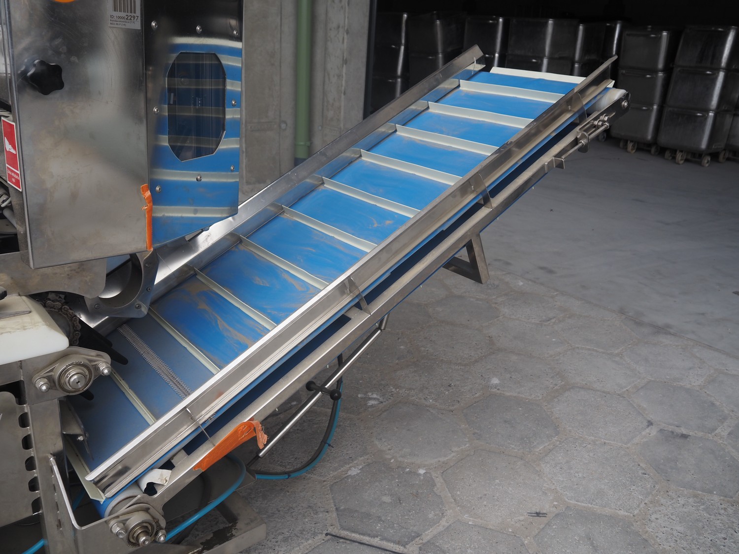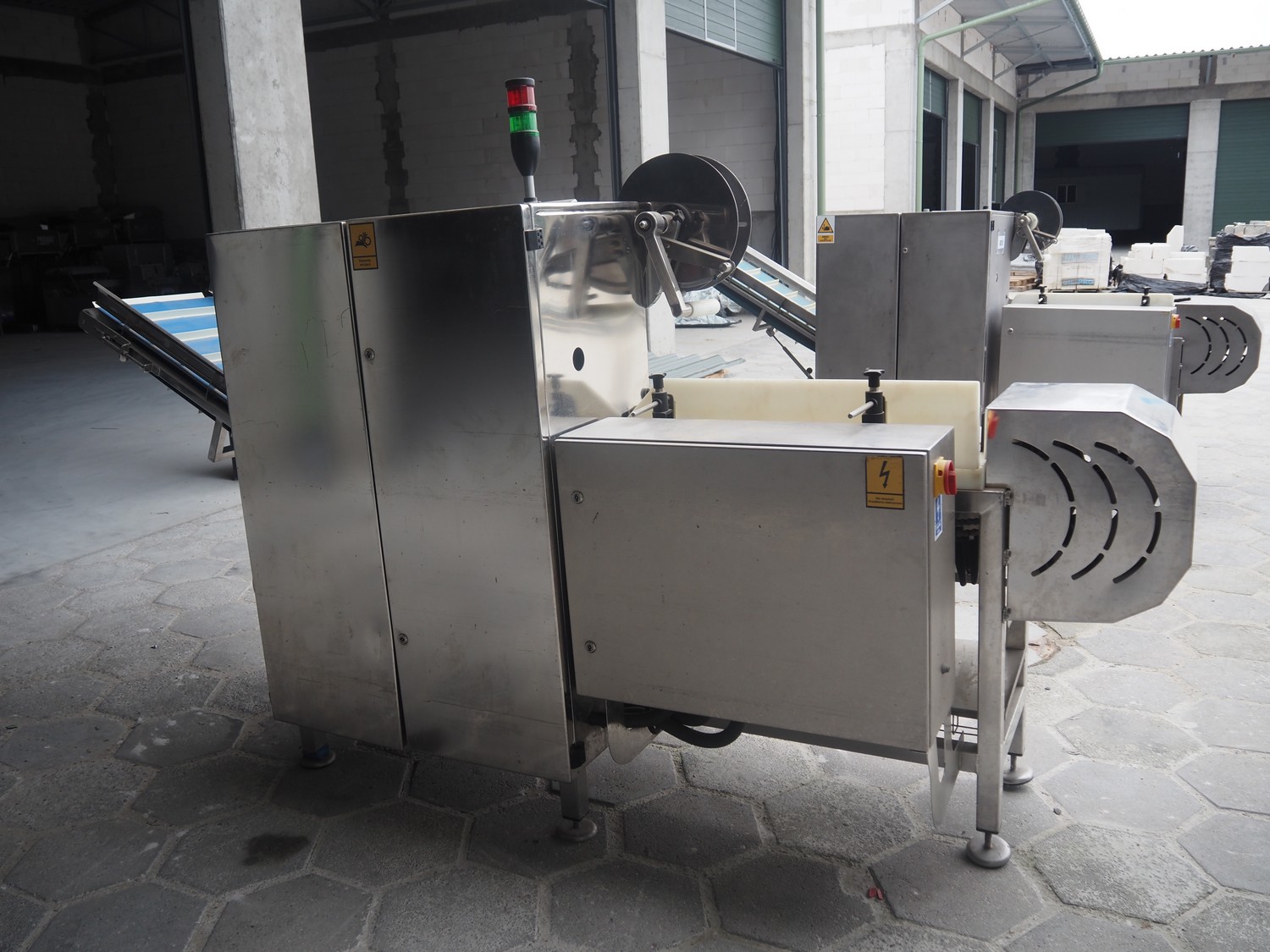 Mastech labelling machine, type: BD2-50-P, serial number: 14, year of construction: 02/2016, 400 V, weight: 485 kg, plastic belt with dividers, belt width: 490 mm, divider height: 30 mm, distance between dividers: 140 mm, total dimensions: 3400 mm x 1000 mm x 1850 mm.