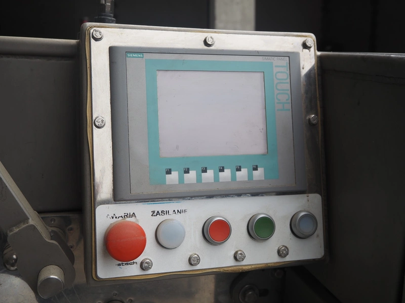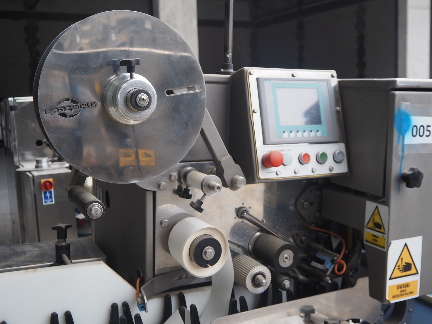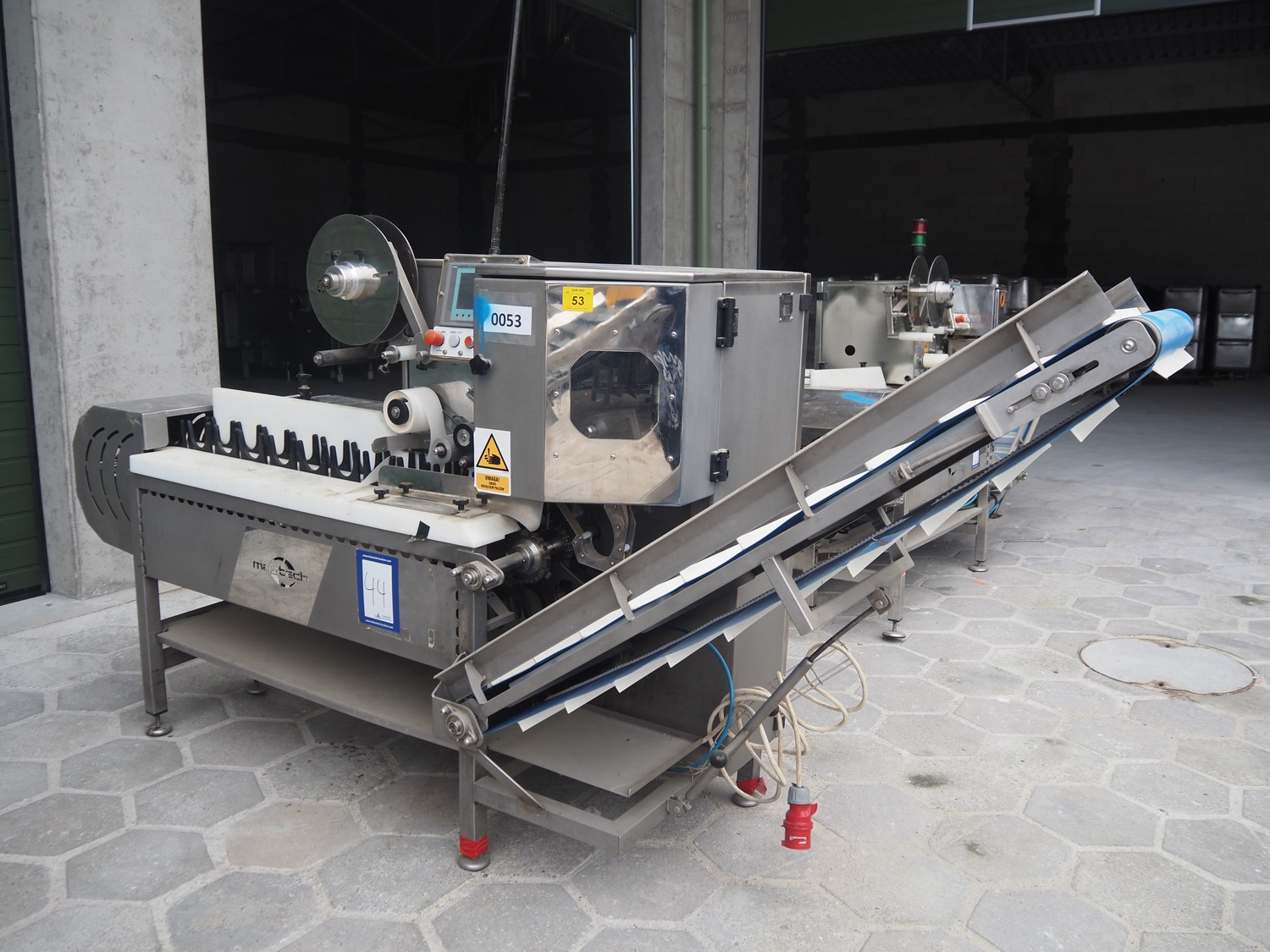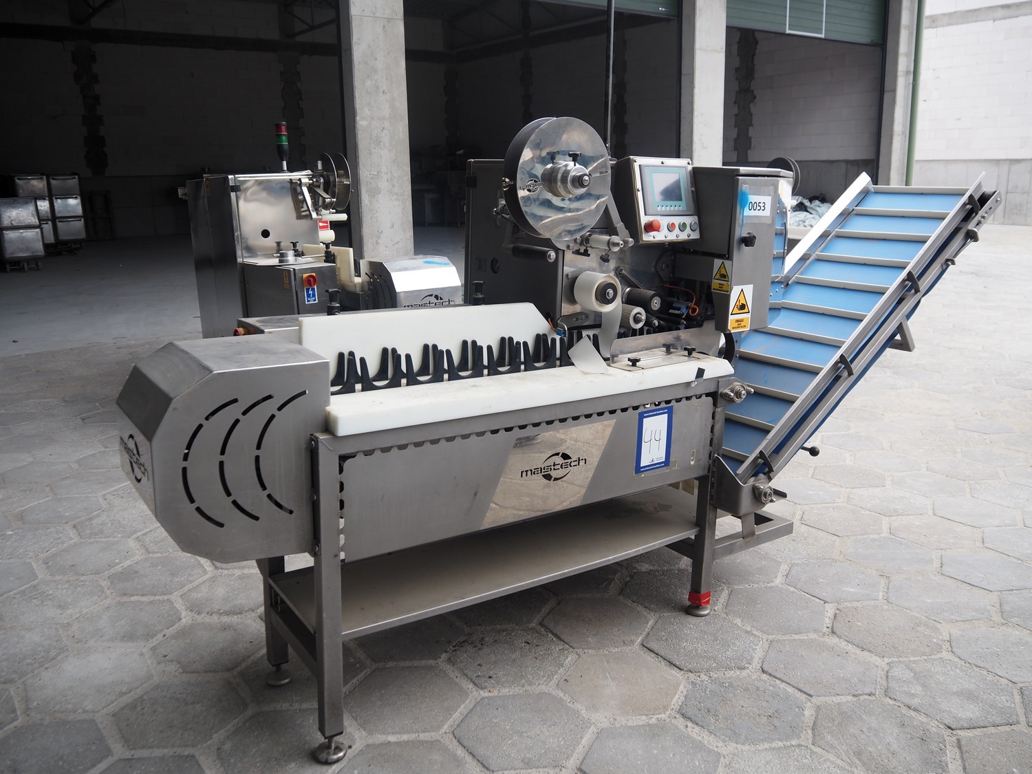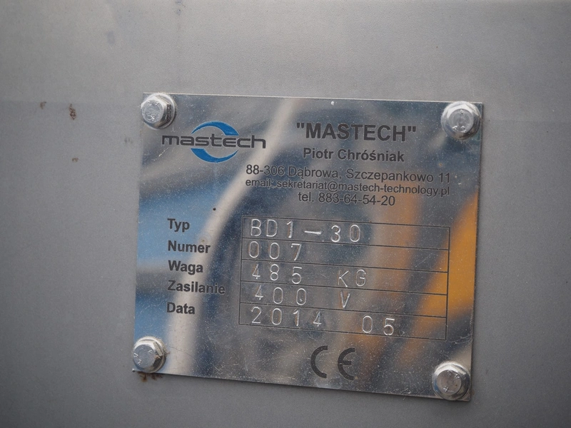 Mastech labelling machine, type: BD1-30, serial number: 007, year of construction: 05/2014, 400 V, weight: 485 kg, plastic belt with dividers, belt width: 490 mm, divider height: 30 mm, distance between dividers: 140 mm, total dimensions: 3300 mm x 1000 mm x 1620 mm.