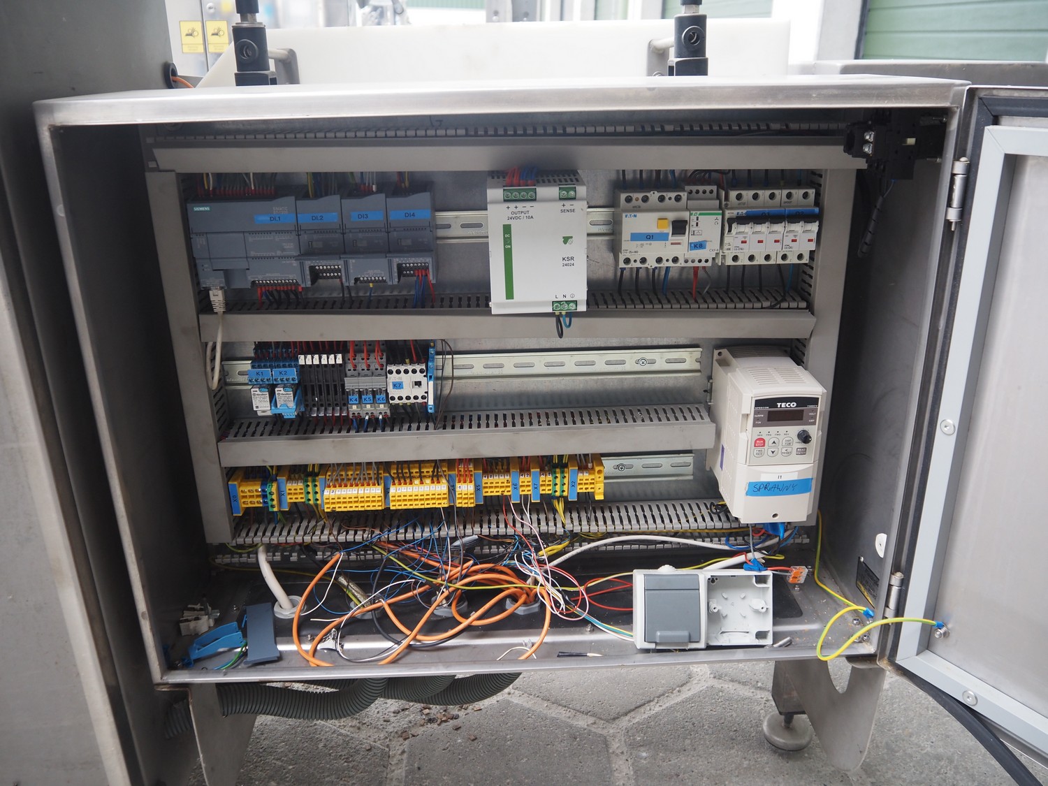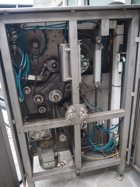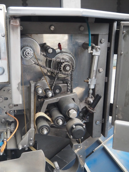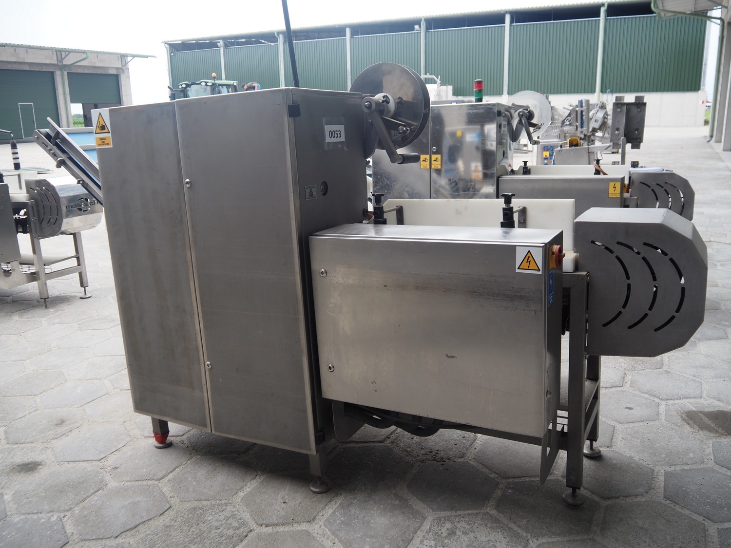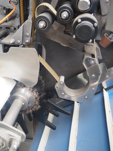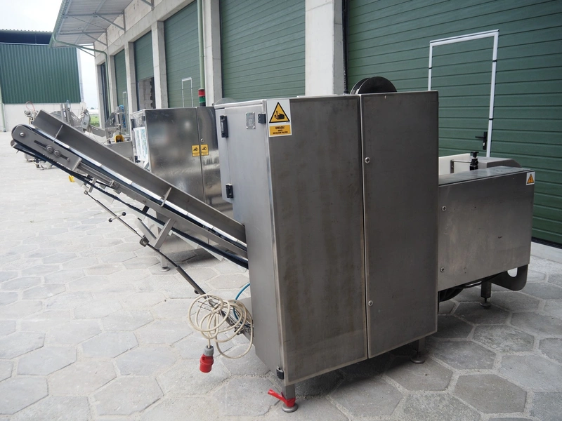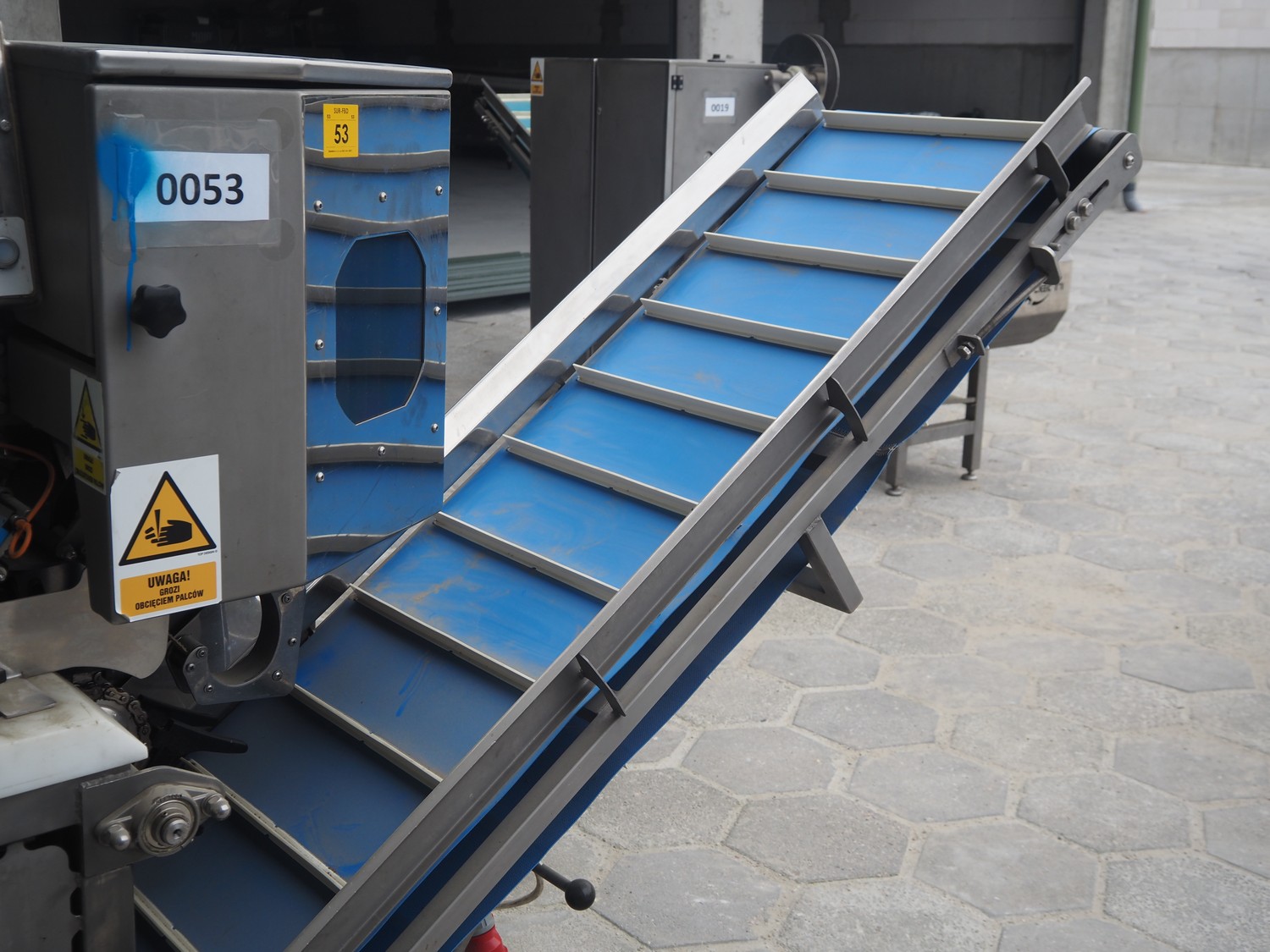 Mastech labelling machine, type: BD1-30, serial number: 007, year of construction: 05/2014, 400 V, weight: 485 kg, plastic belt with dividers, belt width: 490 mm, divider height: 30 mm, distance between dividers: 140 mm, total dimensions: 3300 mm x 1000 mm x 1620 mm.