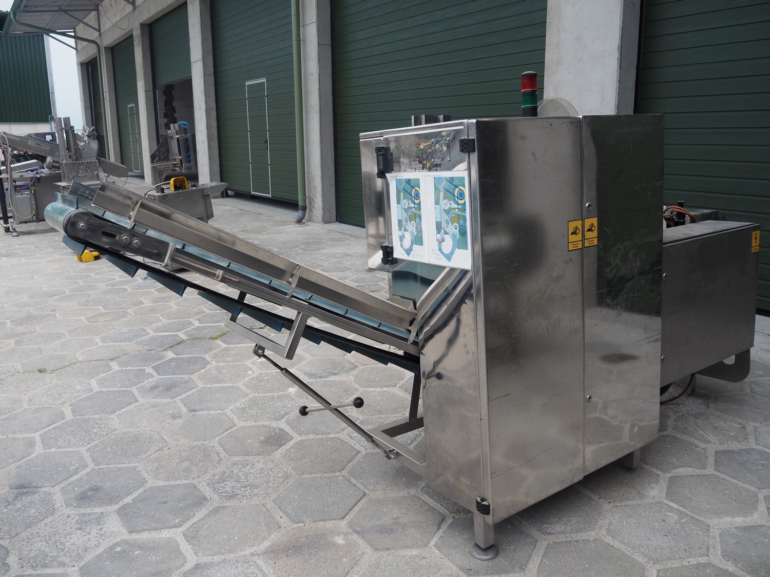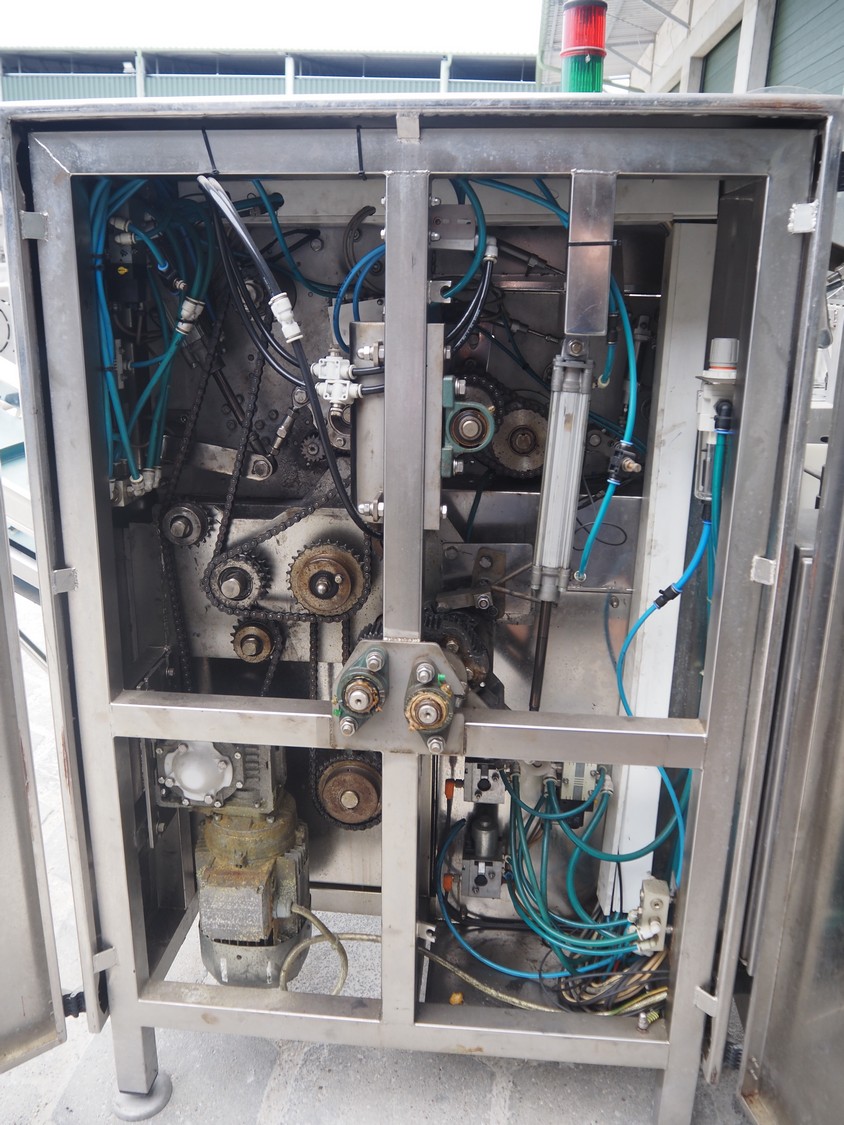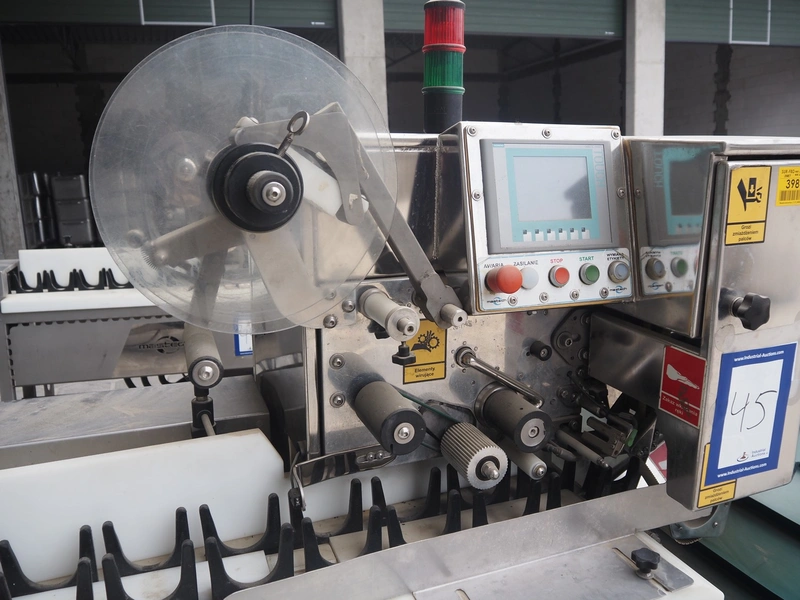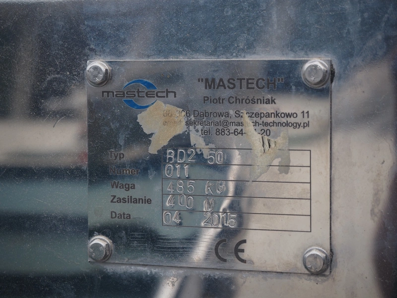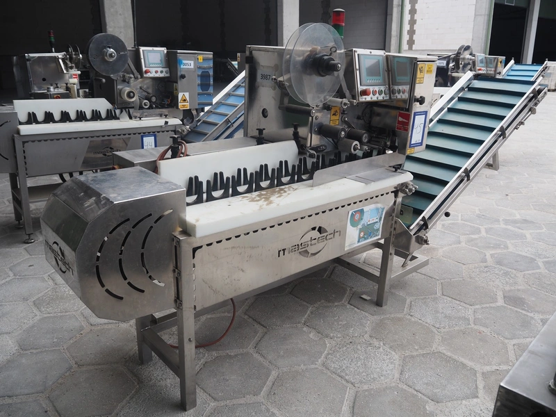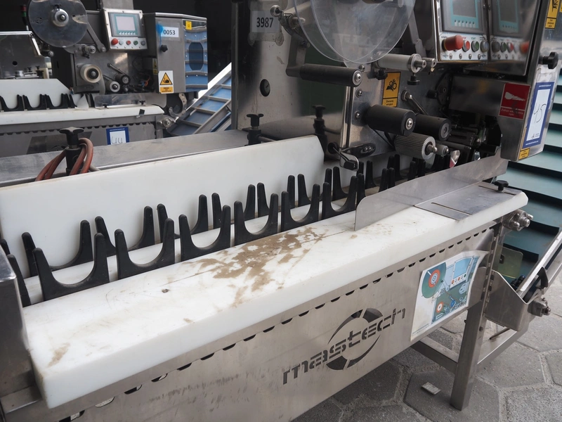 Mastech labelling machine, type: BD2-50, serial number: 011, year of construction: 04/2015, 400 V, weight: 485 kg, plastic belt with dividers, belt width: 490 mm, divider height: 30 mm, distance between dividers: 140 mm, total dimensions: 3300 mm x 1000 mm x 1650 mm.