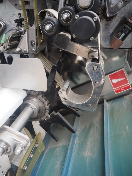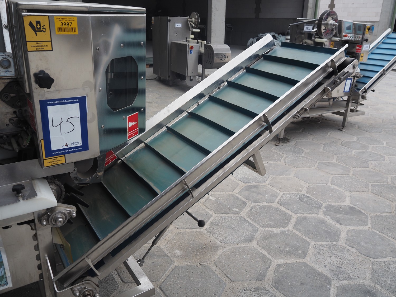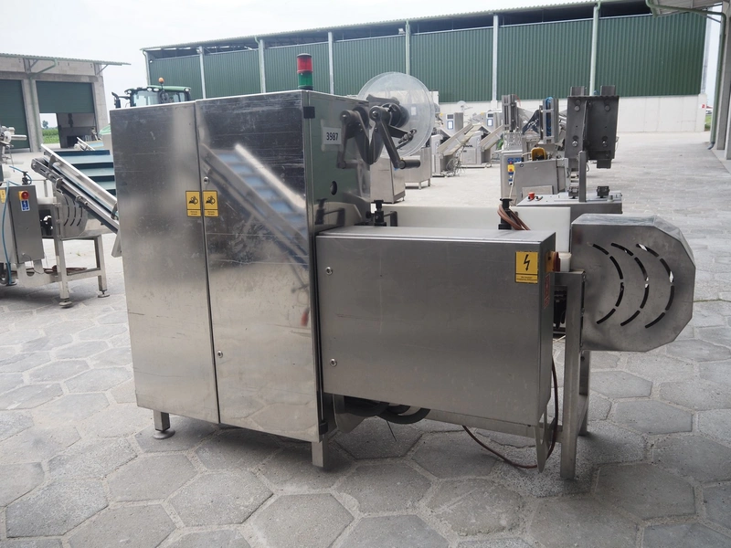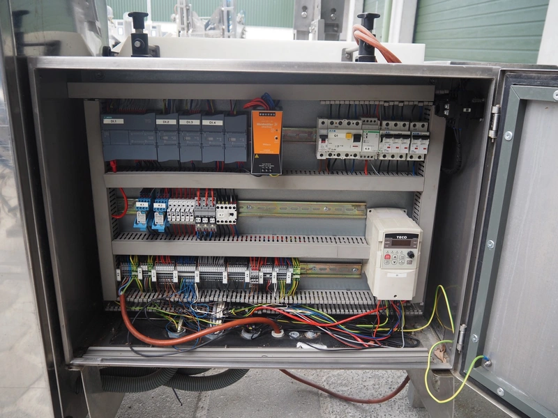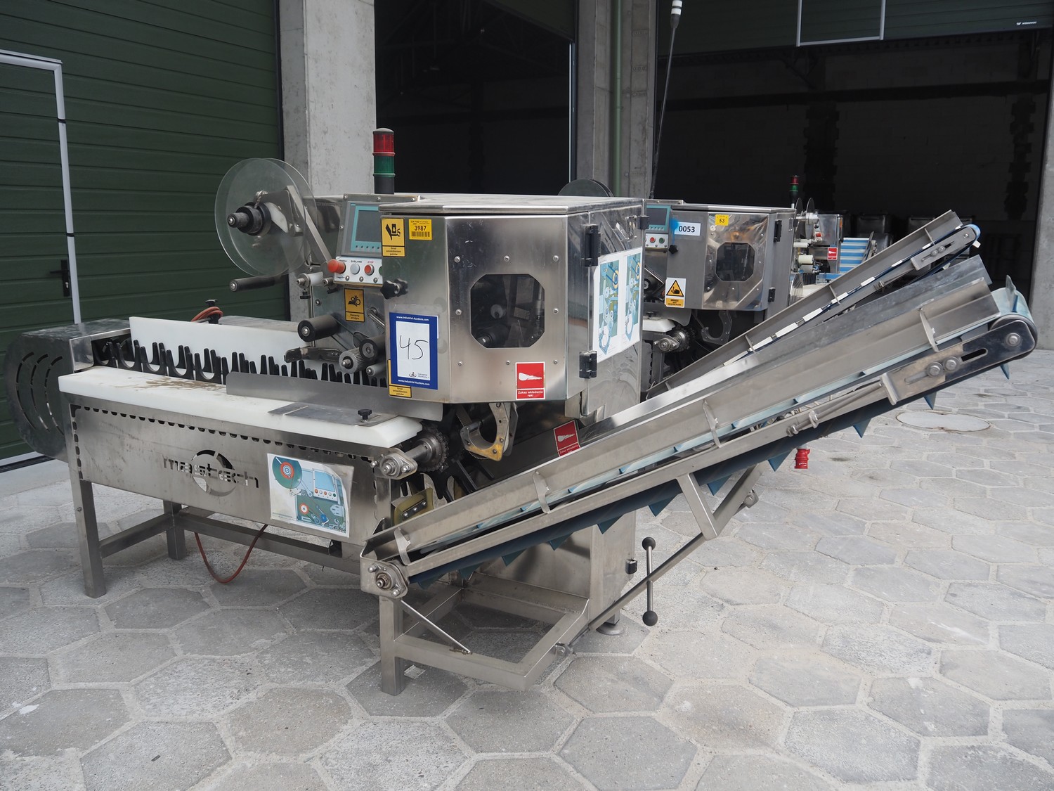 Mastech labelling machine, type: BD2-50, serial number: 011, year of construction: 04/2015, 400 V, weight: 485 kg, plastic belt with dividers, belt width: 490 mm, divider height: 30 mm, distance between dividers: 140 mm, total dimensions: 3300 mm x 1000 mm x 1650 mm.