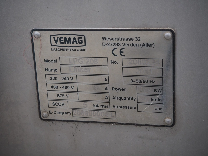 Vemag mobile linking device, type: LPG 208, serial number: 2080234, year of construction: 2011, 400/460 V, 3 Ph, 50/60 Hz, 9 A, 6 kW, dimensions: 1500 mm x 850 mm x 1300 mm.