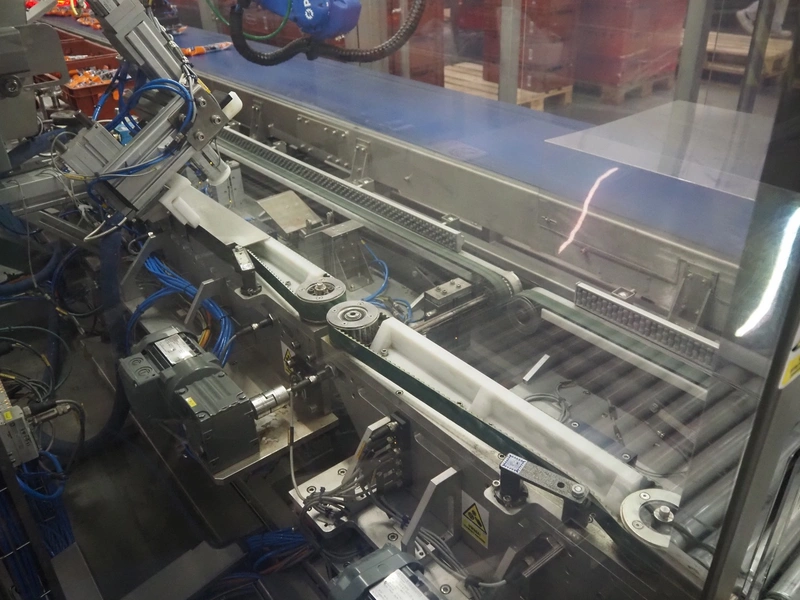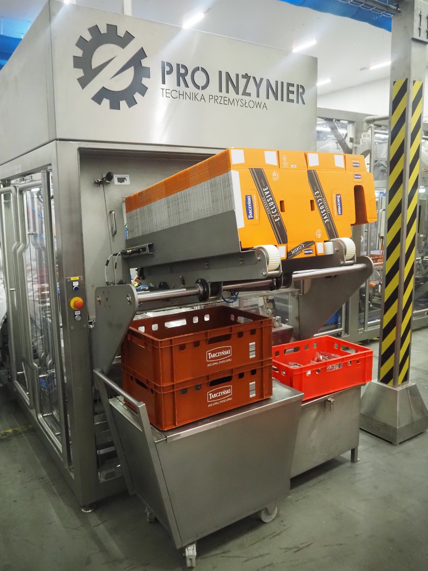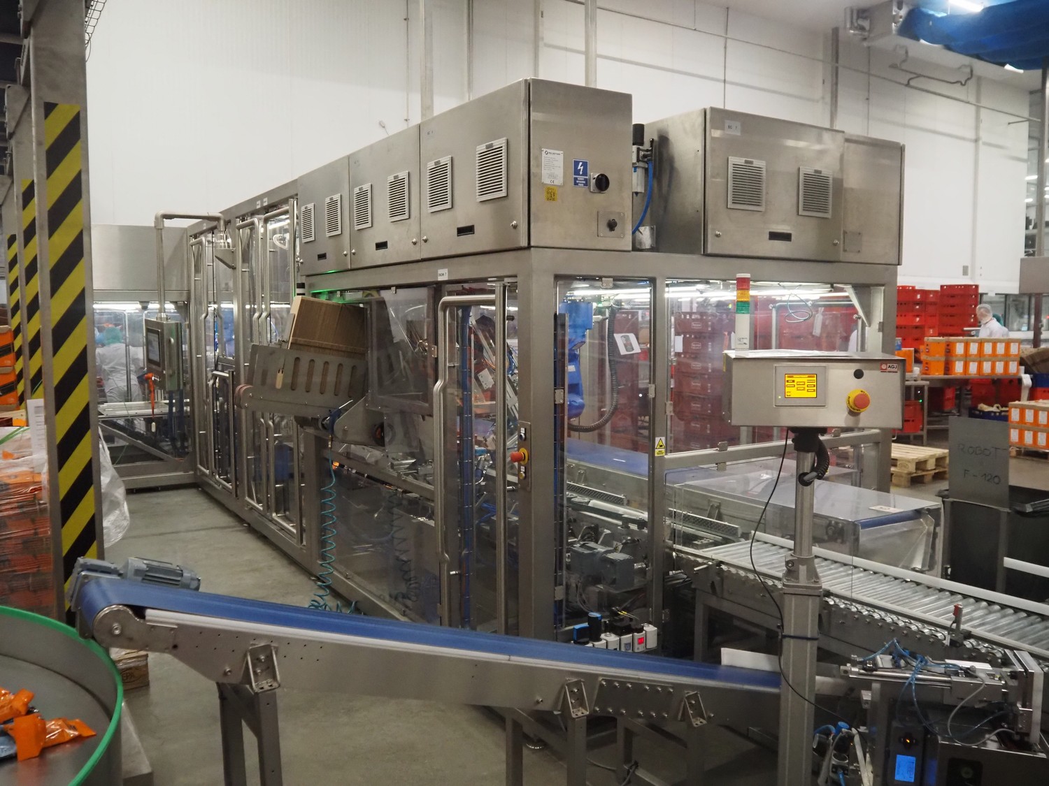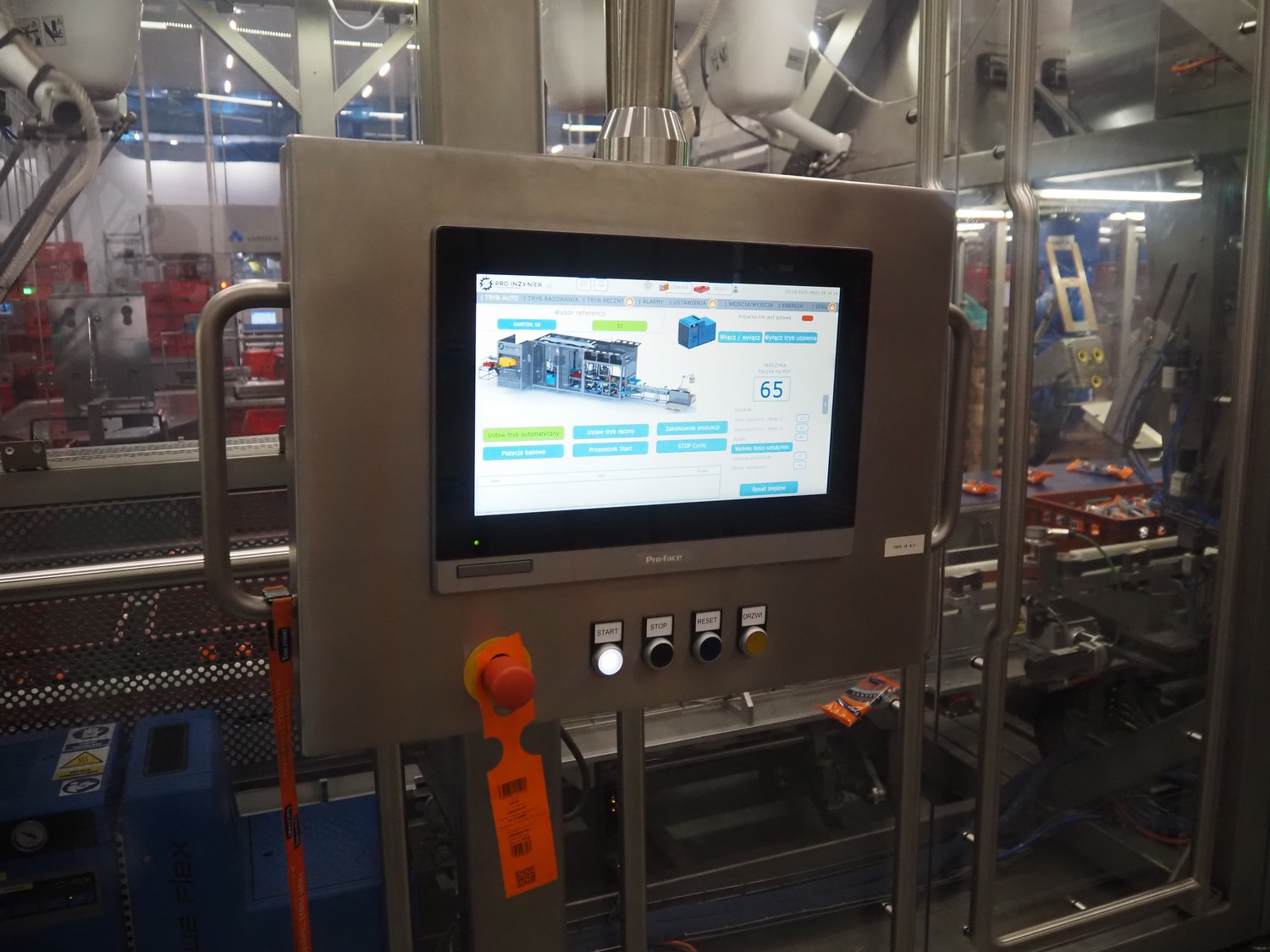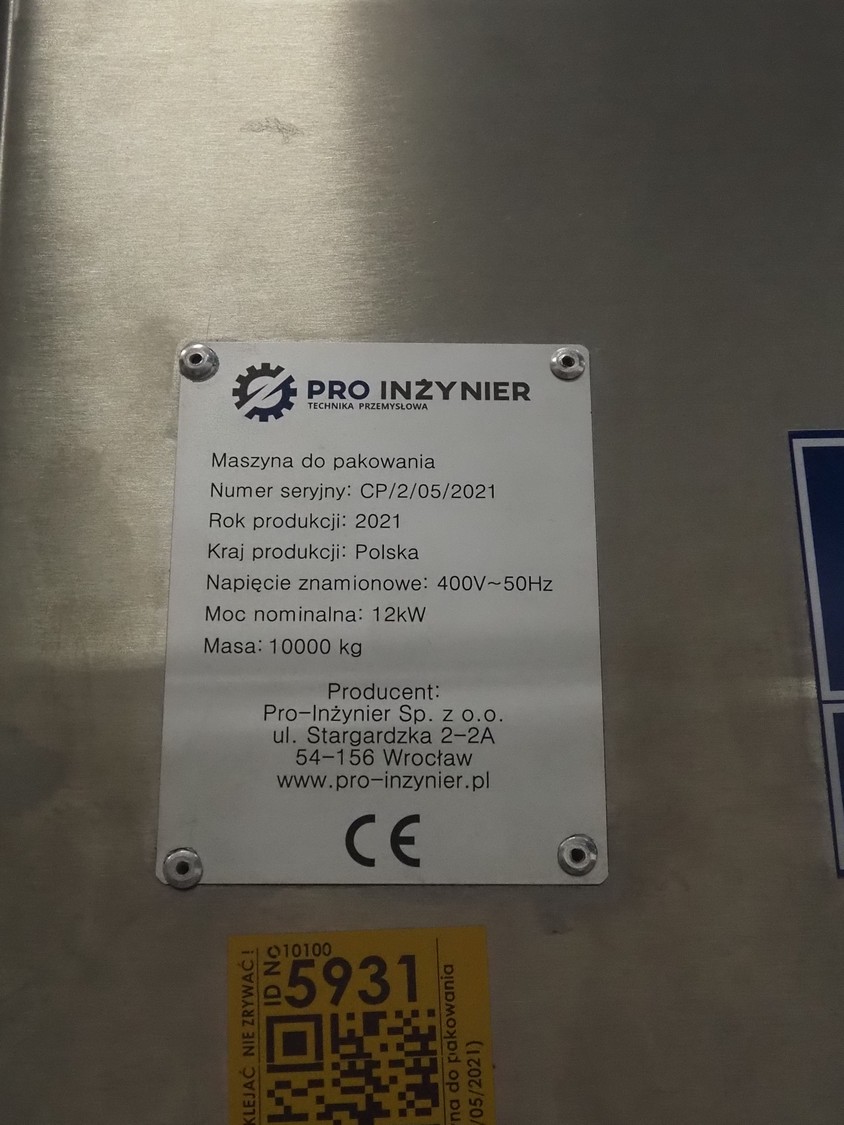 Pro Inzynier pick and place robot with case packaging machine, serial number: CP/2/05/2021, year of construction: 2021, 400 V, 50 Hz, 12 kW, weight: 10000 kg, plastic belt, belt width: 500 mm, clearance: 530 mm x 120 mm, total dimensions: 8300 mm x 2700 mm x 3000 mm.