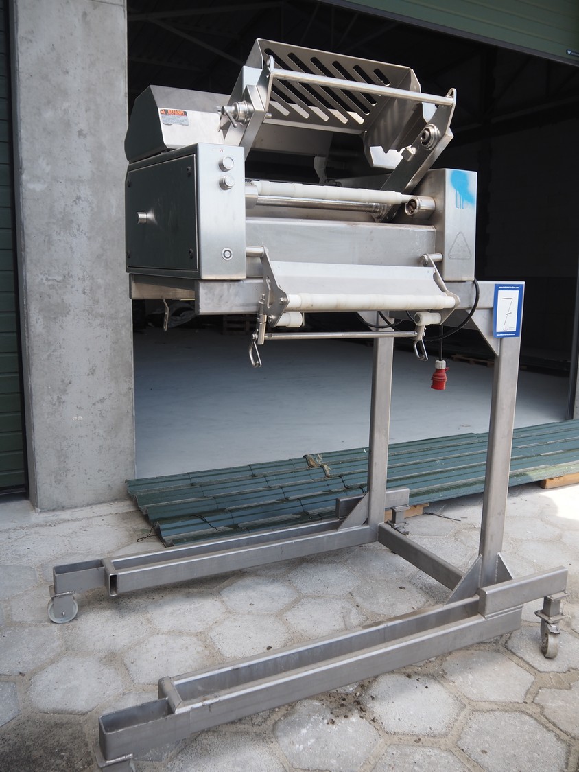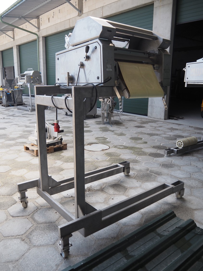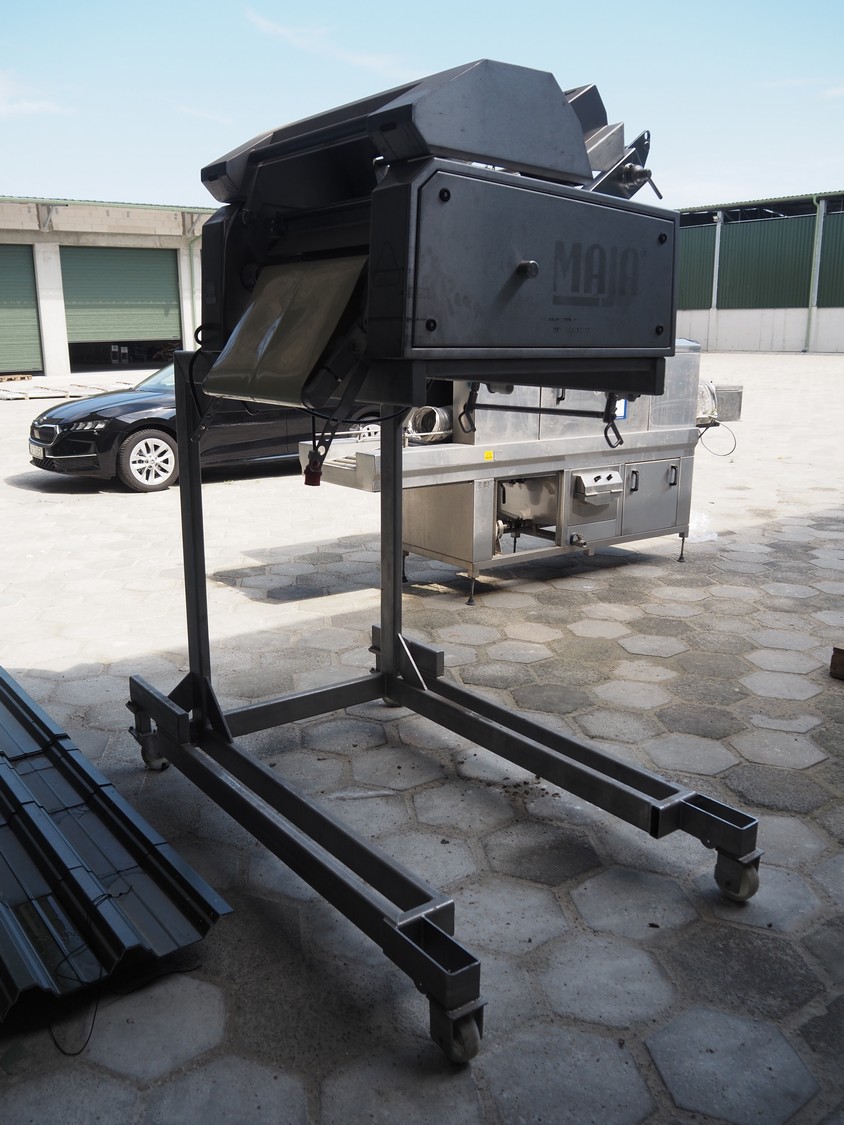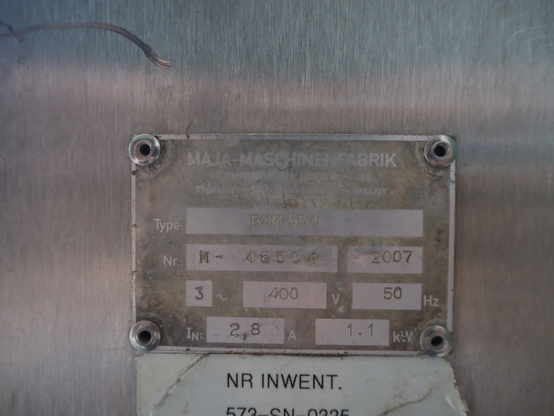 Maja mobile skinning machine, type: BXM 554, serial number: M-46554, year of construction: 2007, 400 V, 3 Ph, 50 Hz, 2,8 A, 1.1 kW, plastic belt, belt width: 500, working width: 550, total dimensions: 1870 mm x 1150 mm x 2200 mm. Incomplete.