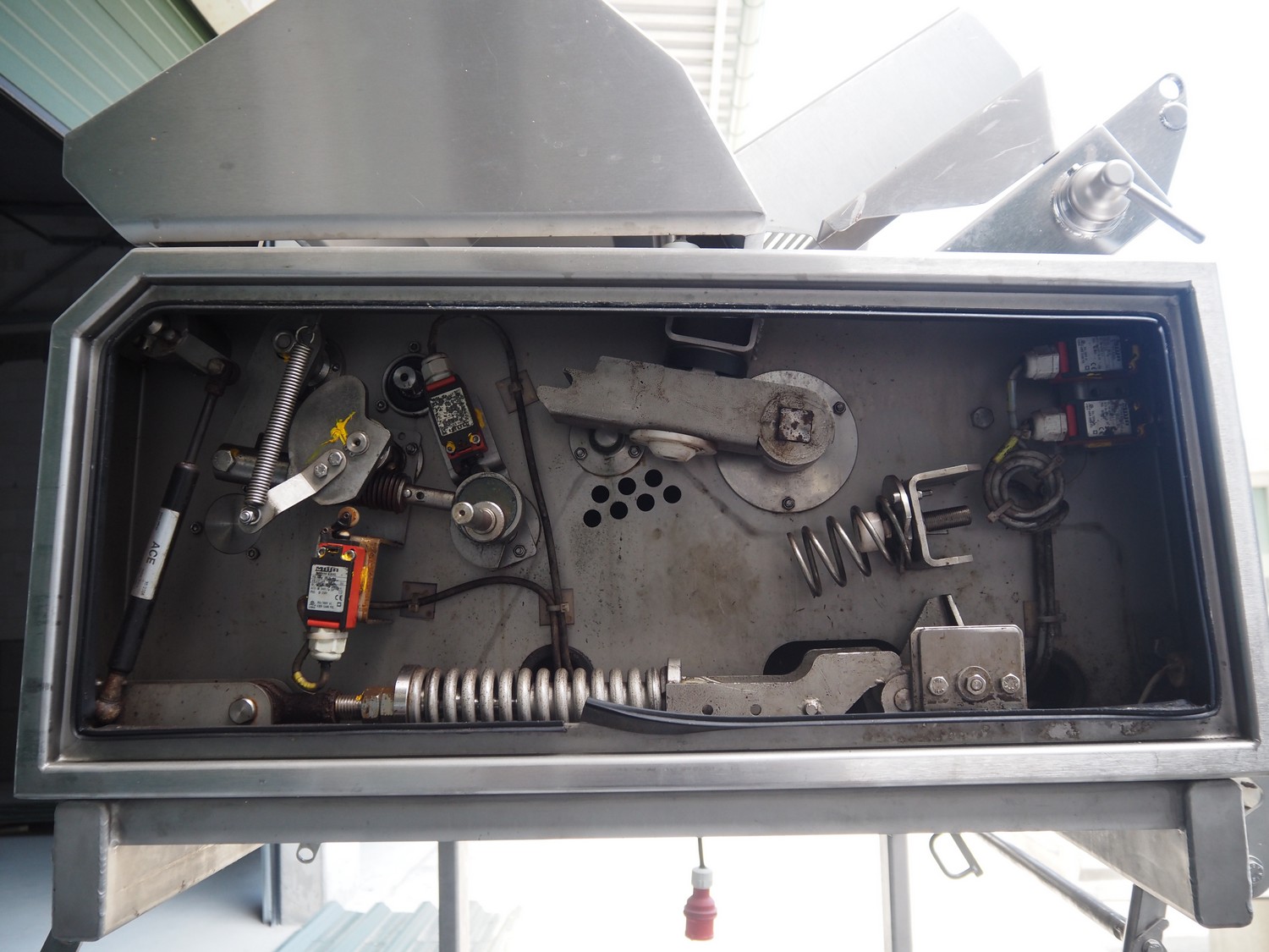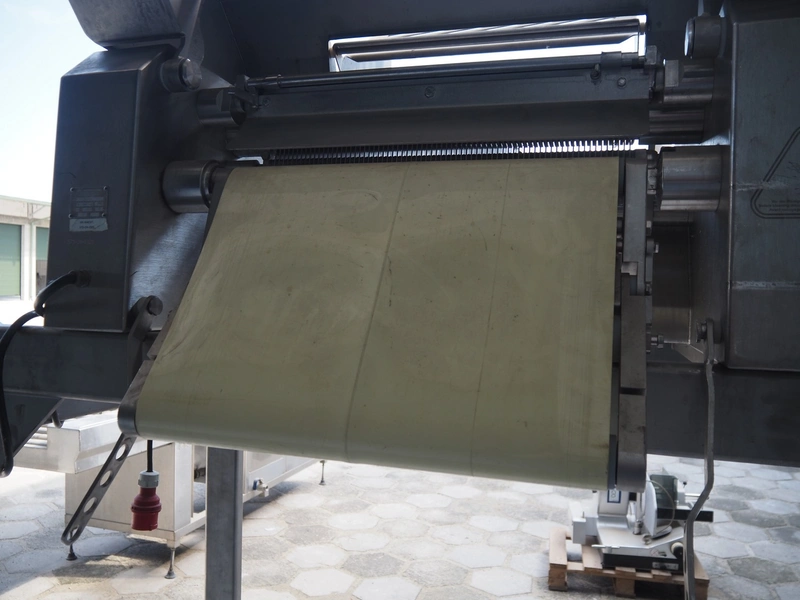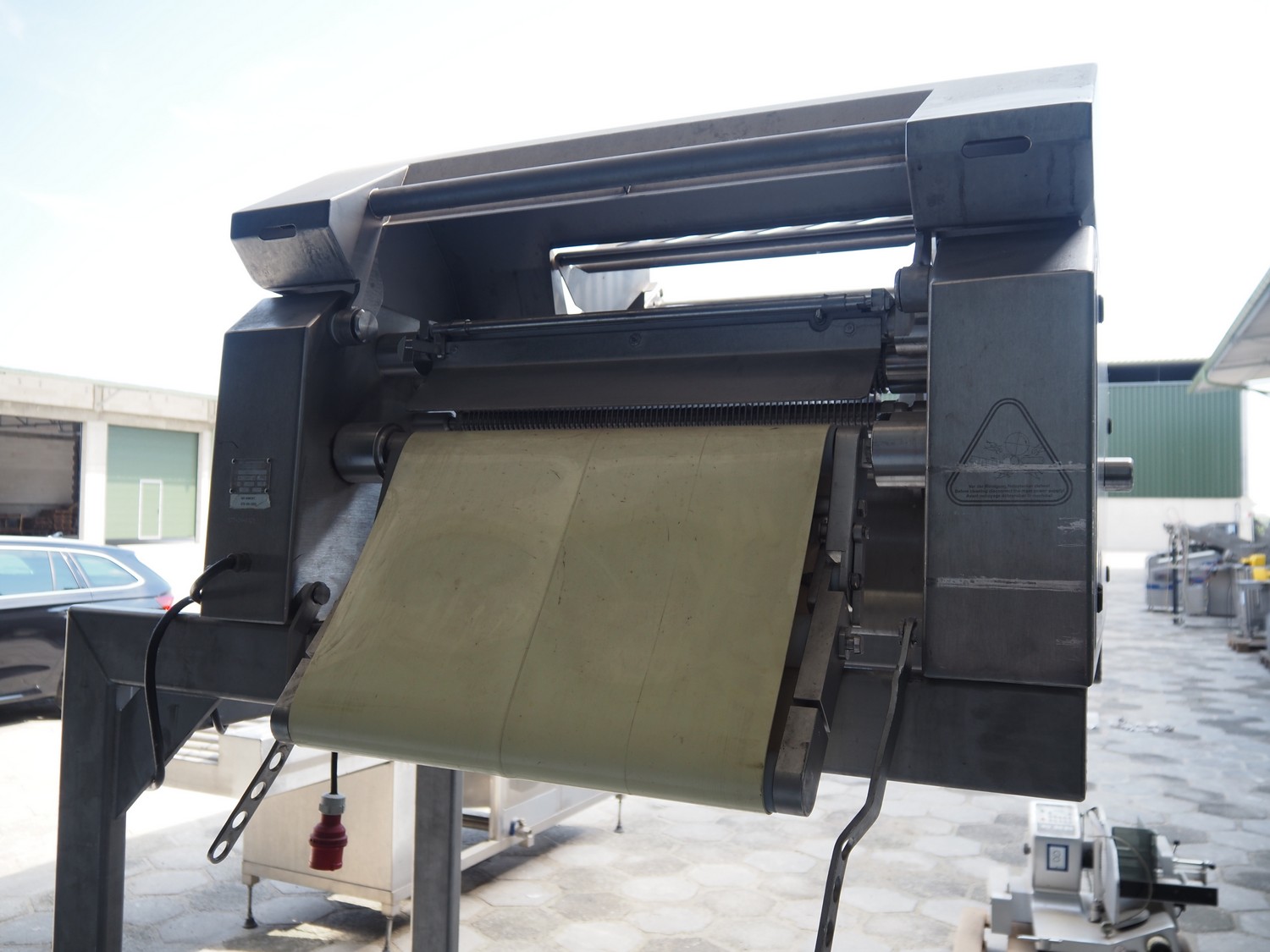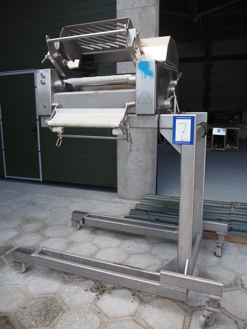Maja mobile skinning machine, type: BXM 554, serial number: M-46554, year of construction: 2007, 400 V, 3 Ph, 50 Hz, 2,8 A, 1.1 kW, plastic belt, belt width: 500, working width: 550, total dimensions: 1870 mm x 1150 mm x 2200 mm. Incomplete.