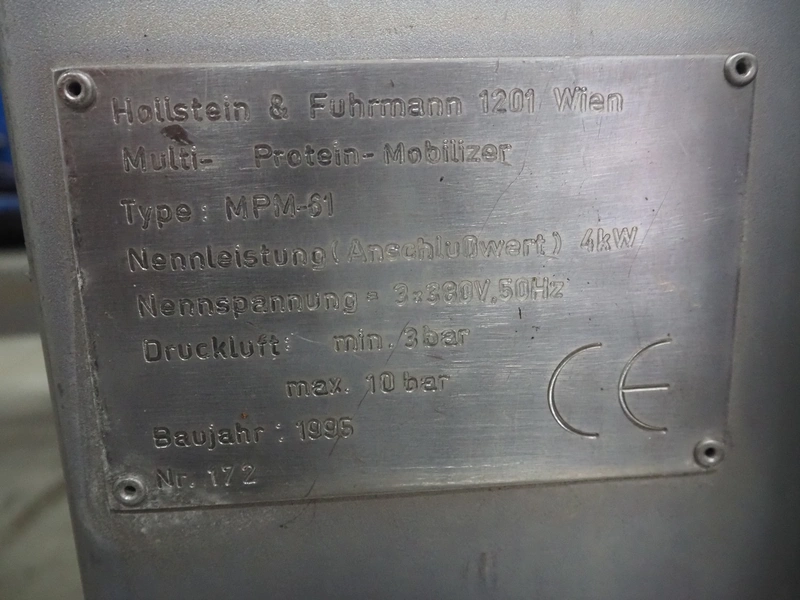Inject Star multi- protein mobilizer steaker, type: MOM-61, number: 172, year of construction: 1995, 3x380 V, 50 Hz, 4 kW, clearance: 600 mm x 320 mm, working width: 600 mm, total dimensions: 1500 mm x 1050 mm x 1860 mm. Lot is located on another location in Bielsko-Biała (PL). Pick-up in consultation with Industrial Auctions BV.