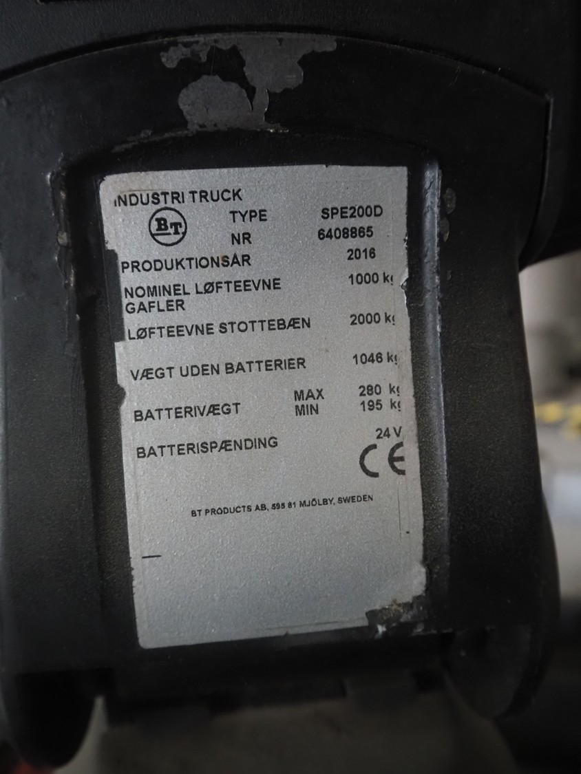 BT electric pallet lifter, type: SPE200D, serial number: 6408865, year of construction: 2016, 24 V, fork length: 1180 mm, total dimensions: 2200 mm x 800 mm x 1760 mm. Without charger.