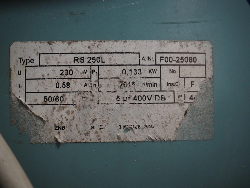 Tube ventilator, type: RS 250L, number: F00-25060, 230 V, 50/60 Hz, 0.58 A, Ø 250 mm.