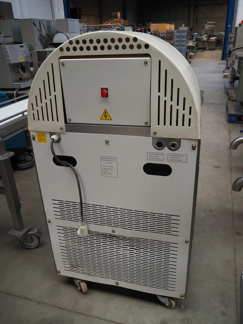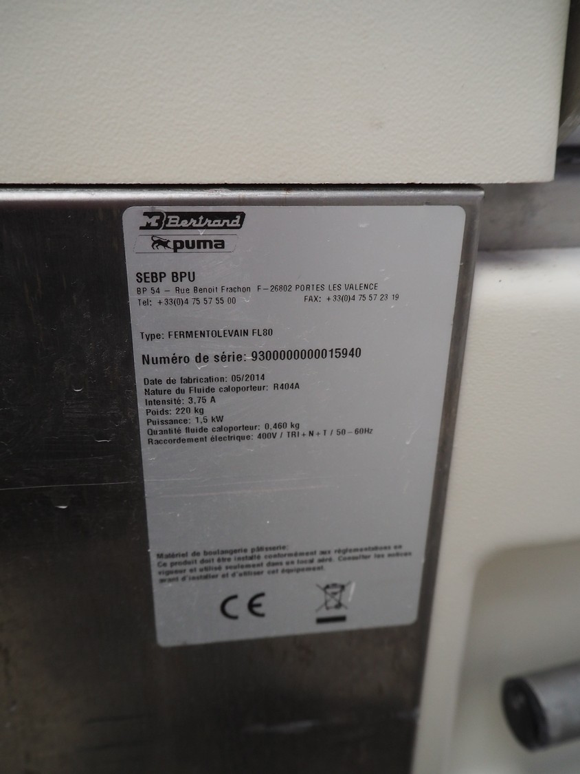 Bertrand mobile liquid sourdough fermentation tank, model: SEBP BPU, type: FERMENTOLEVAIN FL80, serial number: 9300000000015940, year of construction: 05/2014, 400 V, 50/60 Hz, 3.75 A, 1.5 kW, fluid: R404A, machine weight: 220 kg, tank: Ø 600 mm x 500 mm, total dimensions: 1150 mm x 830 mm x 1500 mm. Control panel not working.