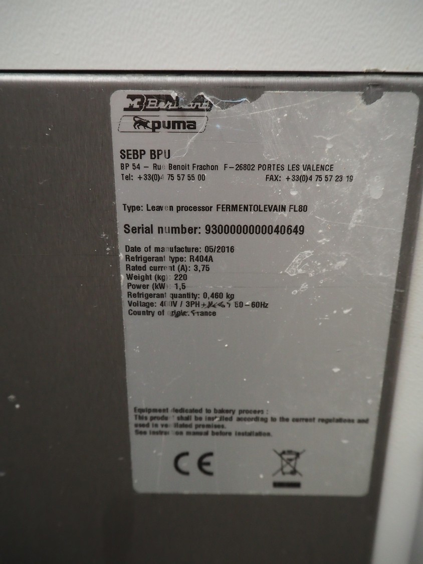 Bertrand mobile liquid sourdough fermentation tank, model: SEBP BPU, type: Leaven processor FERMENTOLEVAIN FL80, serial number: 9300000000040649, year of construction: 05/2016, 400 V, 3 Ph, 50/60 Hz, 3.75 A, 1.5 kW, fluid: R404A, machine weight: 220 kg, tank: Ø 600 mm x 500 mm, total dimensions: 1150 mm x 830 mm x 1500 mm. Control panel not working.