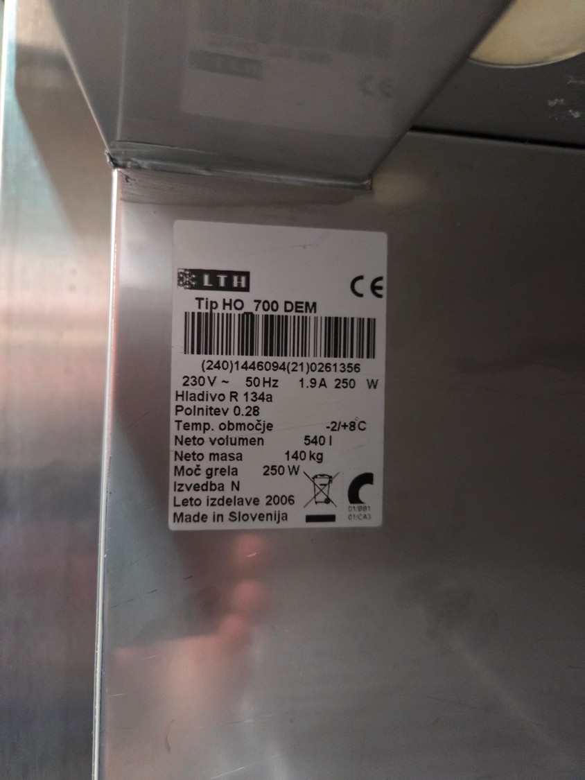 LTH refrigerator, type: HO_700 DEM, year of construction: 2006, 230 V, 50 Hz, 1.9 A, 250 W, netto volume: 540 liter, netto weight: 140 kg, refrigerant: R 134a - 0.28 kg, temperature range: -2/+8 °C, dimensions: 700 mm x 800 mm x 2000 mm.