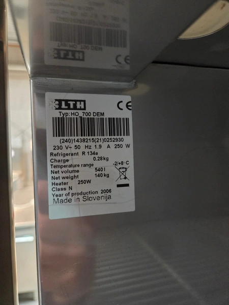 LTH refrigerator, type: HO_700 DEM, year of construction: 2006, 230 V, 50 Hz, 1.9 A, 250 W, netto volume: 540 liter, netto weight: 140 kg, refrigerant: R 134a - 0.28 kg, temperature range: -2/+8 °C, dimensions: 700 mm x 800 mm x 2000 mm.