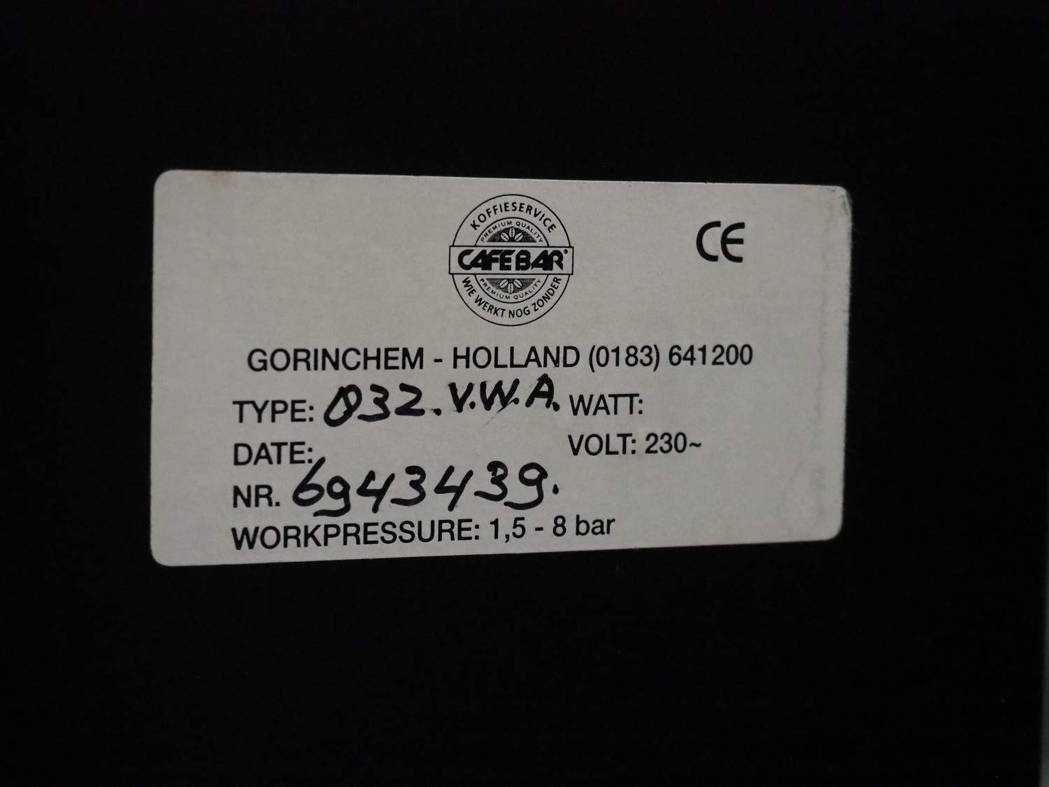 Cafe Bar coffee machine, model: type: 832.V.W.A, number: 6943439, 230 V, dimensions: 500 mm x 250 mm x 460 mm.