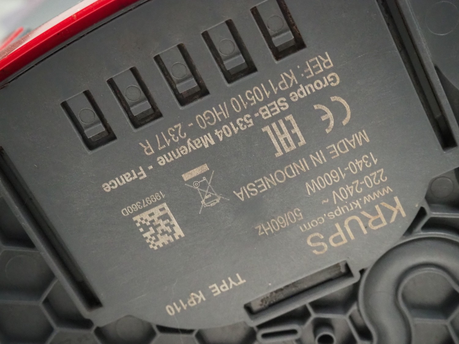 Krups coffee machine, type: KP110, 220-240 V, 50/60 Hz, 1340-1600 W, dimensions: 250 mm x 200 mm x 300 mm.