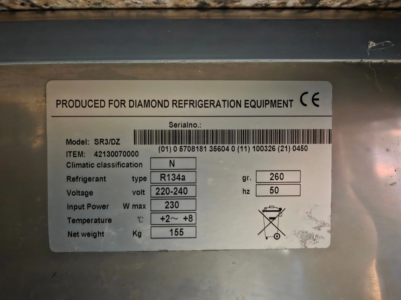 Diamond refrigerated counter with saladette, model: SR3/DZ, 220-240 V, 50 Hz, refrigerant: R134a, dimensions: 1370 mm x 700 mm x 1050 mm.