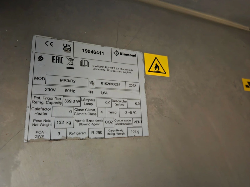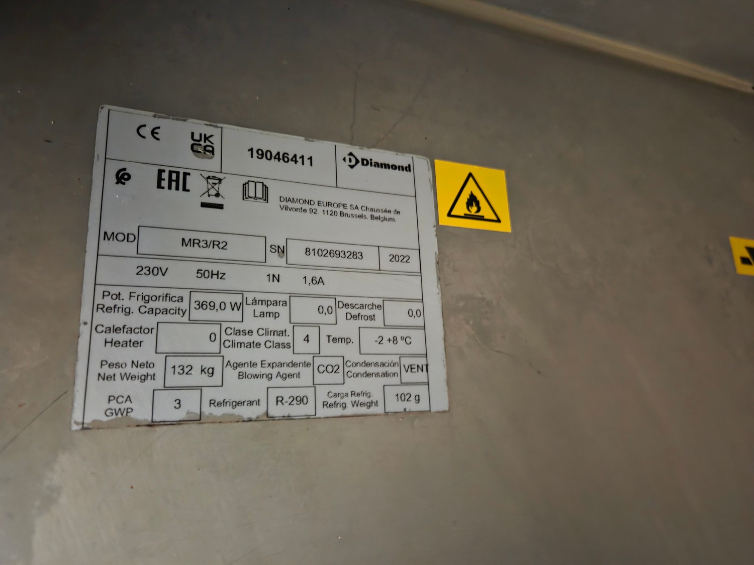 Diamond refrigerated counter model: MR3/R2, serial number: 8102693283, year of construction: 2022, 230 V, 1 Ph, 50 Hz, 1.6 A, refrigerant: R2-230, 102 gram, dimensions: 1800 mm x 700 mm x 850 mm.