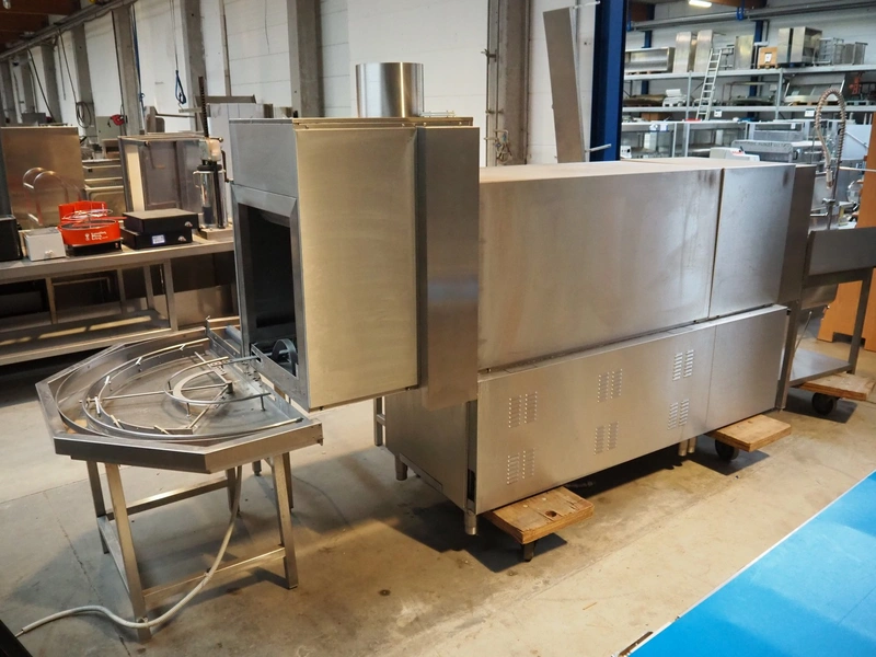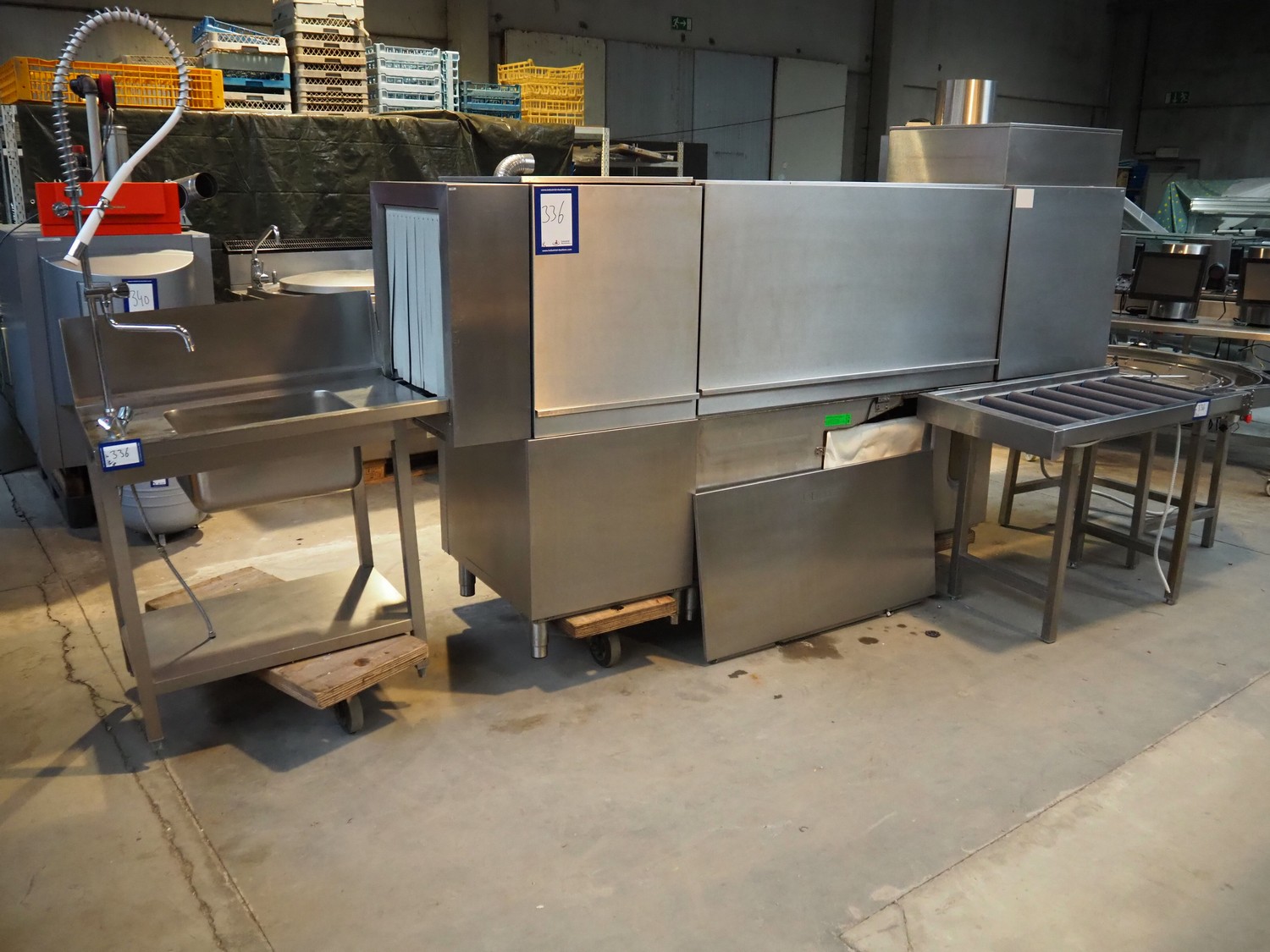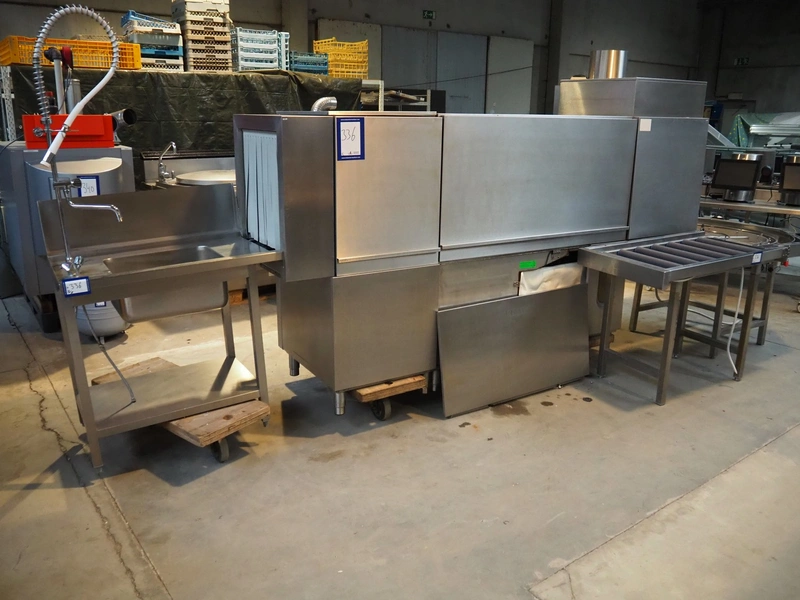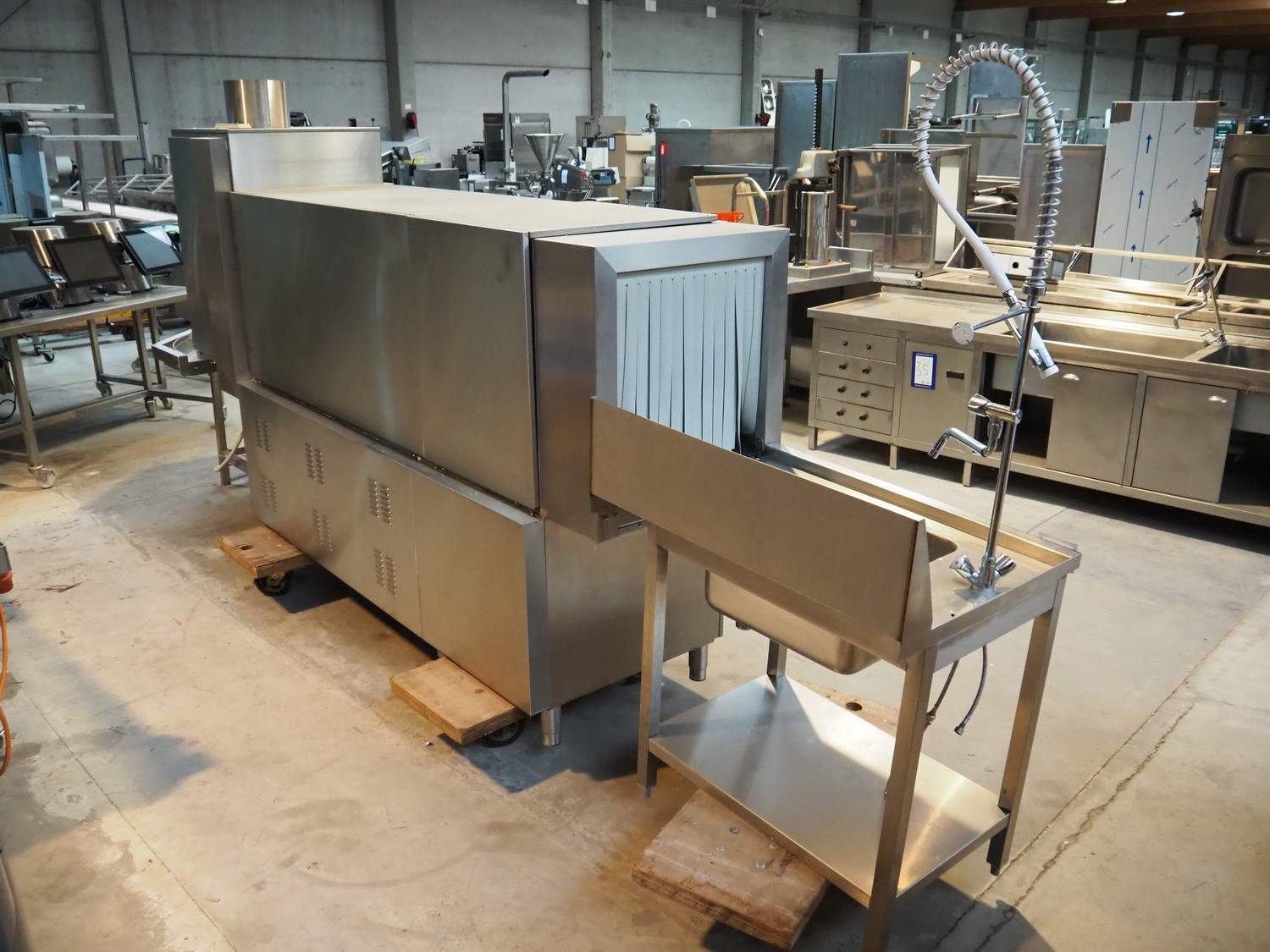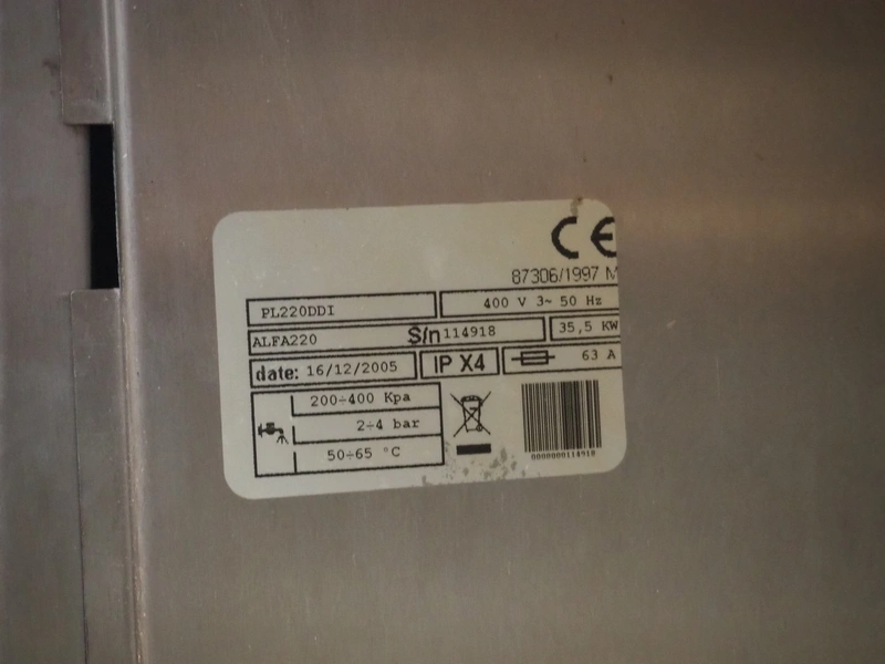 Colged dishwasher, type: PL220 DDI, serial number: 114918, year of construction: 2005, 400 V, 63 A, 35.5 kW, dimensions sink: 940 mm x 840 mm x 1150 mm, dimensions dishwasher: 3000 mm x 800 mm x 1890 mm, dimensions 180° curve: 1400 mm x 820 mm x 850 mm, dimensions roller conveyor: 1150 mm x 630 mm x 860 mm. Rollies not included.