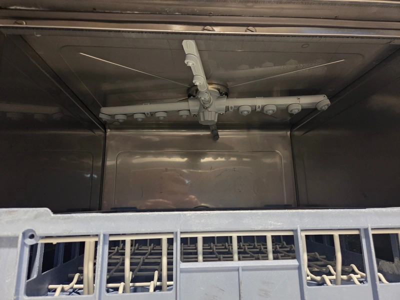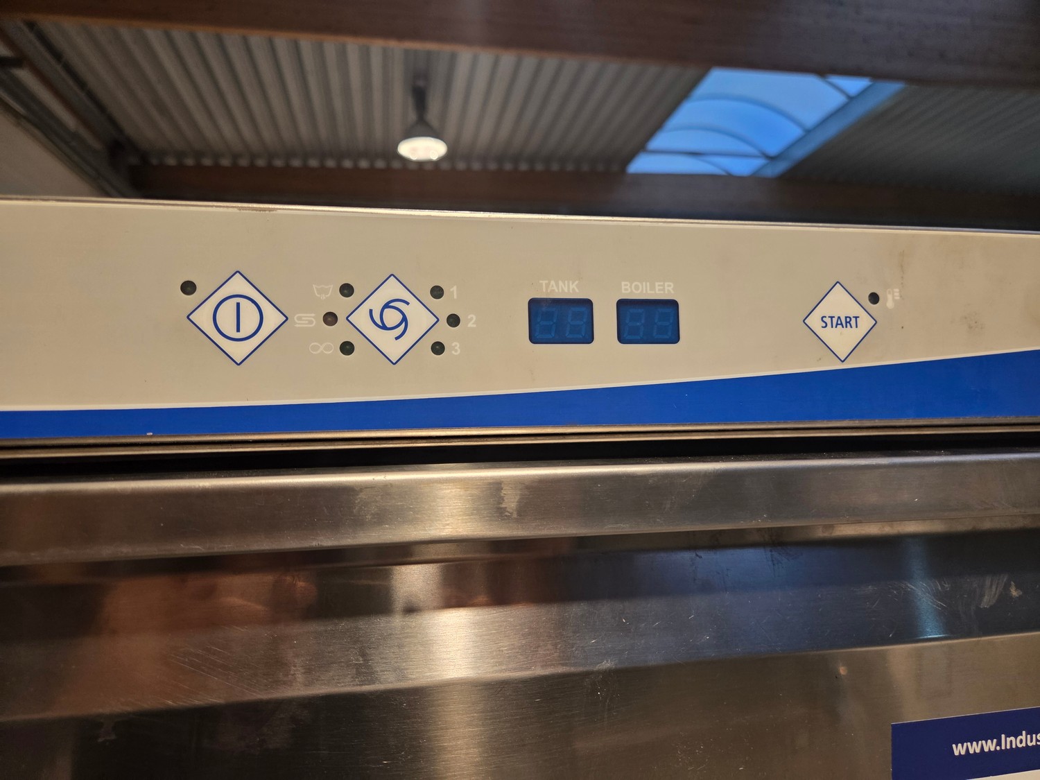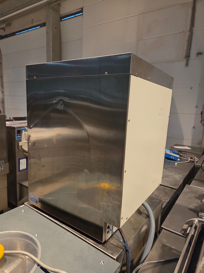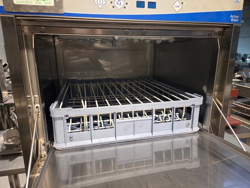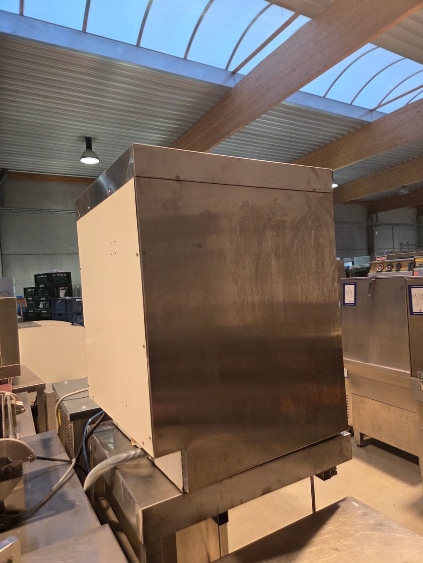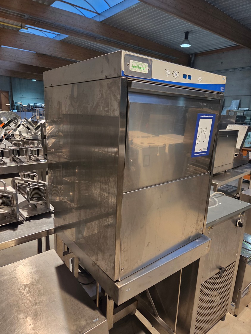 Wathelet dishwasher, serial number: 600900, year of construction: 24/07/2008, 400 V, 3 Ph, 50 Hz, 16 A, 5.9 kW, H²O: 300-400 Kpa, temperature: 010-050°C, crate: 530 mm x 500 mm, total dimensions: 640 mm x 630 mm x 820 mm.