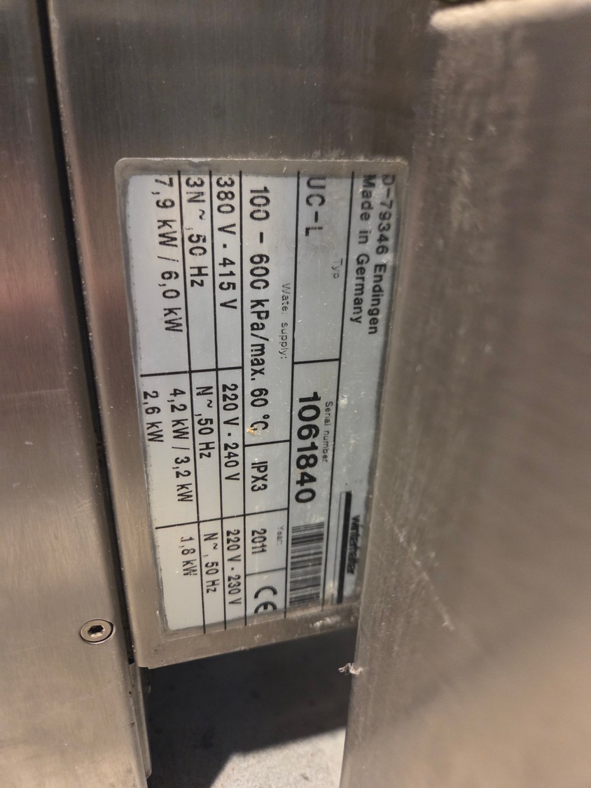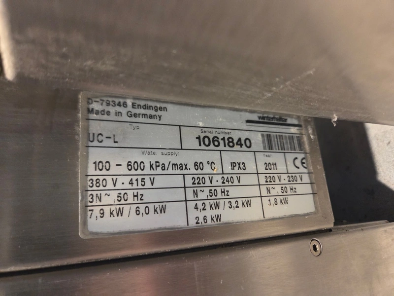 Winterhalter, type: UC-L, serial number: 1061840, year of construction: 2011, 380/415 V, 3 Ph, 50 Hz, 7.9/6.0 kW, crate: 500 mm x 500 mm, total dimensions: 650 mm x 600 mm x 840 mm.