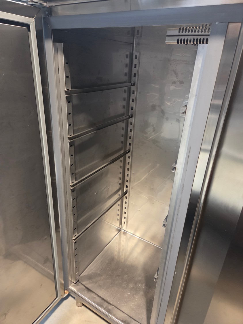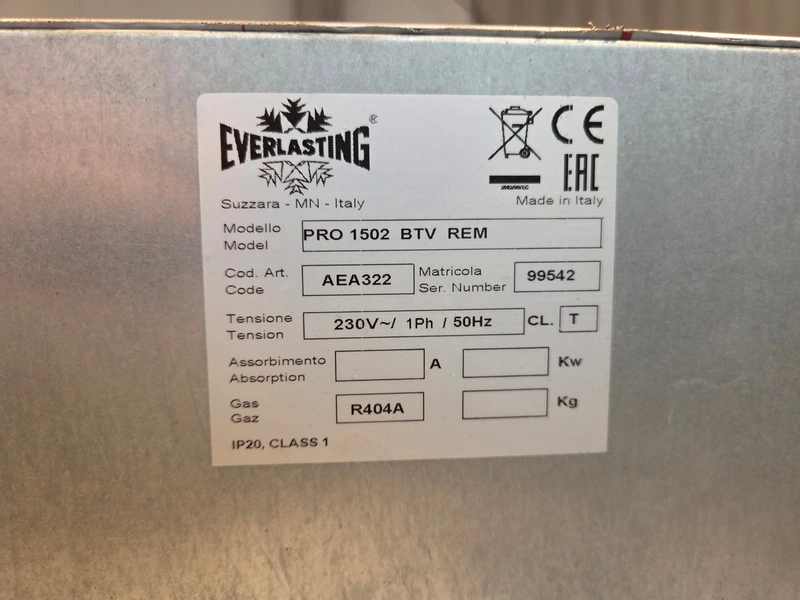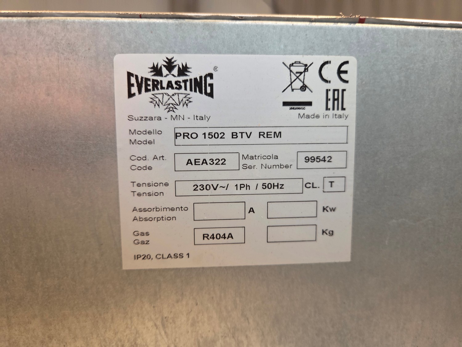 Everlasting double doors freezer, model: PRO 1502 BTV REM, serial number: 99542, 230 V, 1 Ph, 50 Hz, refrigerant: R404A, 8 floors, dimensions freezer: 1500 mm x 830 mm x 2090 mm.