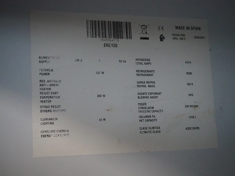 Freezer, model: ERC 130, 230 V, 1 Ph, 50 Hz, 4.6 A, 587 W, refrigerant: R290/150 g, freezing capacity: 220 kg/24 h, volume: 1310 liter, 4 floors, floor dimensions: 1250 mm x 500 mm, total dimensions: 1400 mm x 800 mm x 2000 mm.