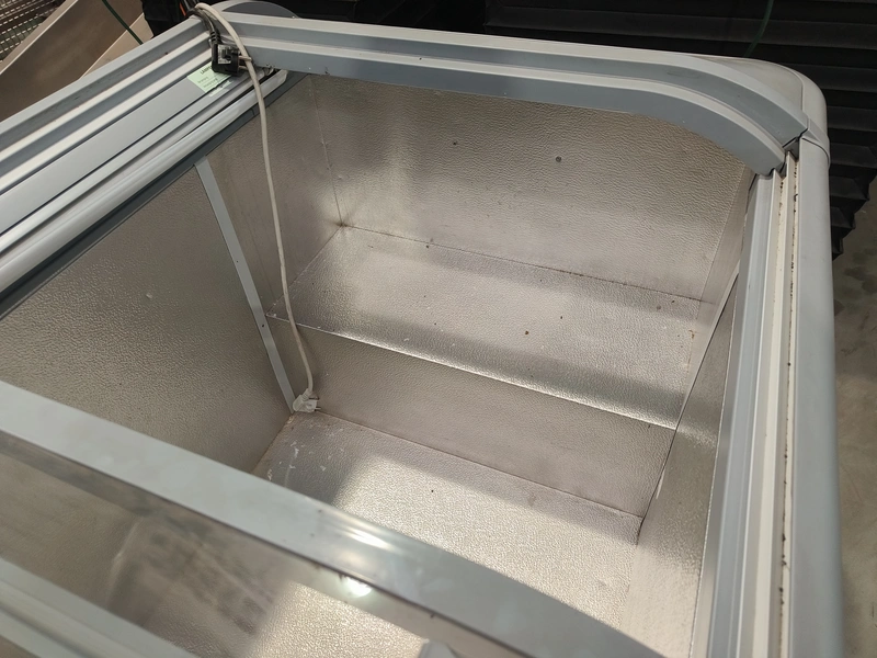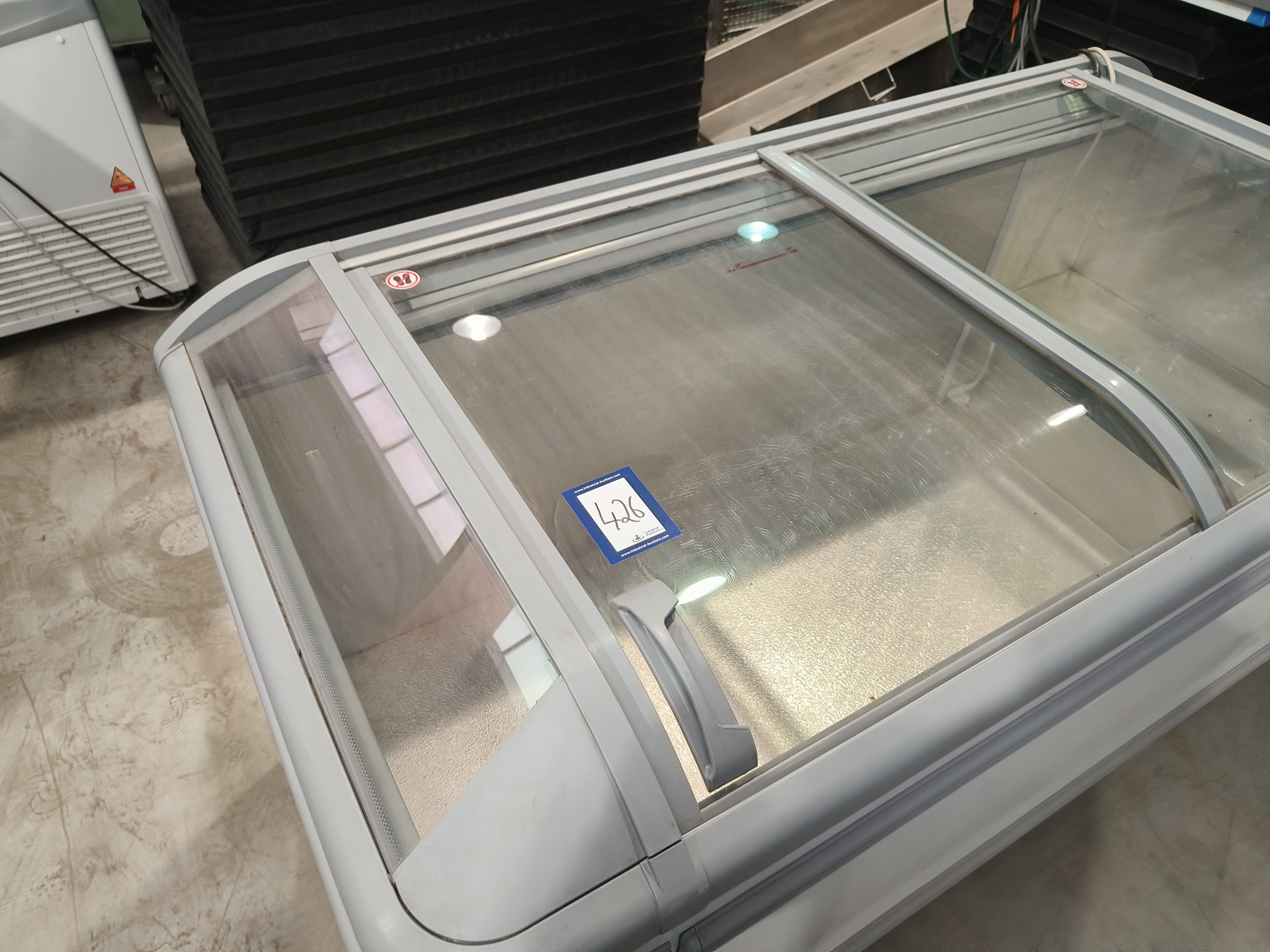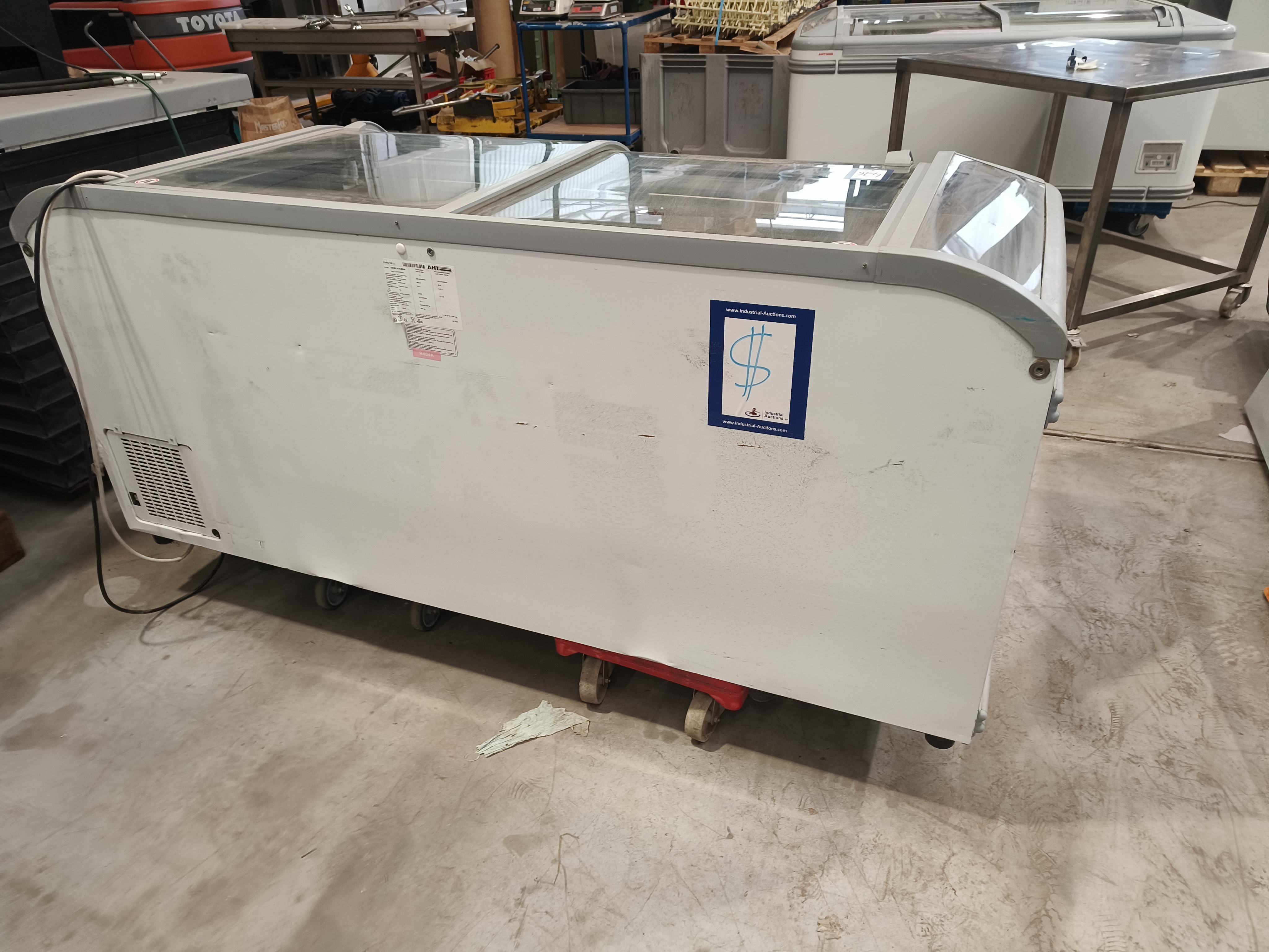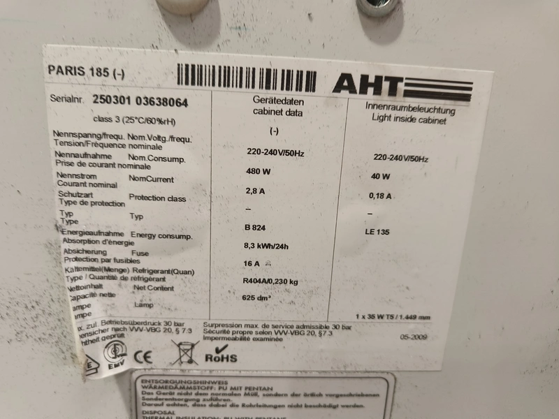 AHT Cooling Systems GmbH mobile chest freezer, type: PARIS 185(-), serial number: 250301 0368064, year of construction: 05-2009, 220-240 V, 50 Hz, 2.8 A, 480 W, refrigerant: R4040A, 0.230 kg, volume: 625 dm³, dimensions: 1820 mm x 900 mm x 1000 mm.
