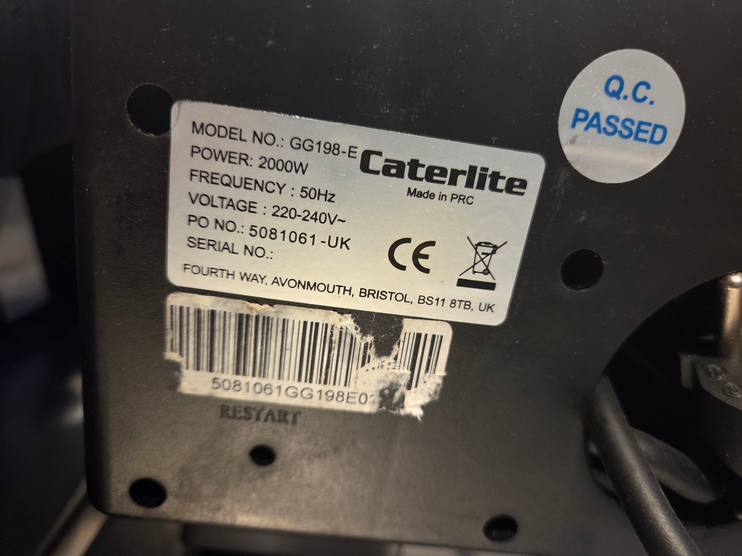 Caterlite deep fryer, model: GG198-E, 220/240 V, 50 Hz, 2000 W, dimensions: 560 mm x 220 mm x 220 mm.
