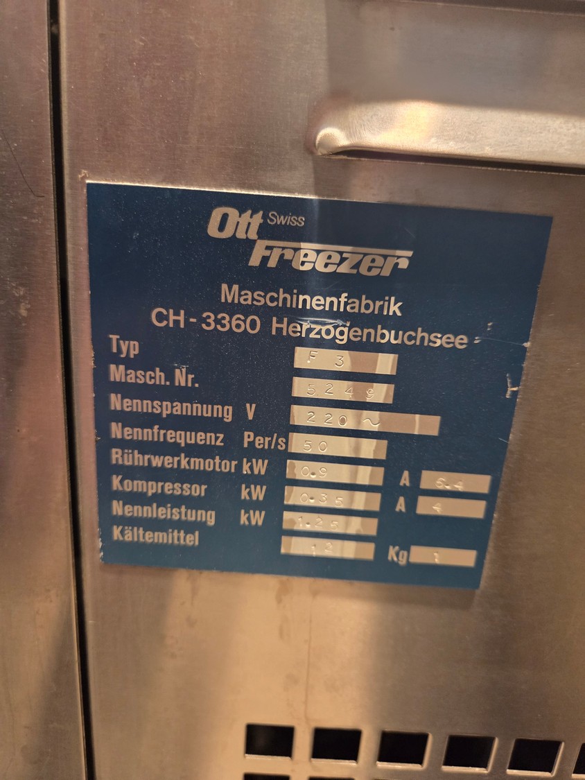 Ott freezer mobile ice machine, type: F3, number: 5249, 220 V, 4/6.4 A, 0.35/0.9 kW, dimensions: 700 mm x 420 mm x 1100 mm.