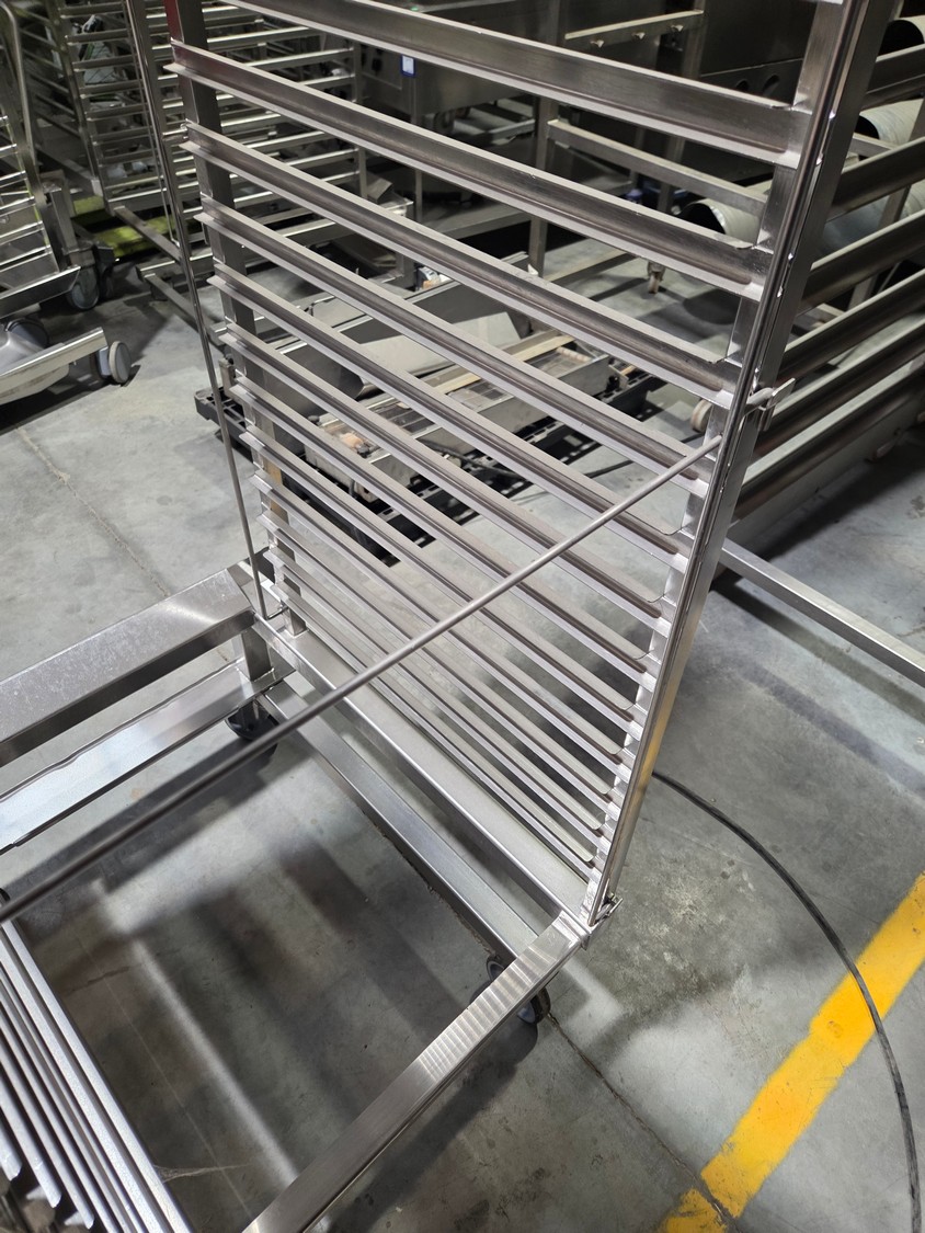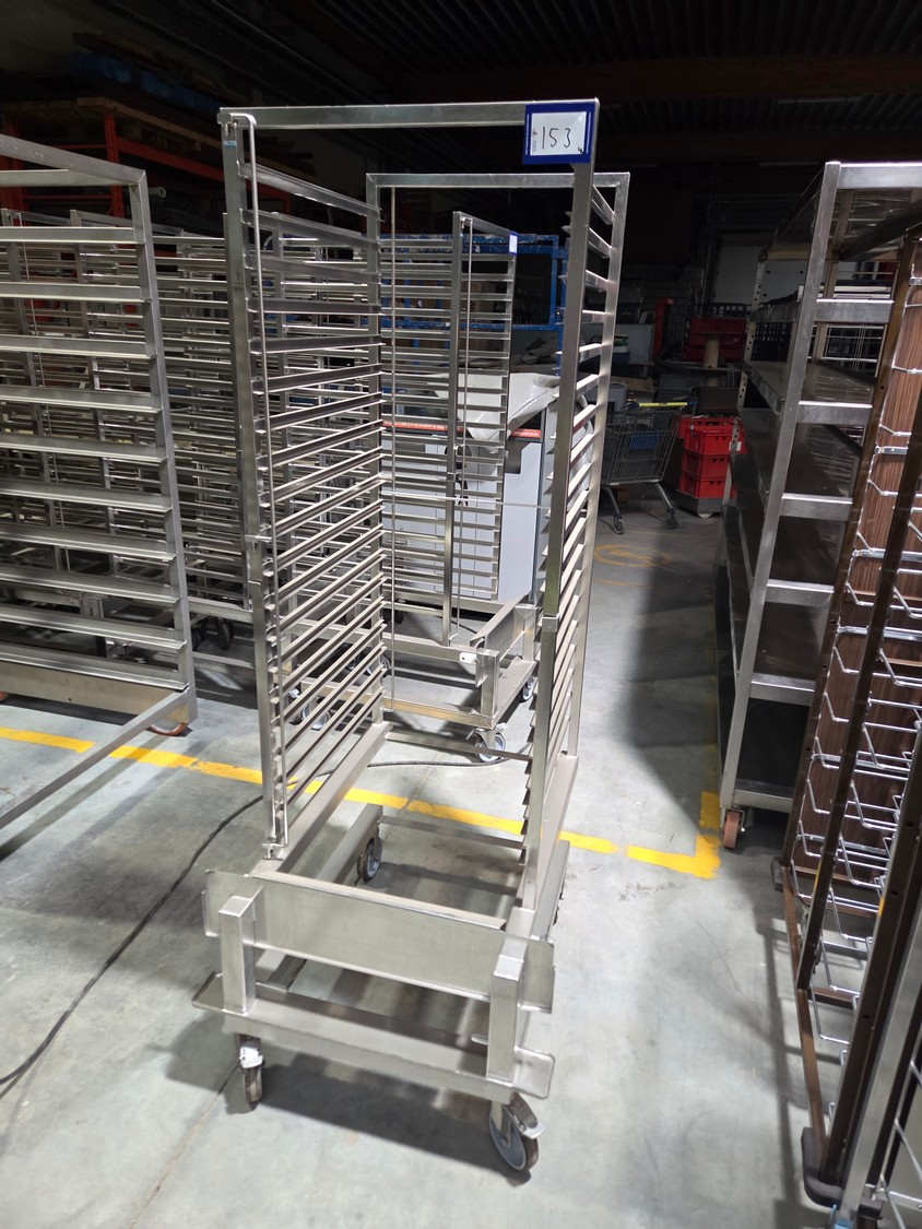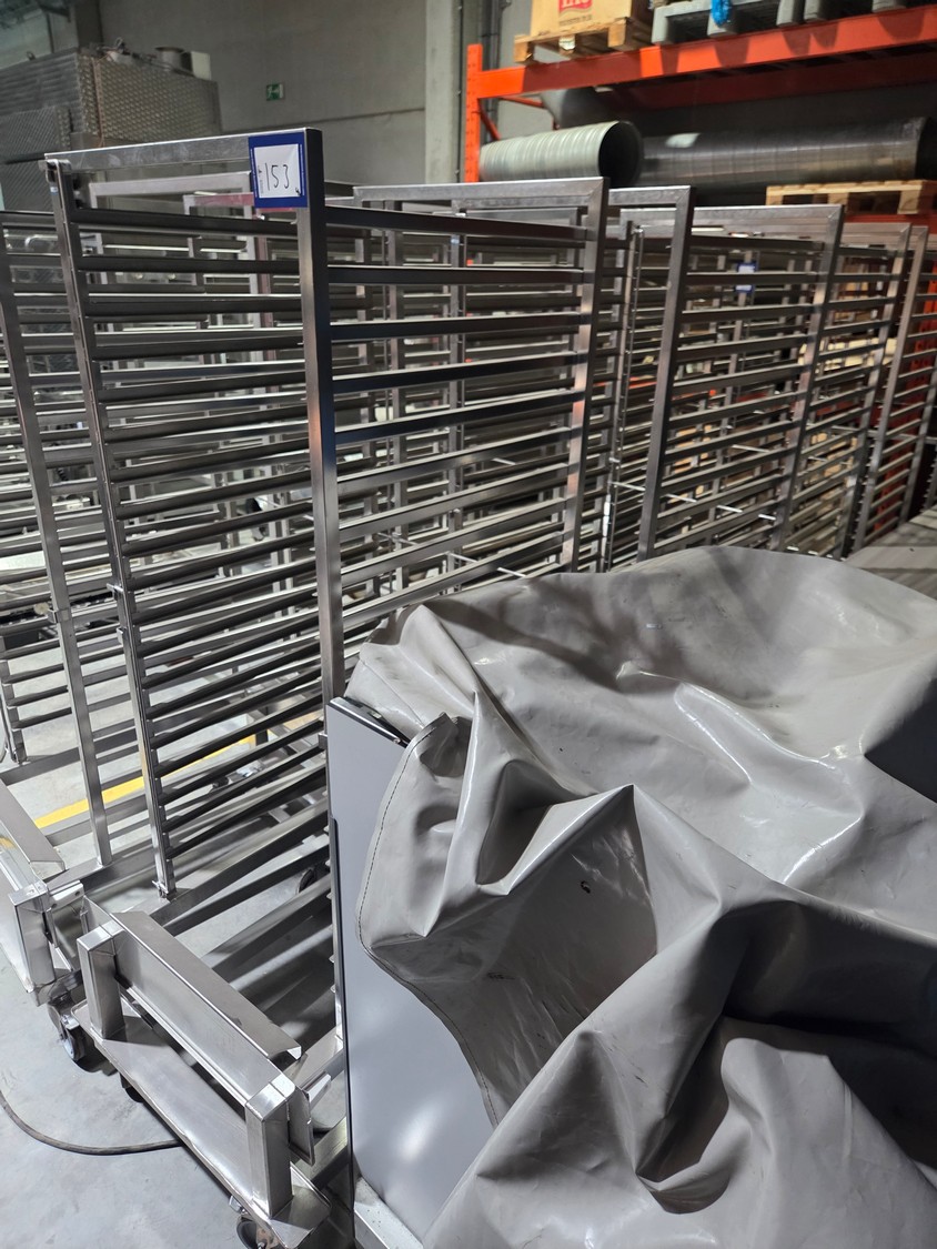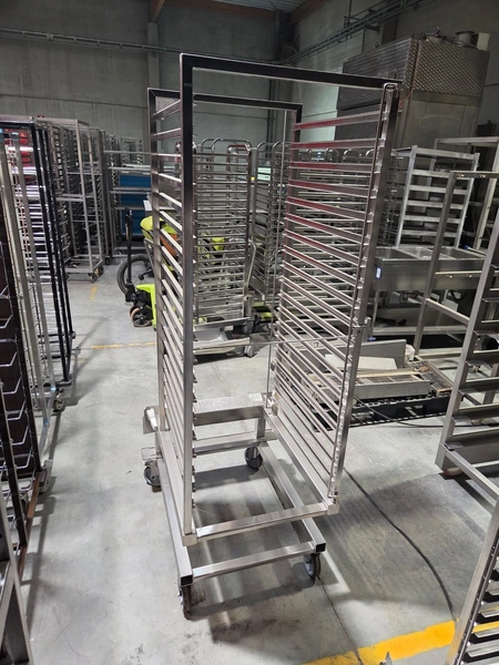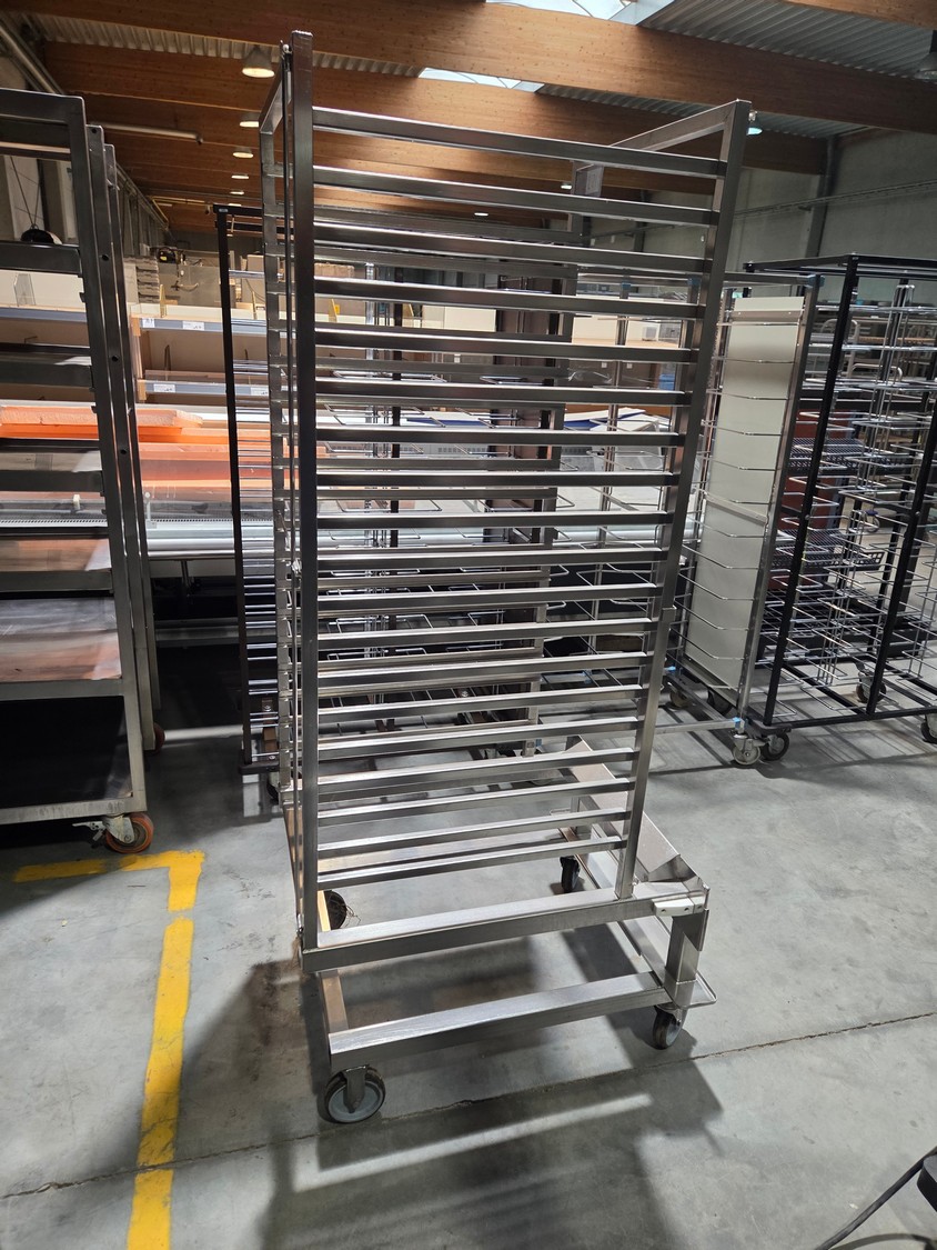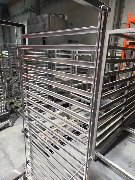 4 s/s trolleys for combi steamer, 20 floors each, dimensions floors: (20x) 650 mm x 535 mm, total dimensions: (4x) 850 mm x 750 mm x 1850 mm.