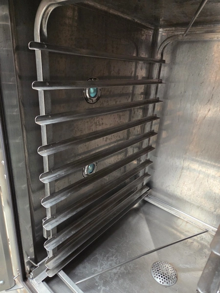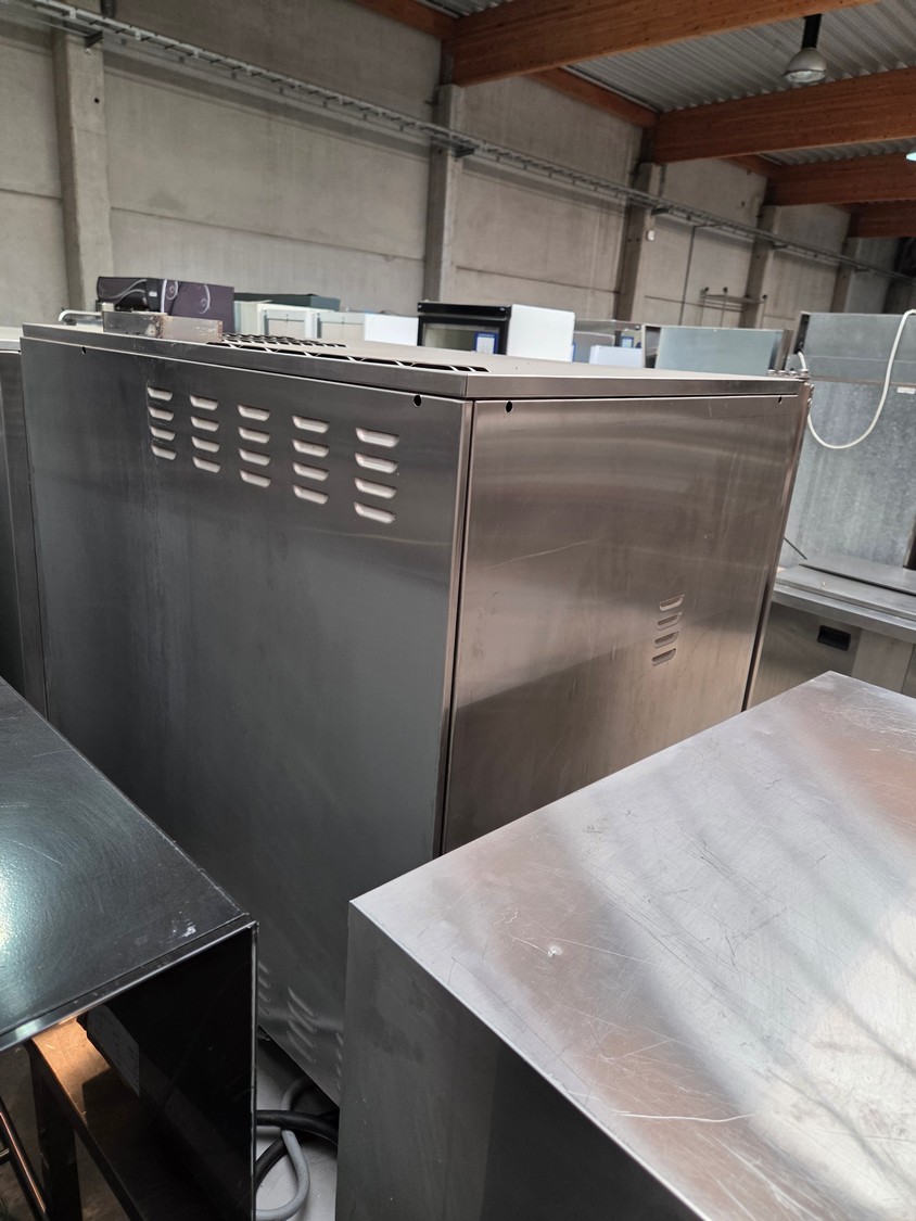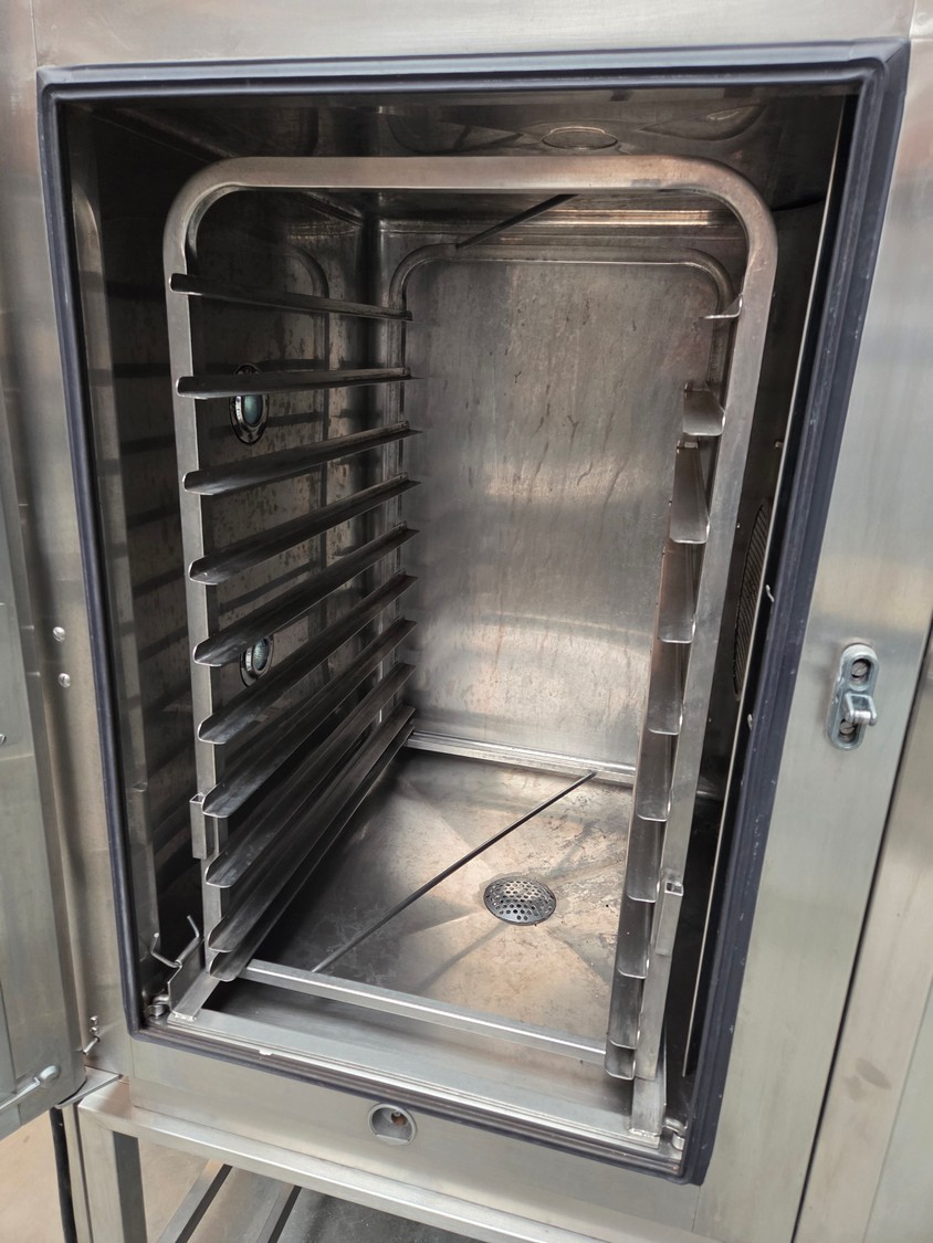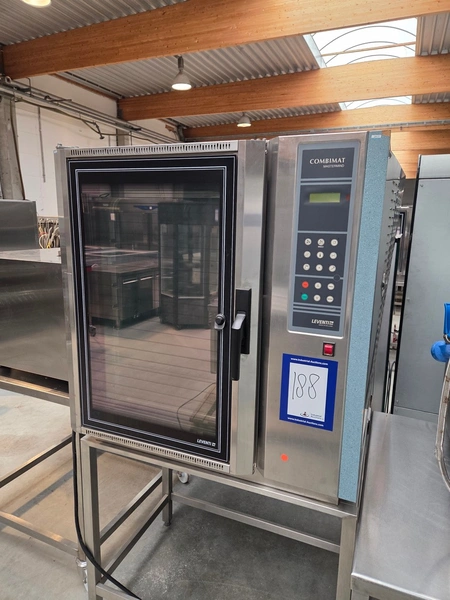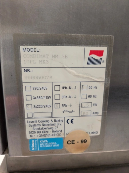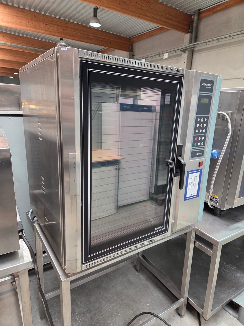 Leventi combi steamer on s/s frame, model: COMBIMAT MM 3B 10PL MK3, number: 999050076, 220/240 V, 3 Ph, 50 A, 18.5 kW, 10 floors, dimensions floors: (10x) 600 mm x 400 mm, total dimensions: 970 mm x 970 mm x 1850 mm.
