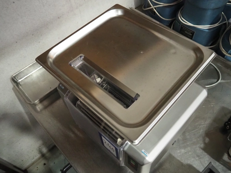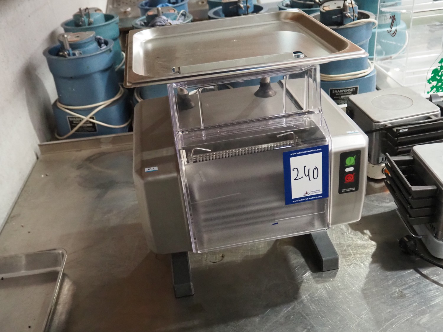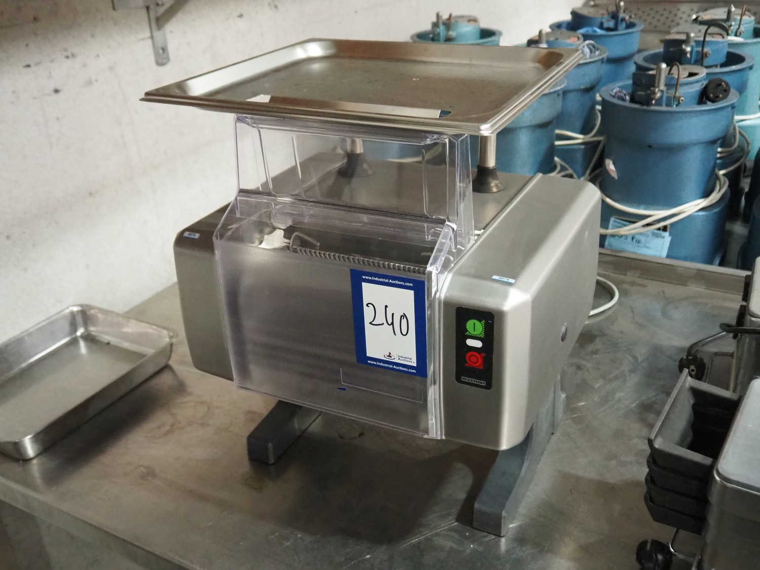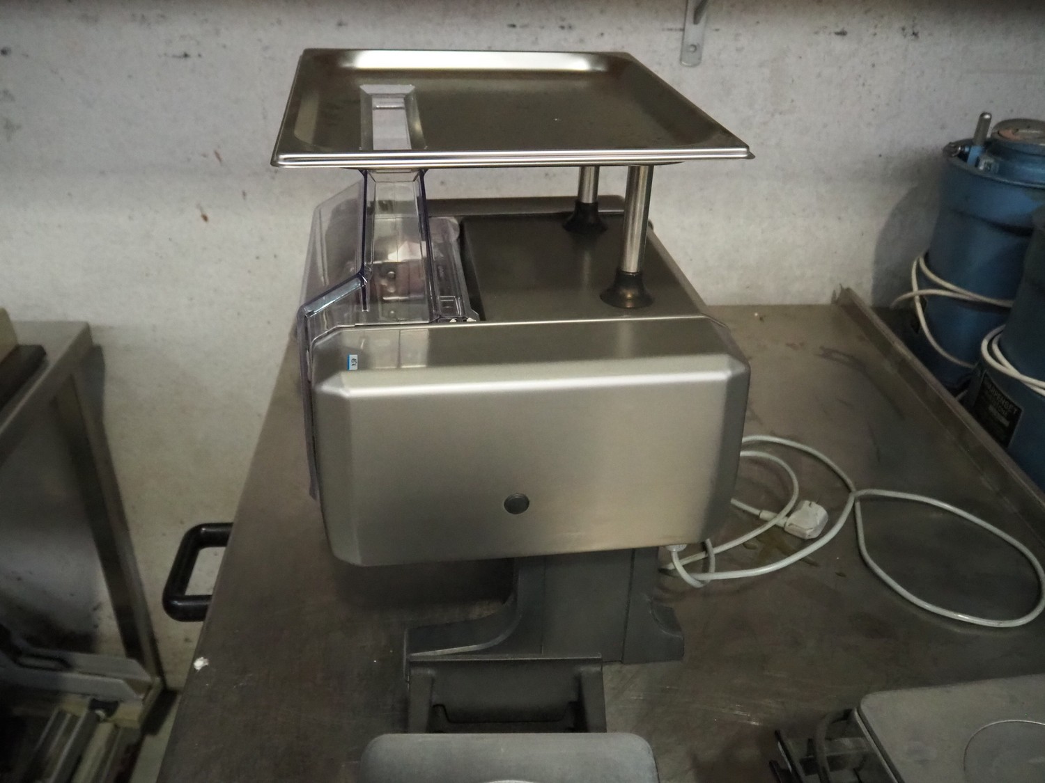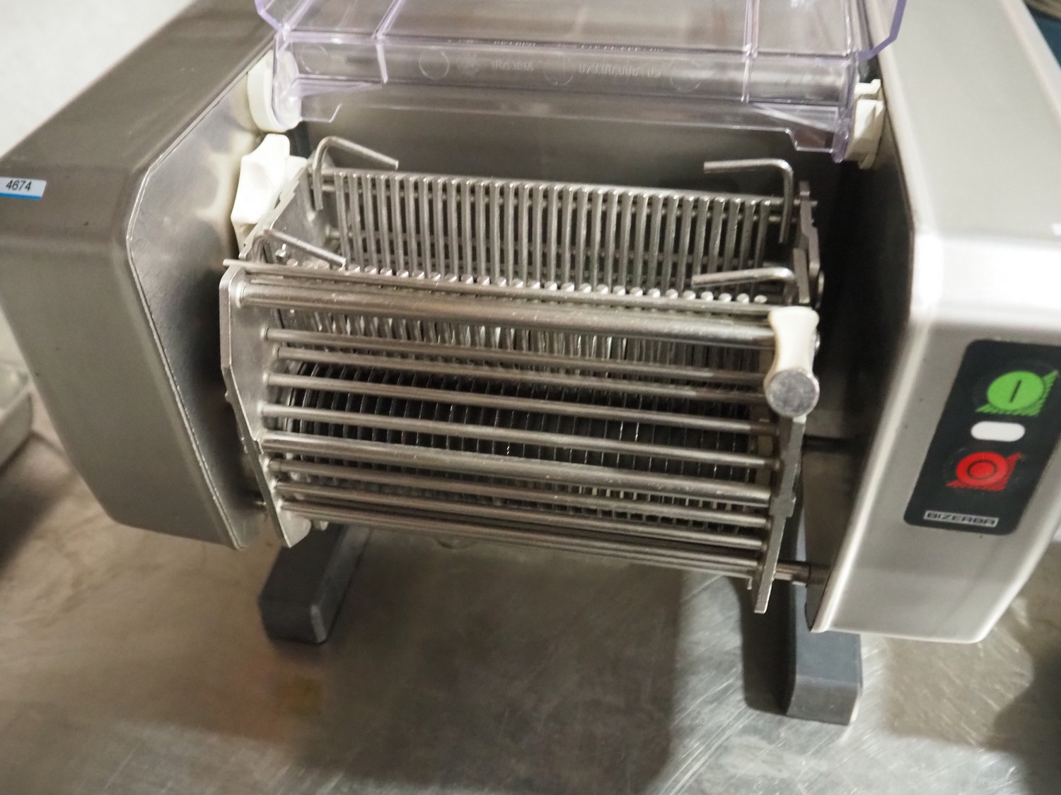 Bizerba strip cutter, type: S 111 PLUS, number: 10113761, year of construction: 2005, 230 V, 1 Ph, 50 Hz, 2.7 A, working width: 175 mm, distance between knives: 5 mm, total dimensions: 410 mm x 340 mm x 480 mm. Including extra knife set, distance between knives: 3 mm.