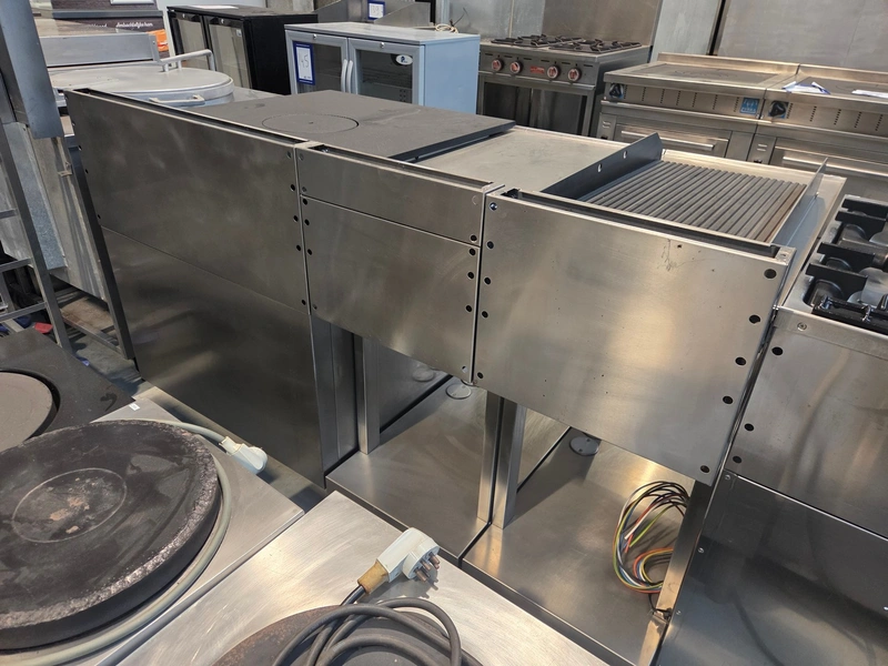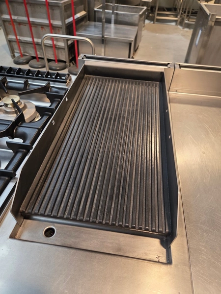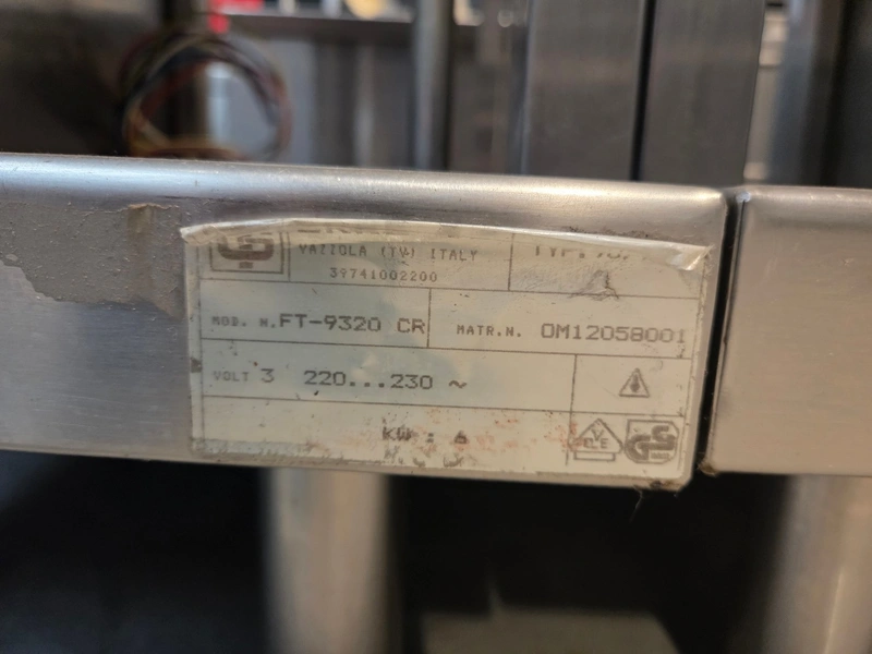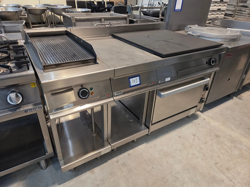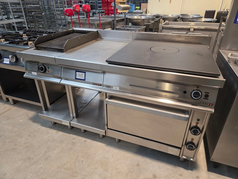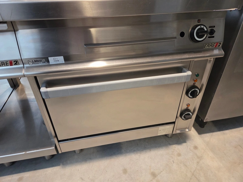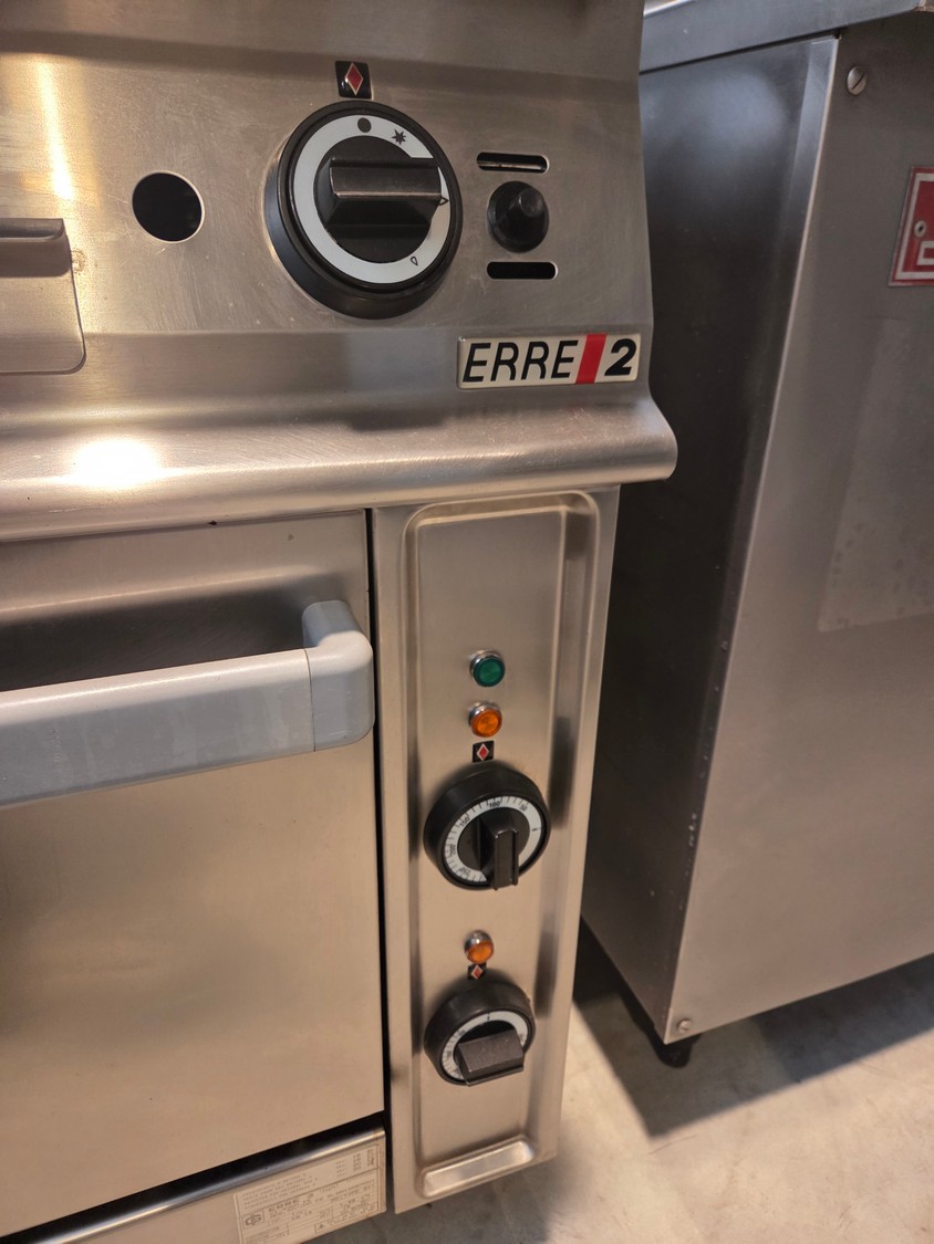 Erre 2 srl gas stove, grill and oven, model: 90/200, type: B11, number: OM12057001, 400 V, 3 Ph, 50 Hz, 1.48 m³ per hour, 3 floors, dimensions each floor: 630 mm x 540 mm, total dimensions: 1600 mm x 910 mm x 1000 mm.