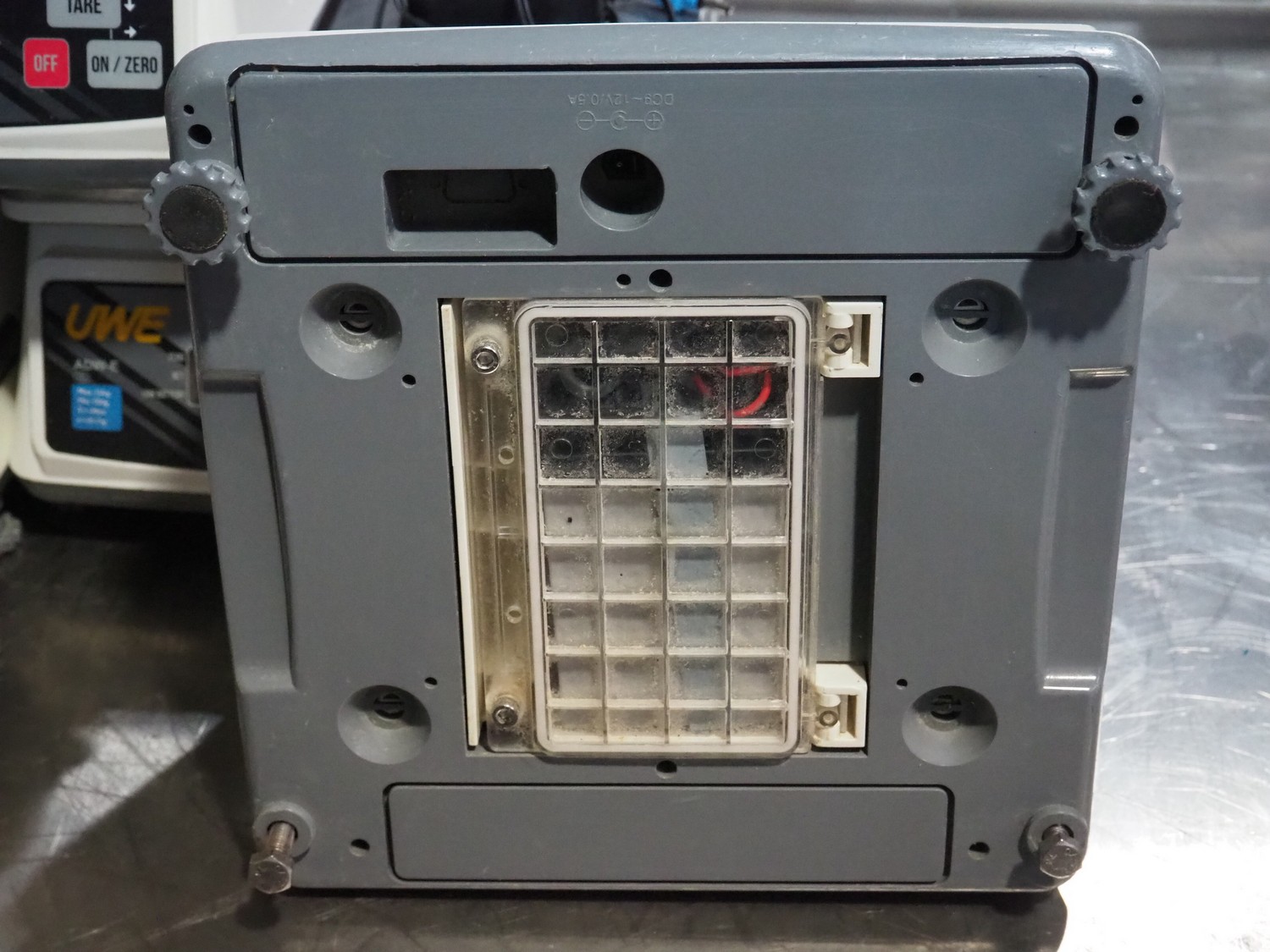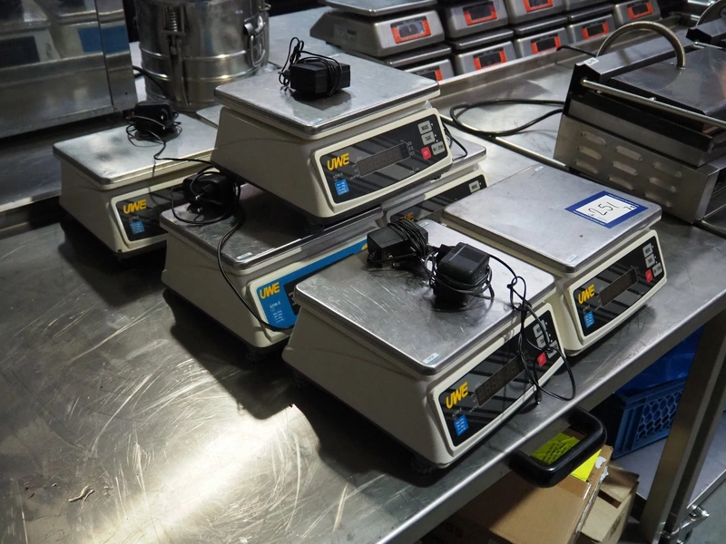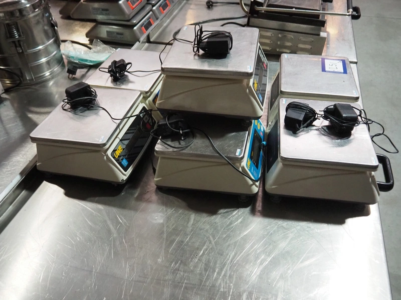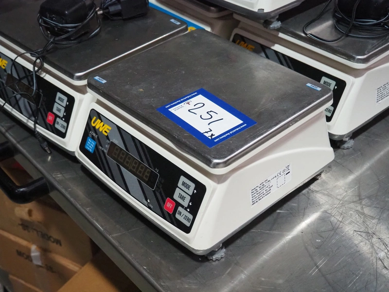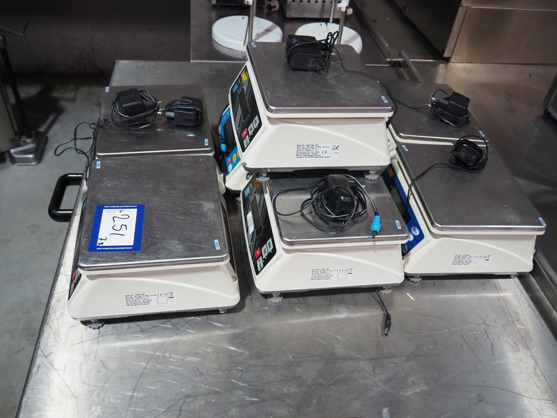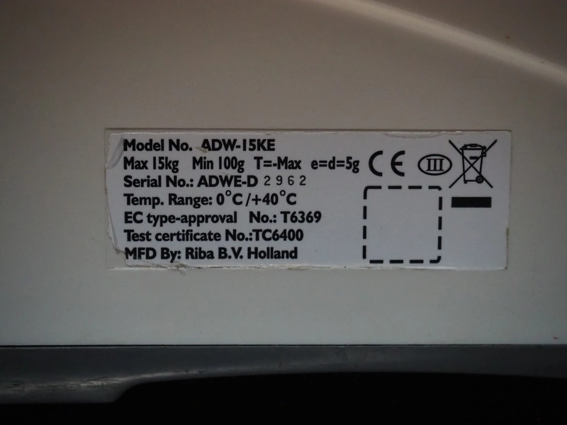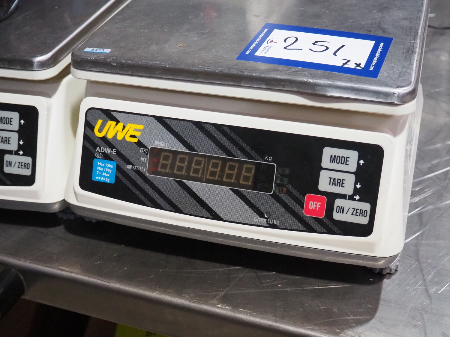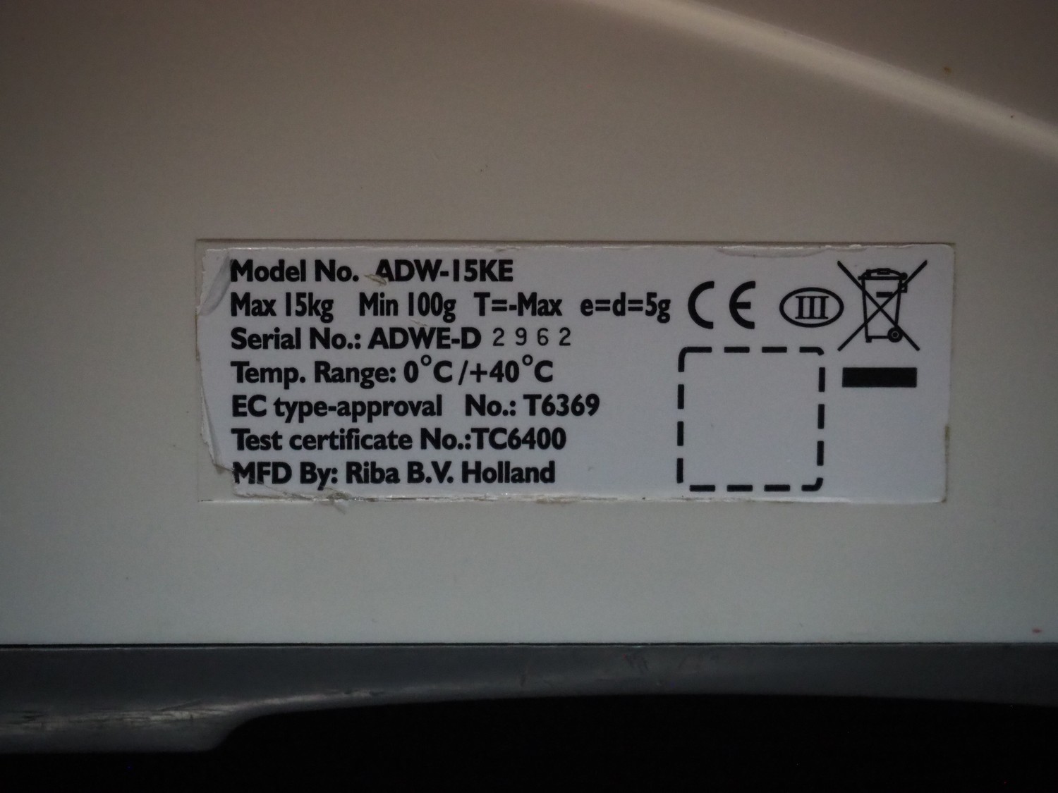 7 Uwe/Riba B.V. weighing scales, model: ADW-15KE, maximum weight: 15 kg, minimum weight: 100 gram, e=d= 5 gram, dimensions: (7x) 270 mm x 270 mm x 150 mm.