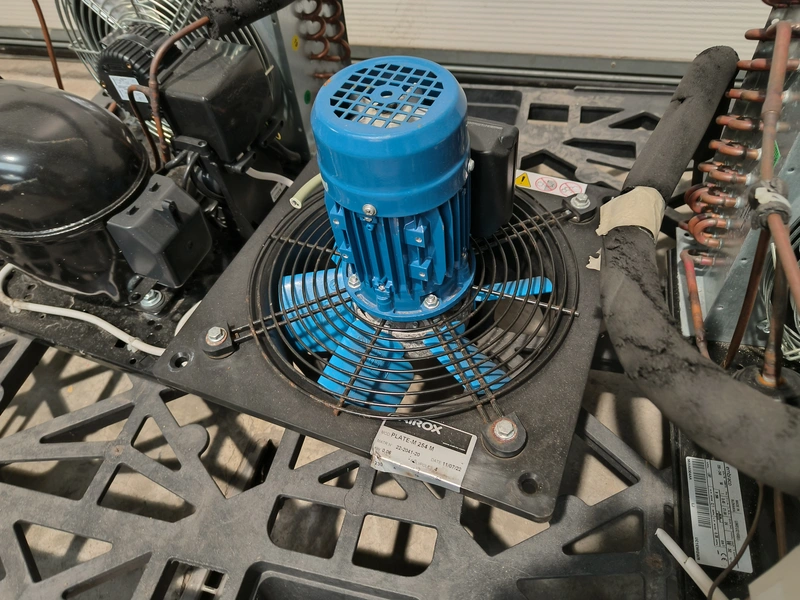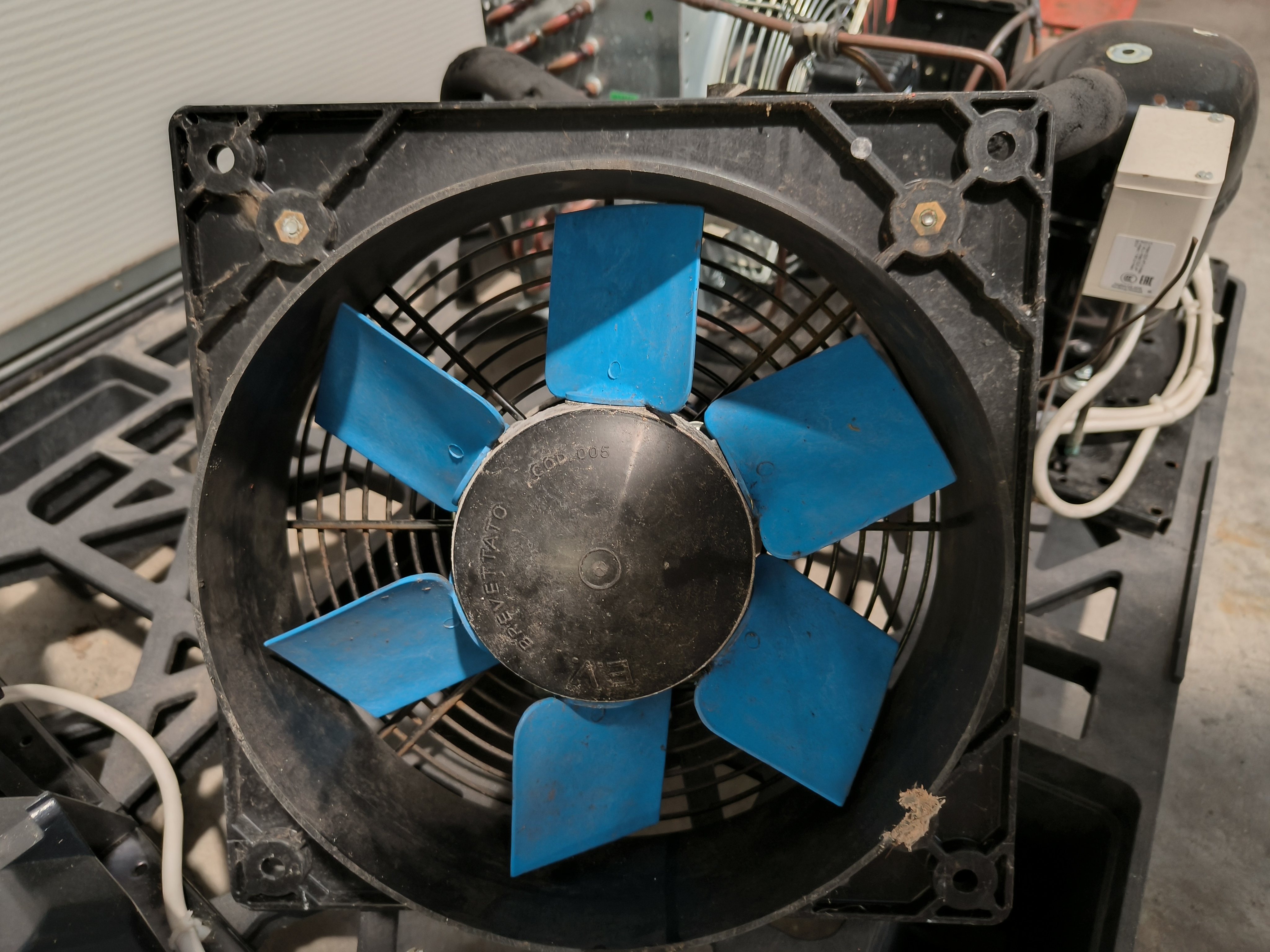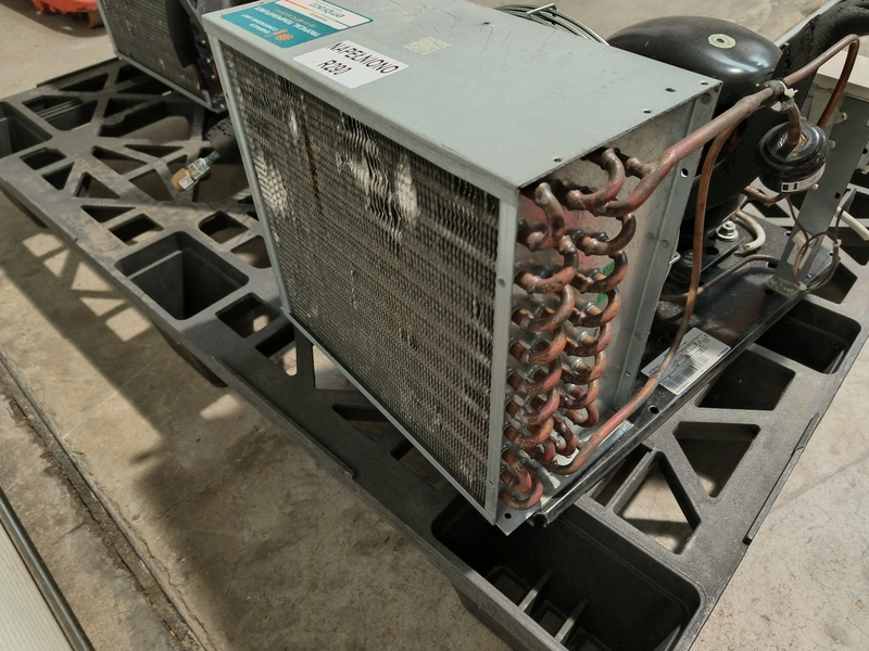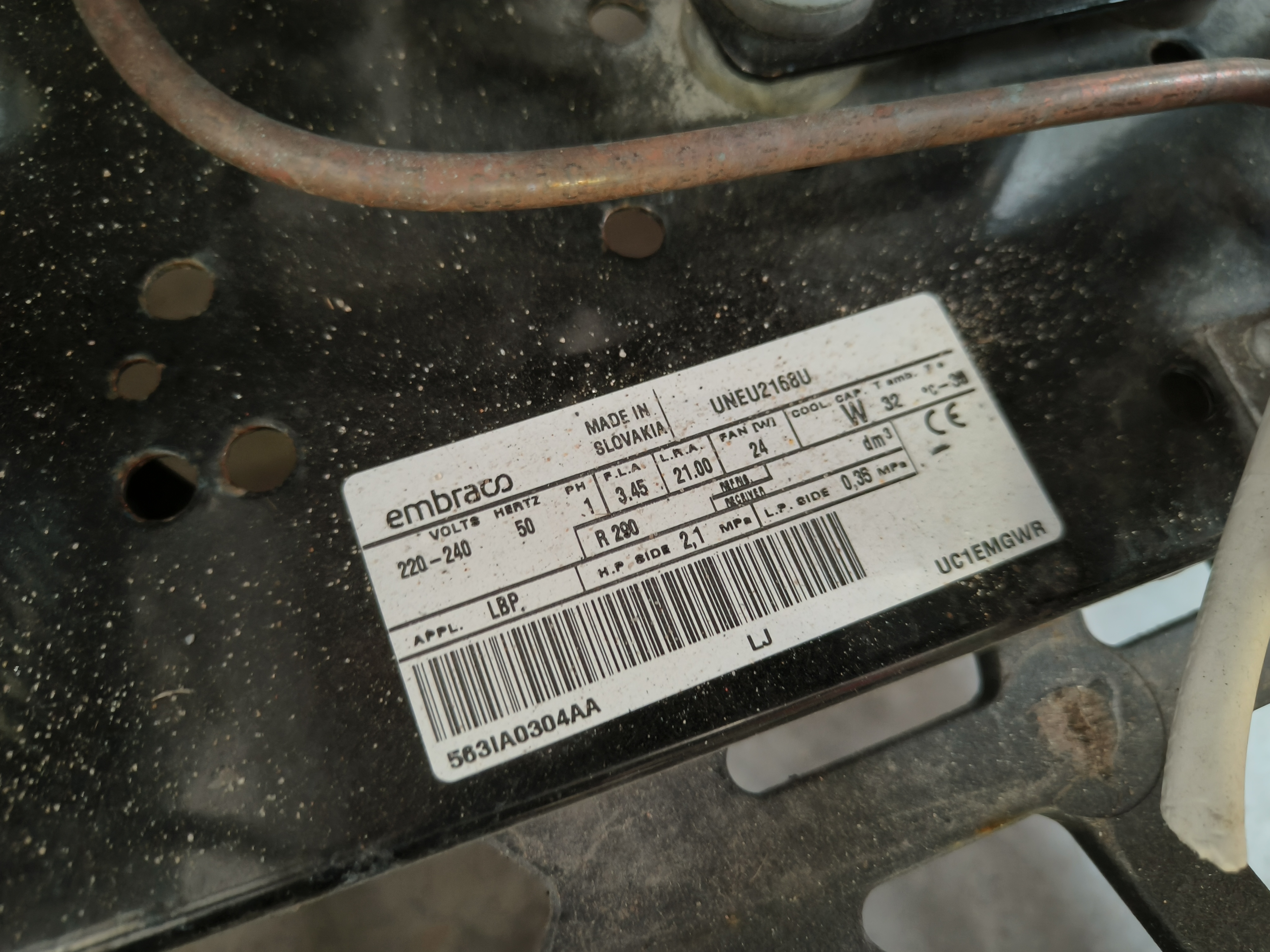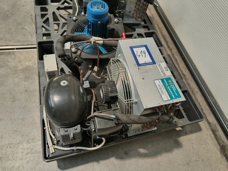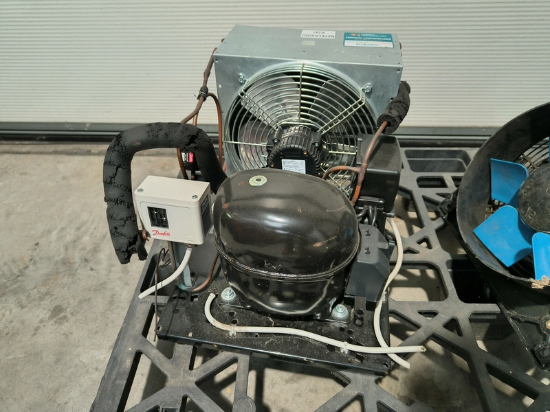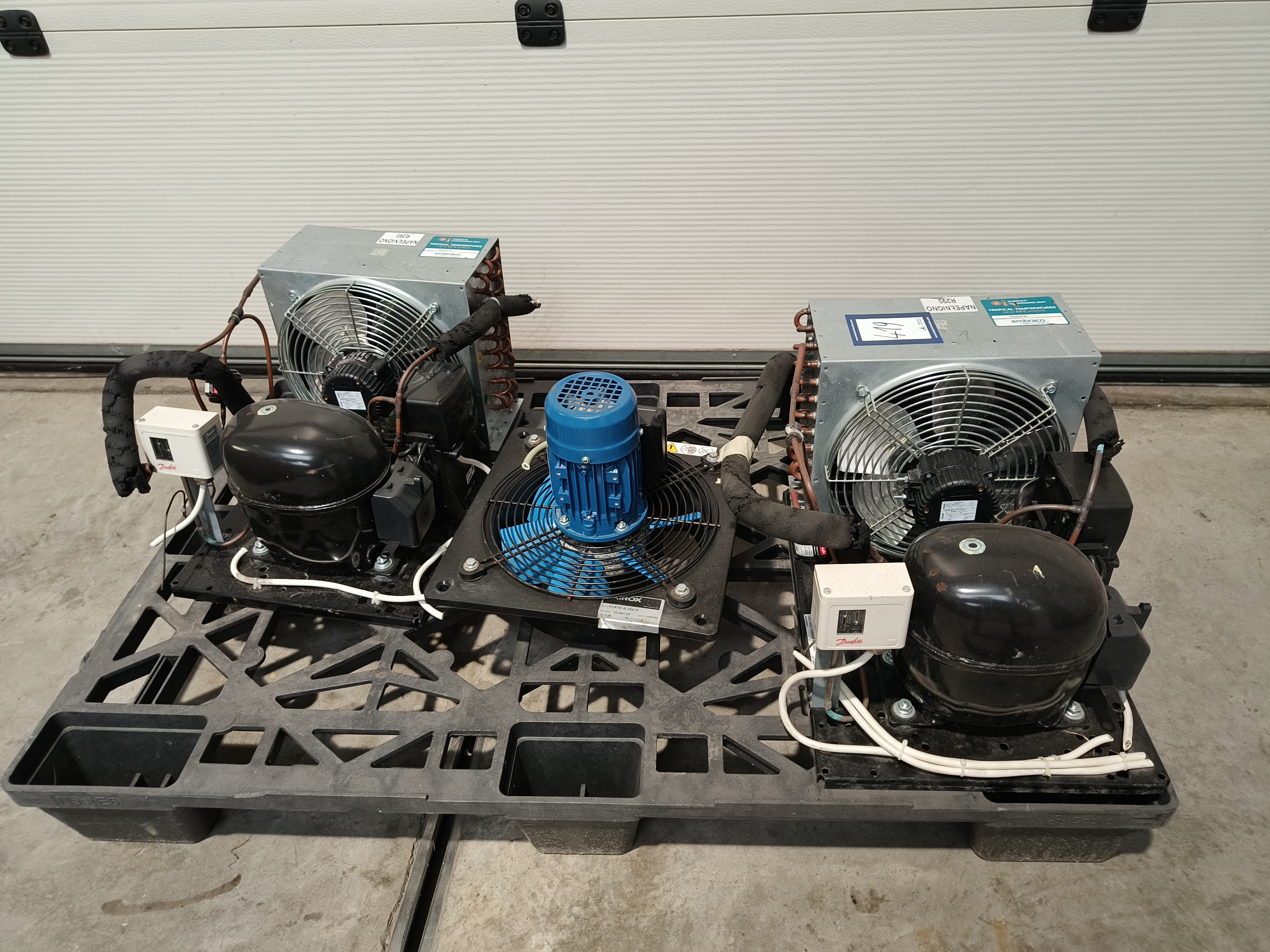 2 Embraco cooling compressors with fans, model: UNEU2168U, number: 563IA0304AA, 220/240 V, 1 Ph, 50 Hz, dimensions: 340 mm x 340 mm x 300 mm, 500 mm x 400 mm x 340 mm.