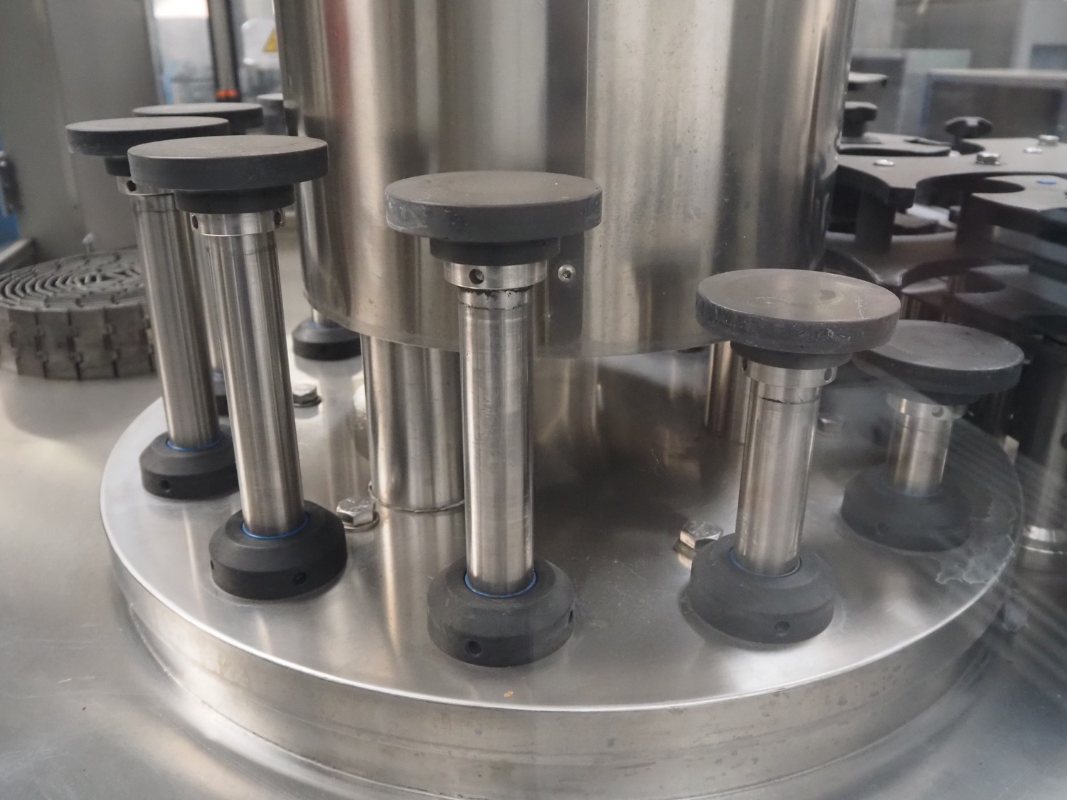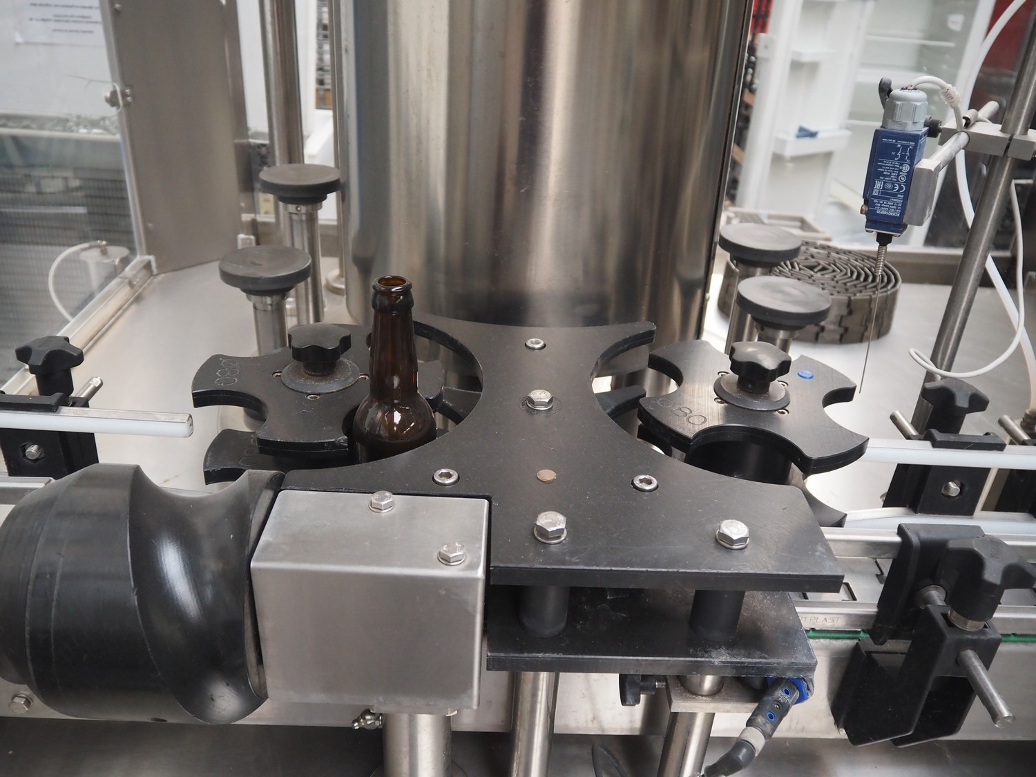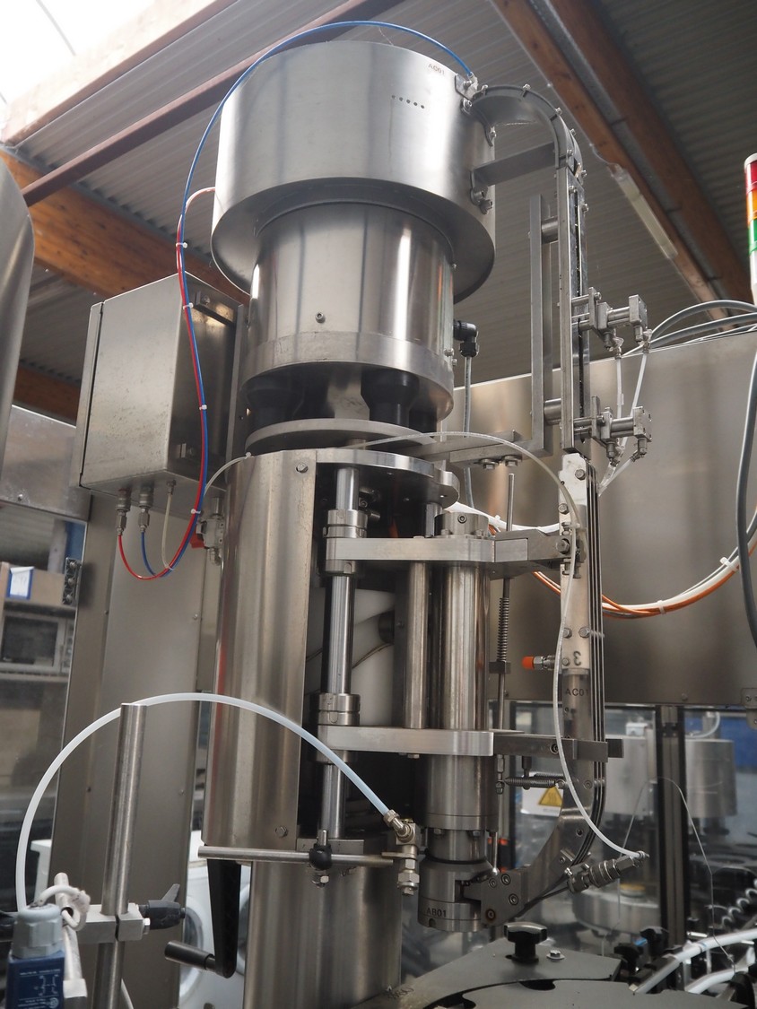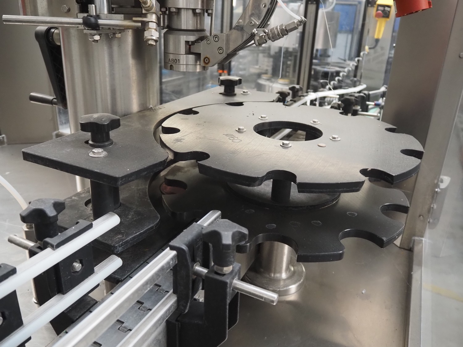 Cimec filling and closing machine for bottles, type: MO.LD.12.1EAGLE C, serial number: 2032, year of construction: 2020, 400 V, 3 Ph, 50 Hz, 4.5 kW, s/s belt, belt width: 80 mm, bottles: Ø 60 mm, 12 filling stations, total dimensions: 5100 mm x 1600 mm x 2600 mm. Without rollies.