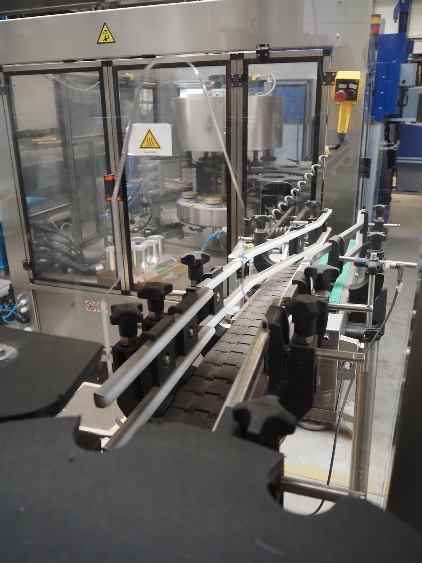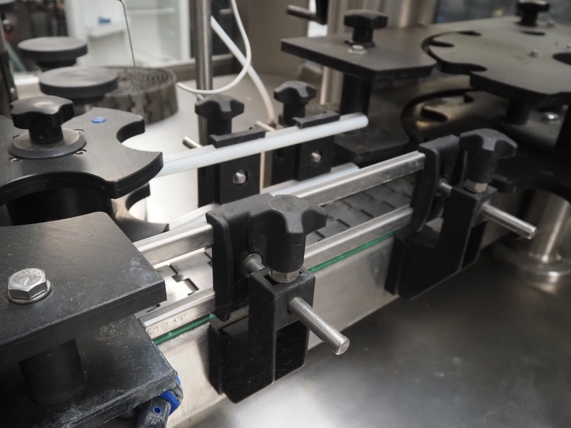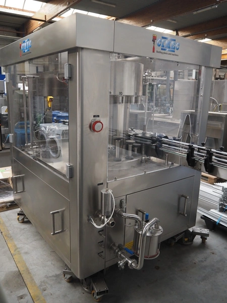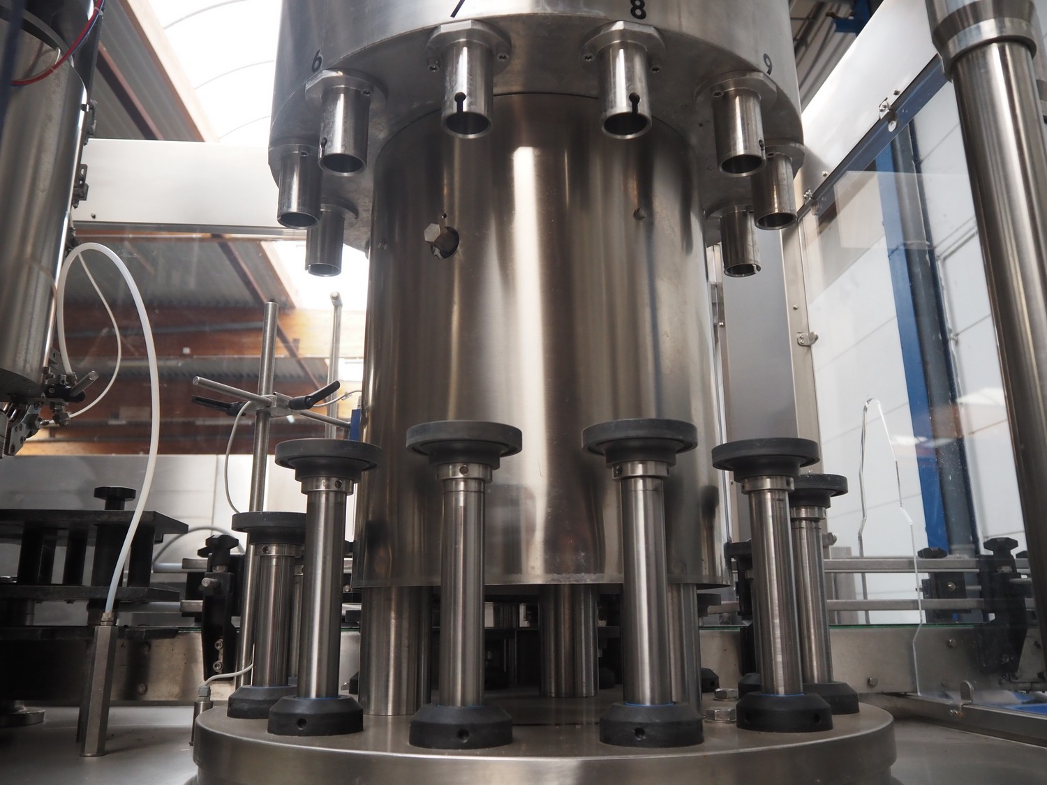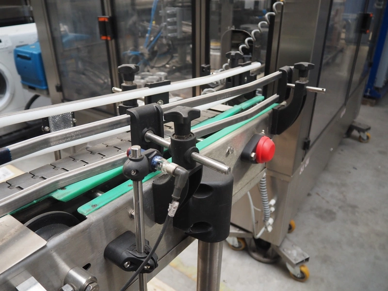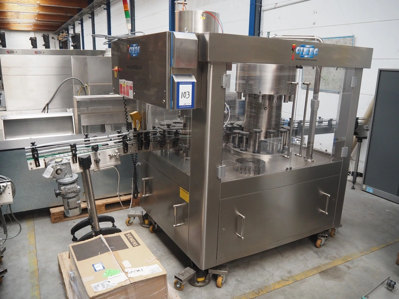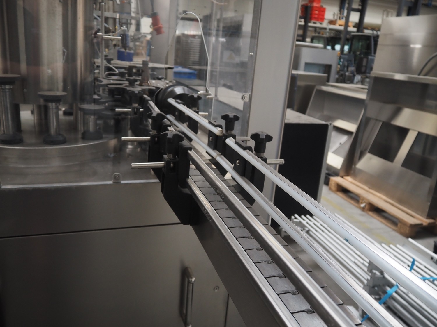 Cimec filling and closing machine for bottles, type: MO.LD.12.1EAGLE C, serial number: 2032, year of construction: 2020, 400 V, 3 Ph, 50 Hz, 4.5 kW, s/s belt, belt width: 80 mm, bottles: Ø 60 mm, 12 filling stations, total dimensions: 5100 mm x 1600 mm x 2600 mm. Without rollies.