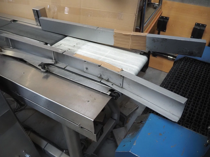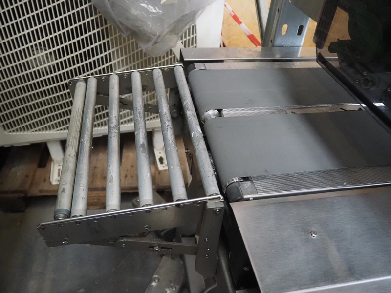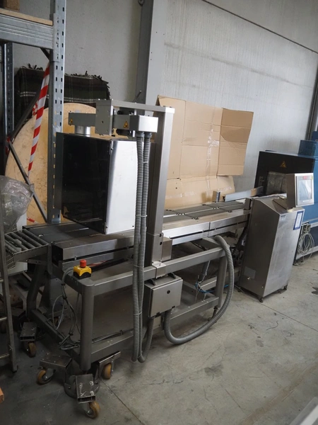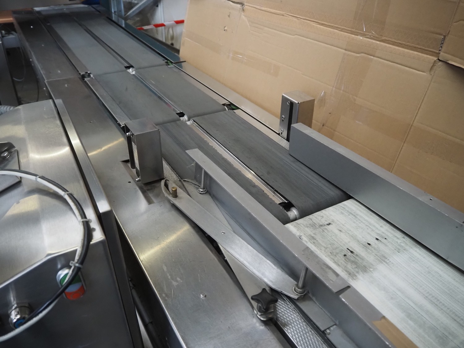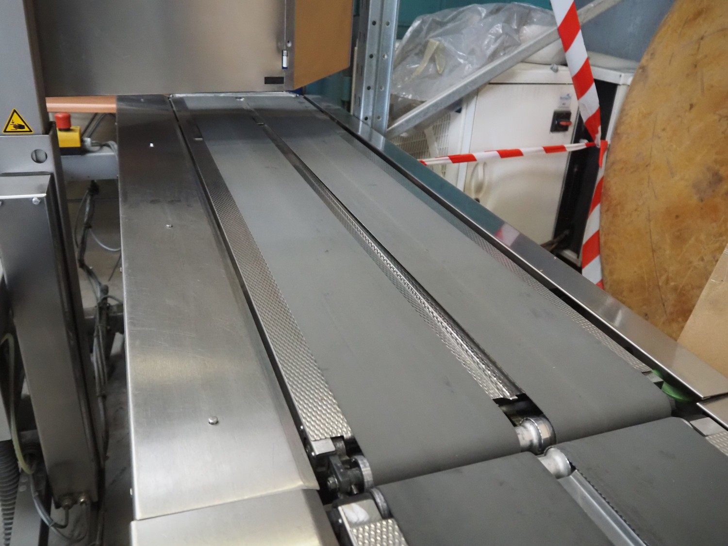 Bizerba checkweigher with labeller, number: 10743142, 230 V, 50 Hz, 2.4 A, plastic belt, belt width: (2x) 135 mm and 30 mm, labeller number: 10743131, total dimensions: 3550 mm x 950 mm x 1750 mm. Without rollies.