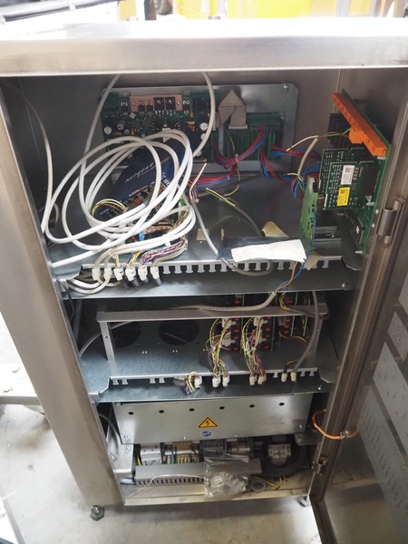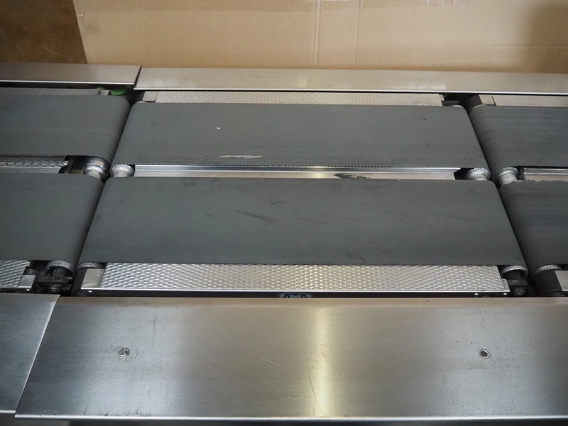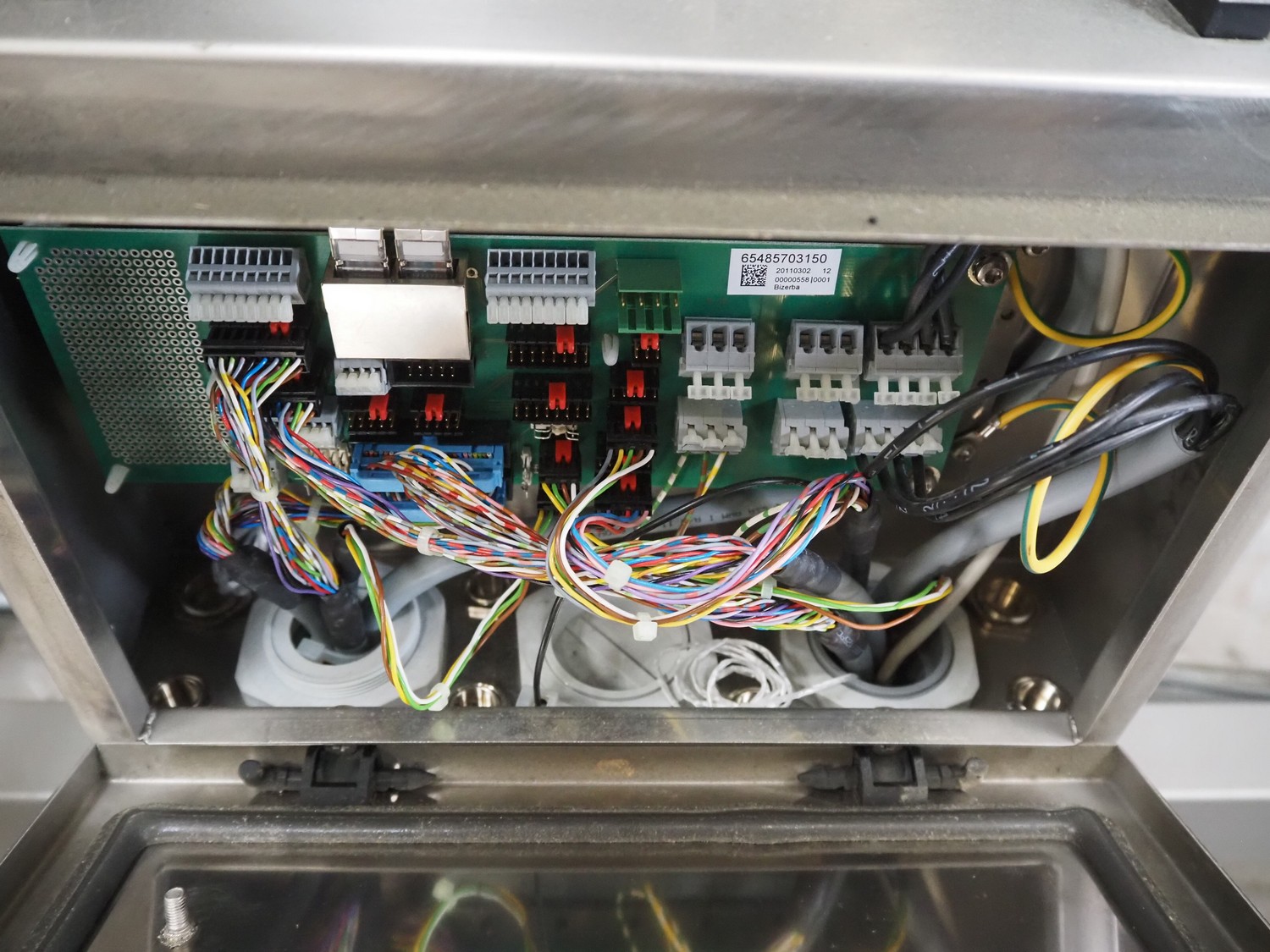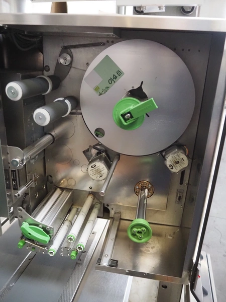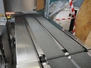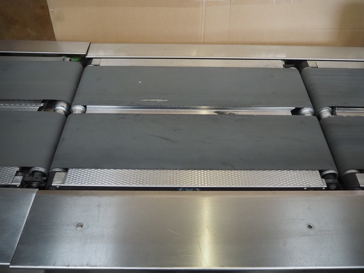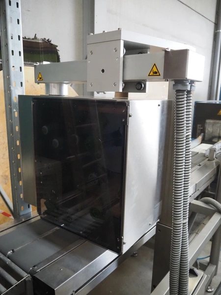 Bizerba checkweigher with labeller, number: 10743142, 230 V, 50 Hz, 2.4 A, plastic belt, belt width: (2x) 135 mm and 30 mm, labeller number: 10743131, total dimensions: 3550 mm x 950 mm x 1750 mm. Without rollies.