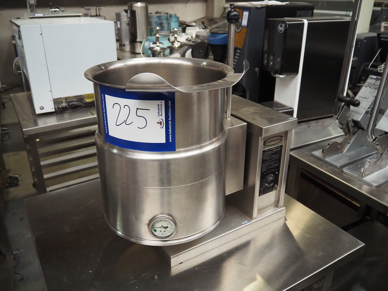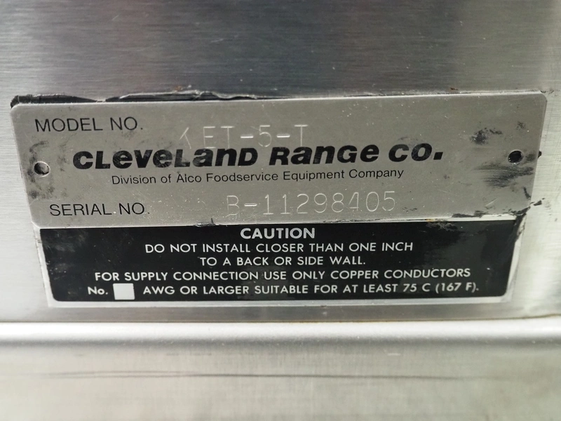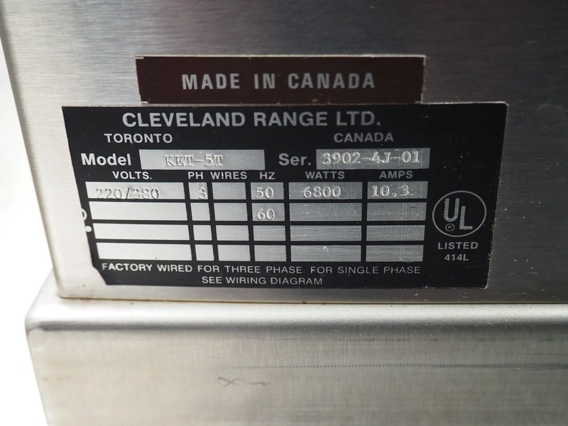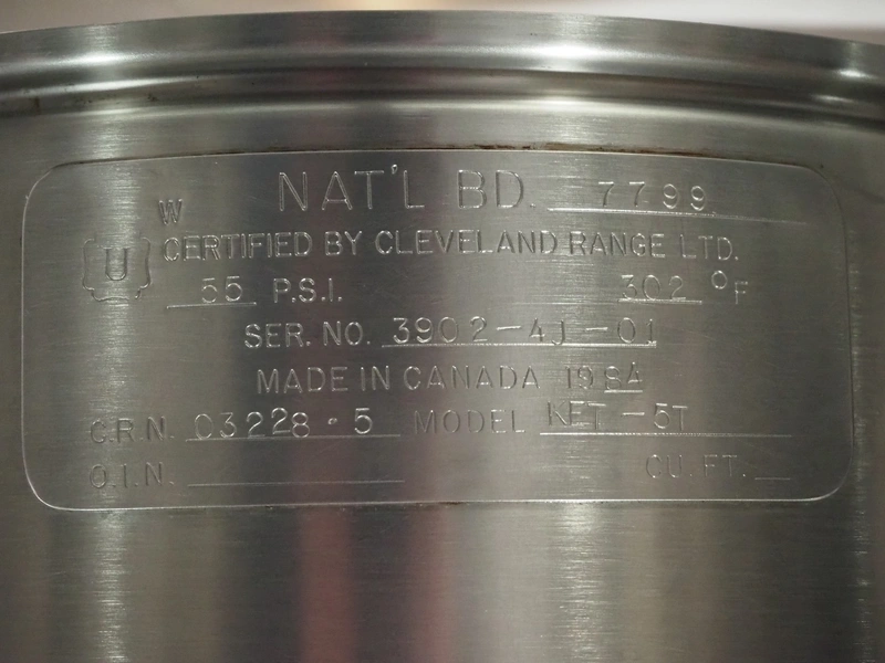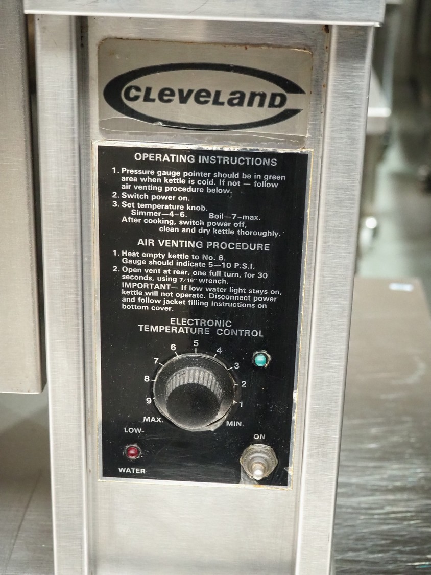 Cleveland cooking vessel, model: KET-5T, serial number: 3902-4J-01, 220/380 V, 3 Ph, 50/60 Hz, 10.3 A, 6800 W, inside dimensions: Ø 350 mm x 300 mm, total dimensions: 600 mm x 320 mm x 600 mm.