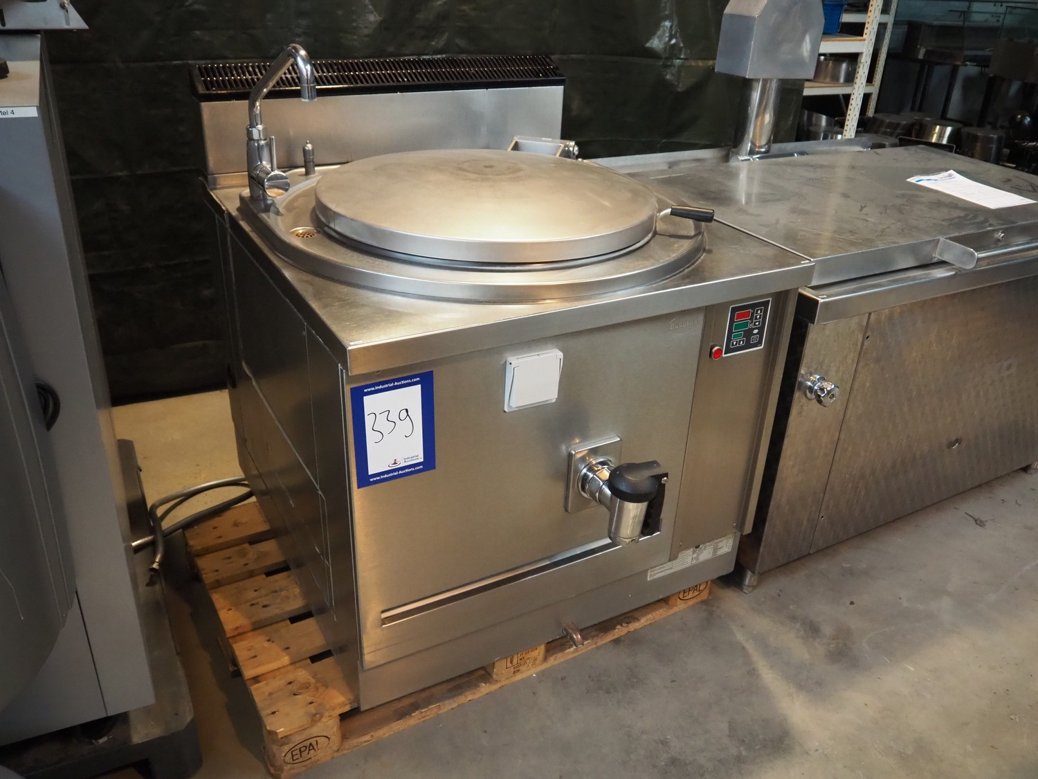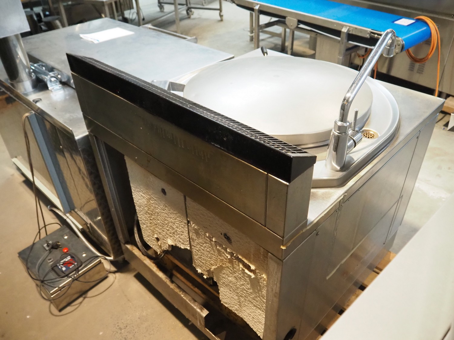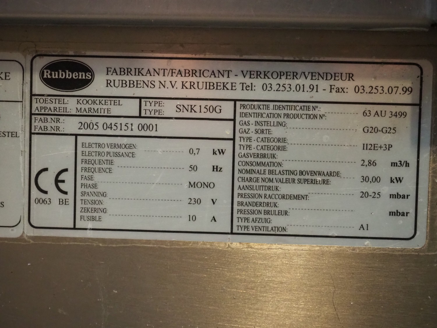 Rubbens cooking vessel, type: SNK150G, number: 2005 045151 0001, 230 V, 50 Hz, 10 A, 0.7 kW, 2.86 m³ per hour, volume: 150 liter, total dimensions: 1000 mm x 1250 mm x 1250 mm.