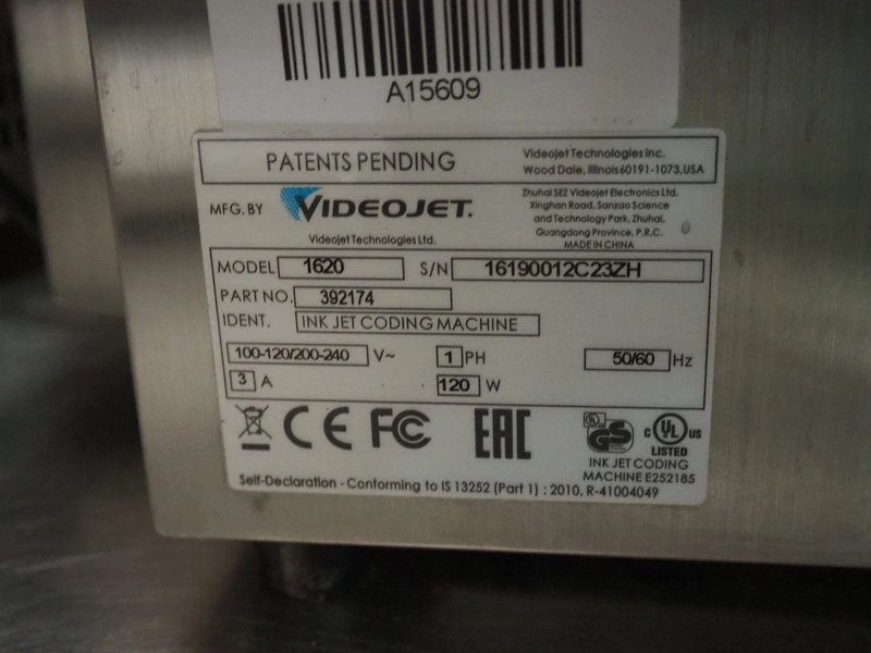 Videojet inkjet printer, model: 1620, serial number: 16190012C23ZH, 100-120/200-240 V, 1 PH, 50/60 Hz, 3 A, 120 W, dimensions: 450 mm x 350 mm x 850 mm.