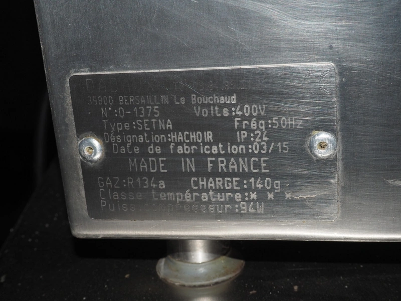Dadaux grinder, type: SETNA, serial number: 0-1375, year of construction: 03/15, 400 V, 50 Hz, refrigerent: R134a, plate diameter: 80 mm, total dimensions: 550 mm x 450 mm x 500 mm.