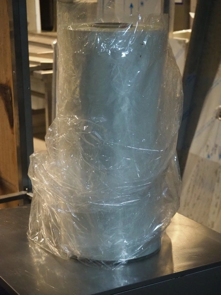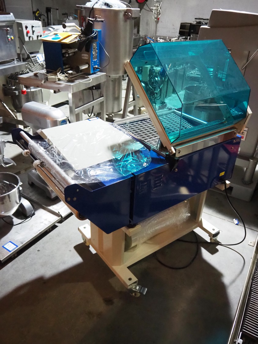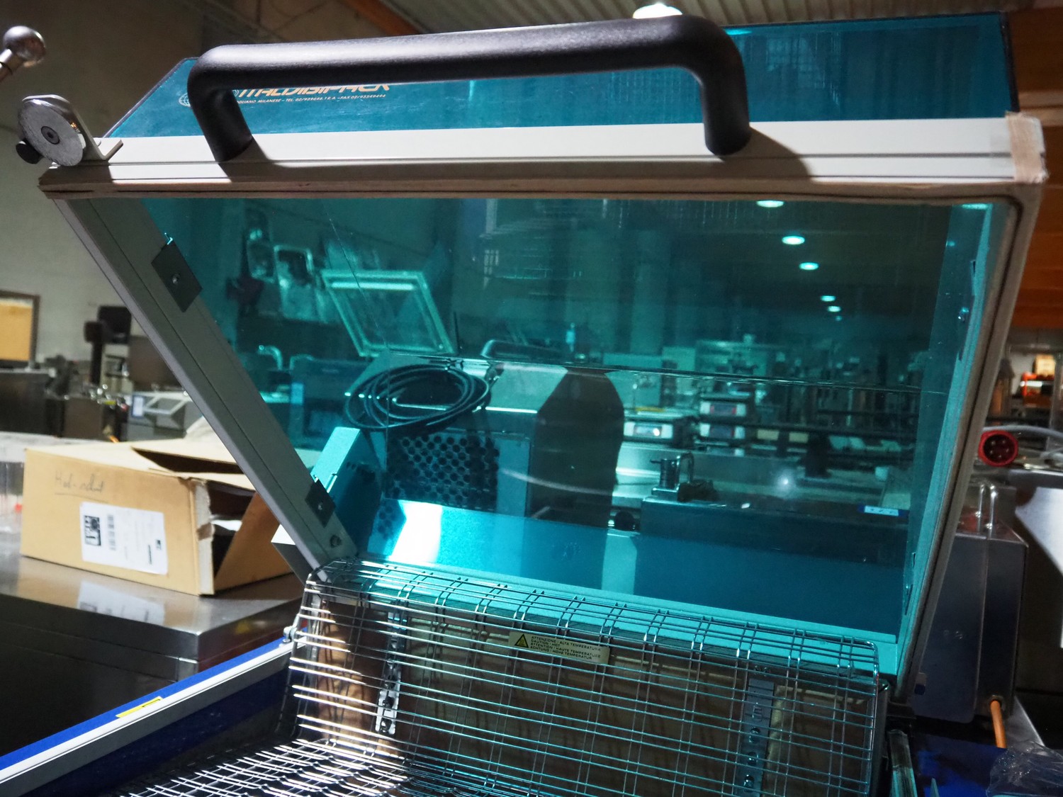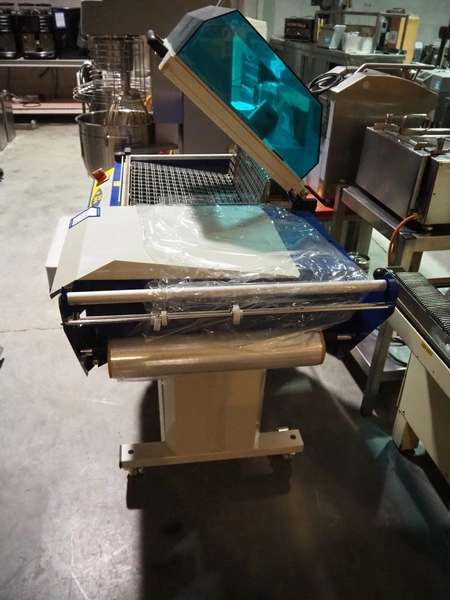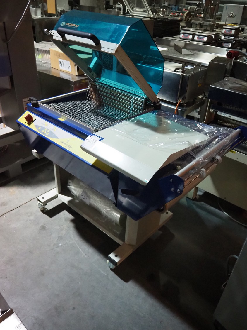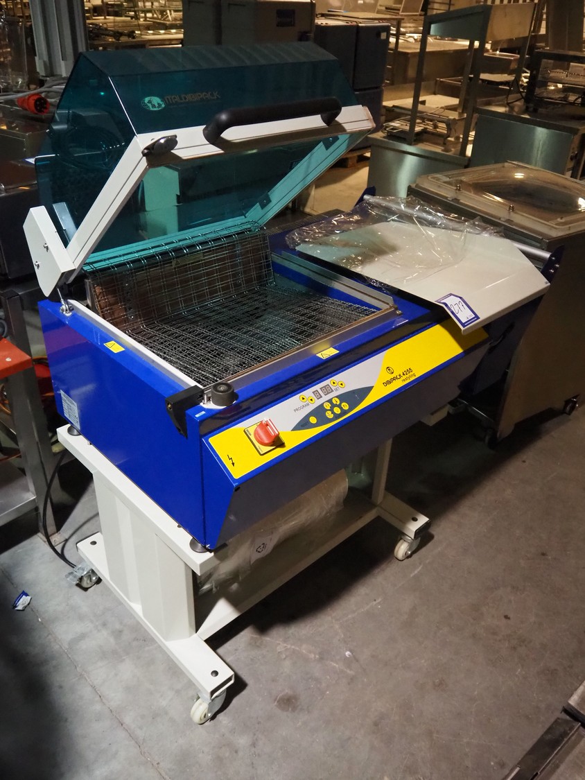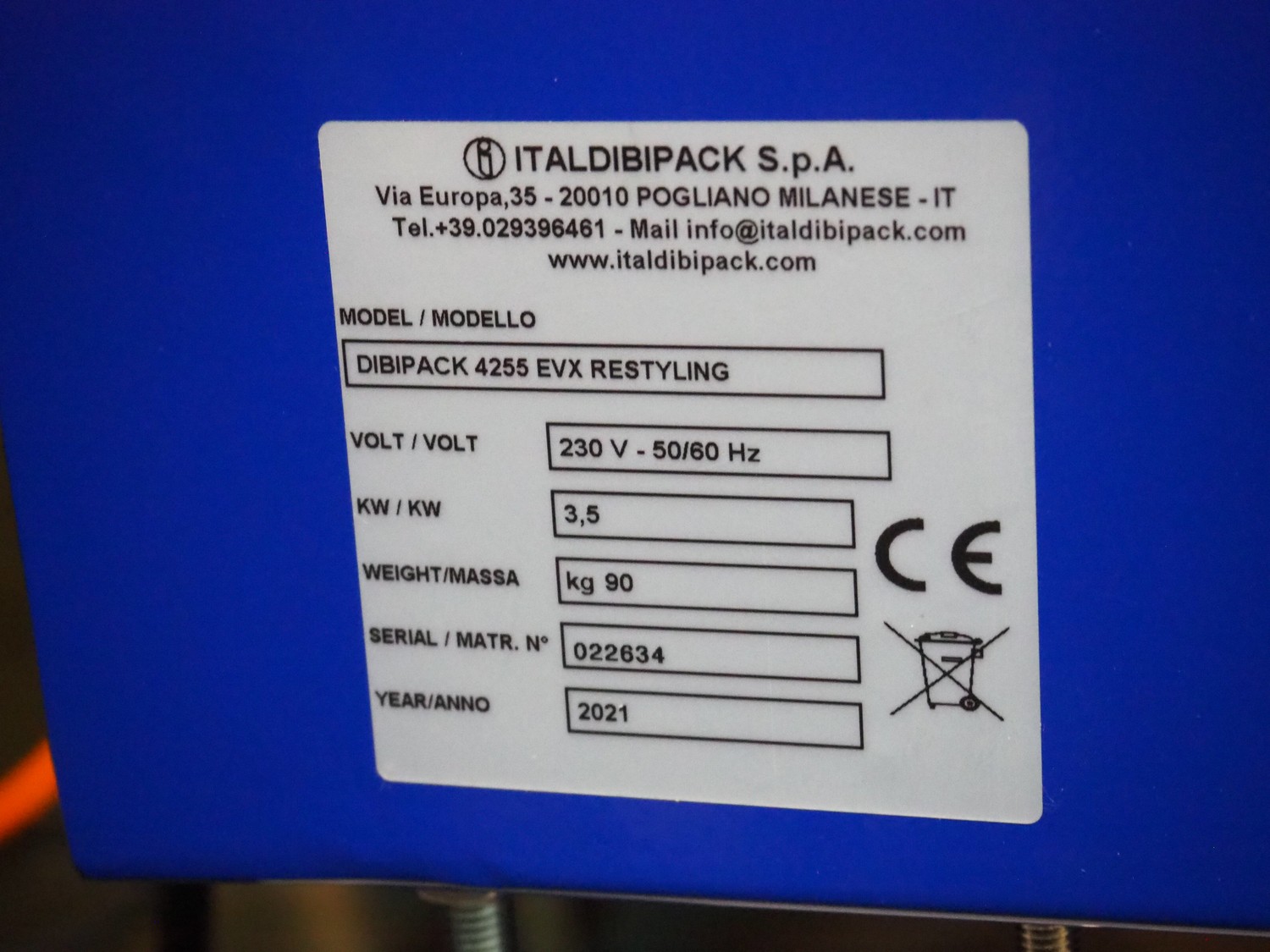 Italdibipack S.p.A. mobile heat-shrinking L-sealer system, model: Dibipack 4255EVX restyling, serial number: 022634, year of construction 2021, 230 V, 50/60 Hz, 3.5 kW, weight: 90 Kg, film width: 515 mm, seal length: 570 mm x 440 mm, total dimensions: 800 mm x 1300 mm x 1500 mm. Including 2 extra film rolls.